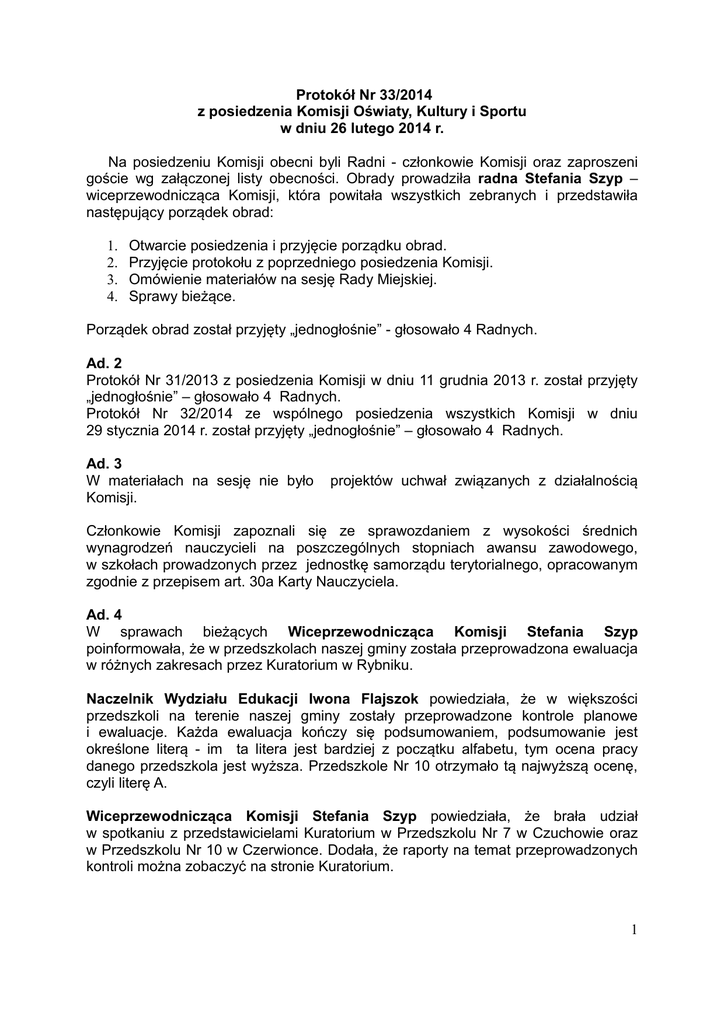 Protokół Nr 33/2014 z posiedzenia Komisji Oświaty, Kultury i Sportu