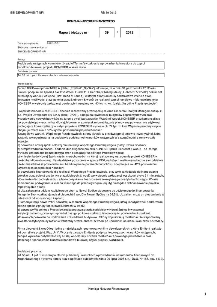 BBI DEVELOPMENT NFI RB 39 2012 KOMISJA NADZORU FINANSOWEGO Raport bieżący nr Data sporządzenia: 39 / 2012 2012-10-31 Skrócona nazwa emitenta BBI DEVELOPMENT NFI Temat Podpisanie wstępnych warunków („Head of Terms”) w zakresie wprowadzenia inwestora do części handlowo-biurowej projektu KONESER w Warszawie. Podstawa prawna Art. 56 ust. 1 pkt 1 Ustawy o ofercie - informacje poufne Treść raportu: Zarząd BBI Development NFI S.A. (dalej: „Emitent”, „Spółka”) informuje, że w dniu 31 października 2012 roku Emitent podpisał ze spółką L&W Investment Fund Ltd. z siedzibą w Nikozji (dalej: „Liebrecht & wooD”) dokument określający warunki wstępne („tzw. Head of Terms), w którym strony określiły podstawowe intencje stron dotyczące możliwości przystąpienia przez Liebrecht & wooD do realizacji części handlowo – biurowej projektu KONESER o wstępnie zakładanej powierzchni wynajmu ok. 43 tys m. kw. (dalej: „Wspólne Przedsięwzięcie”). Projekt developerski KONESER, obecnie realizowany przez spółkę zależną Emitenta Realty 3 Management sp. z o.o. Projekt Developerski 6 S.K.A. (dalej: „PD6”), polega na rewitalizacji budynków poprzemysłowych oraz wybudowaniu nowych budynków na terenie byłej Warszawskiej Wytwórni Wódek KONESER oraz komercjalizacji tak powstałej powierzchni handlowej, biurowej oraz mieszkaniowej (łącznie planowana powierzchnia użytkowa podlegająca komercjalizacji w całym projekcie KONESER wyniesie ok. 74 tys. m kw). Wspólne przedsięwzięcie obejmuje zatem około 58% łącznej powierzchni projektu Koneser. Szczegółowe warunki Wspólnego Przedsięwzięcia strony określą w przedwstępnej umowie inwestycyjnej, która zostanie wynegocjowana na podstawie podpisanych warunków wstępnych W szczególności strony wyraziły intencję: a) powołania nowej spółki celowej dla realizacji Wspólnego Przedsięwzięcia (dalej: „Nowa Spółka”); b) przeprowadzenia procesu badania due diligence projektu KONESER przez Liebrecht & wooD – od którego wyników uzależniona będzie decyzja stron o realizacji Wspólnego Przedsięwzięcia; c) wniesienia do Nowej Spółki części nieruchomości, na której realizowany jest obecnie projekt KONESER w części handlowo-biurowej. Reszta działek pozostanie w spółce PD6, na których realizowana będzie samodzielnie część mieszkalna (z powierzchniami handlowymi na parterach budynków), obejmująca ok. 42% powierzchni użytkowej całości projektu Koneser; d) pozyskania finansowania dla realizacji Wspólnego Przedsięwzięcia, przy czym zakłada się dofinansowanie projektu przez obie strony (w tym przez Liebrecht & wooD we wstępnie zakładanej wysokości około 51 mln złotych, która może ulec podwyższeniu), a także pozyskanie finansowania zewnętrznego (kredytu bankowego). W razie konieczności podwyższenia wkładu własnego do przedsięwzięcia (equity) niezbędne dofinansowanie projektu zapewnią obie strony. e) ukształtowania udziału kapitałowego stron w Nowej Spółce stosownie do udzielonego jej finansowania. Wstępnie Strony zakładają udział Liebrecht & wooD w Nowej Spółce na 36,5%. Udział ten może on ulec zmianie w zależności od wnoszonego kapitału; f) komercjalizacji powierzchni powstałej w ramach Wspólnego Przedsięwzięcia, którą koordynować i nadzorować będzie spółka z grupy kapitałowej Liebrecht & wooD; g) sprzedaży Wspólnego Przedsięwzięcia poprzez sprzedaż udziałów w Nowej Spółce inwestorowi instytucjonalnemu, przy czym sprzedaż nastąpi po komercjalizacji istotnej części powierzchni i uzyskaniu stosownych pozwoleń na użytkowanie i zasiedlenie budynków. Strony dopuszczają możliwość, że wspomniany inwestor instytucjonalny zostanie wskazany przez Liebrecht & wooD po uprzednim ustaleniu warunków sprzedaży. Firma Liebrecht & wooD jest jedną z największych renomowanych firm deweloperskich, z którą Emitent realizuje już pomyślnie projekt „Plac Unii”. W ocenie zarządu Emitenta podpisanie powyższych warunków wstępnych, będące wynikiem dotychczasowej ścisłej współpracy, stwarza możliwości sprawnego prowadzenia oraz stabilnego finansowania kluczowej handlowo-biurowej części projektu KONESER. Podstawa prawna: art. 56 ust. 1 pkt. 1 w ustawy o ofercie publicznej i warunkach wprowadzania instrumentów finansowych do zorganizowanego systemu obrotu oraz o spółkach publicznych z dnia 29 lipca 2005 r. (t.j. Dz.U. Nr 185, poz. 1439). Komisja Nadzoru Finansowego 1 BBI DEVELOPMENT NFI RB 39 2012 BBI Development Narodowy Fundusz Inwestyc yjny SA (pełna nazwa emitenta) BBI DEVELOPMENT NFI Budownictwo (bud) (skróc ona nazwa emitenta) 00-688 (sektor wg. klasyfikacji GPW w W-wie) Warszawa (kod pocztowy) (miejscowość) Emilii Plater 28 (ulica) (numer) 630 33 88 630 33 90 (telefon) (fax) [email protected] www.bbidevelopment.pl (e-mail) (www) 526-10-22-256 010956222 (NIP) (REGON) PODPISY OSÓB REPREZENTUJĄCYCH SPÓŁKĘ Data Imię i Nazwisko Stanowisko/Funkc ja Podpis 2012-10-31 Mic hał Skotnic ki Prezes Zarządu Michał Skotnicki 2012-10-31 Rafał Szczepański Wiceprezes Zarządu Rafał Szc zepański Komisja Nadzoru Finansowego 2