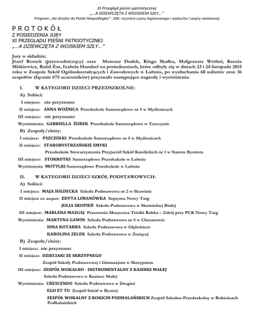 XI Przegląd pieśni patriotycznej „…A DZIEWCZĘTA Z WOJSKIEM SZŁY…” Program „Na drodze do Polski Niepodległej”- 100. rocznica czynu legionowego i wybuchu I wojny światowej PROTOKÓŁ Z POSIEDZENIA JURY XI PRZEGLĄDU PIEŚNI PATRIOTYCZNEJ „…A DZIEWCZĘTA Z WOJSKIEM SZŁY…” Jury w składzie: Józef Romek (przewodniczący) oraz Mateusz Dudek, Kinga Skałka, Małgorzata Wróbel, Ksenia Miśkiewicz, Rafał Żur, Izabela Handzel na posiedzeniach, które odbyły się w dniach 23 i 24 listopada 2015 roku w Zespole Szkół Ogólnokształcących i Zawodowych w Lubniu, po wysłuchaniu 68 solistów oraz 36 zespołów (łącznie 675 uczestników) przyznało następujące nagrody i wyróżnienia: I. W KATEGORII DZIECI PRZEDSZKOLNE: A) Soliści: I miejsce: nie przyznano II miejsce: ANNA WOŹNICA Przedszkole Samorządowe nr 5 w Myślenicach III miejsce: nie przyznano Wyróżnienia: GABRIELLA ŻUREK Przedszkole Samorządowe w Tenczynie B) Zespoły/chóry: I miejsce: PSZCZÓŁKI Przedszkole Samorządowe nr 5 w Myślenicach II miejsce: STAROBYSTRZAŃSKIE SMYKI Przedszkole Stowarzyszenia Przyjaciół Szkół Katolickich nr 1 w Starem Bystrem III miejsce: STOKROTKI Samorządowe Przedszkole w Lubniu Wyróżnienia MOTYLKI Samorządowe Przedszkole w Lubniu II. W KATEGORII DZIECI SZKÓŁ PODSTAWOWYCH: A) Soliści: I miejsce: MAJA SUŁDECKA Szkoła Podstawowa nr 2 w Skawinie II miejsce ex aequo: EDYTA LIMANÓWKA Septyma Nowy Targ JULIA SKUPIEŃ Szkoła Podstawowa w Skomielnej Białej III miejsce: MARLENA MAZGAJ Pracownia Muzyczna Triolki Rabka – Zdrój przy PCK Nowy Targ Wyróżnienia: MARTYNA GAWIN Szkoła Podstawowa nr 5 w Chrzanowie NINA KOTARBA Szkoła Podstawowa w Głębokiem KAROLINA ZELEK Szkoła Podstawowa w Żmiącej B) Zespoły/chóry: I miejsce: nie przyznano II miejsce: DZIECIAKI ZE SKRZYPNEGO Zespół Szkoły Podstawowej i Gimnazjum w Skrzypnem III miejsce: ZESPÓŁ WOKALNO - INSTRUMENTALNY Z KASINKI MAŁEJ Szkoła Podstawowa w Kasince Małej Wyróżnienia: CRESCENDO Szkoła Podstawowa w Drogini EGO ET TU Zespół Szkół w Bystrej ZESPÓŁ WOKALNY Z ROKICIN PODHALAŃSKICH Zespół Szkolno-Przedszkolny w Rokicinach Podhalańskich XI Przegląd pieśni patriotycznej „…A DZIEWCZĘTA Z WOJSKIEM SZŁY…” Program „Na drodze do Polski Niepodległej”- 100. rocznica czynu legionowego i wybuchu I wojny światowej III. W KATEGORII UCZNIOWIE GIMNAZJÓW: A) Soliści: I miejsce: MONIKA KUSIBA Zespół Szkół w Michałowicach II miejsce: KATARZYNA FIEDOR Zespół Szkół w Michałowicach III miejsce ex aequo: PATRYCJA KOTARBA Zespół Szkolno-Gimnazjalny Piwniczna – Zdrój JUSTYNA RUSNARCZYK Gimnazjum w Kasinie Wielkiej Wyróżnienia: I stopnia: JULIA JARZĄBEK Gimnazjum nr 1 w Nowym Targu JUSTYNA KLIMEK Zespół Szkół w Graboszycach KAROLINA SZCZUROWSKA Pracownia Muzyczna Triolki Rabka-Zdrój przy PCK w Nowym Targu II stopnia: PAULINA BRYNIARSKA Gimnazjum nr 1 w Nowym Targu JUSTYNA SKWAREK Gimnazjum w Skomielnej Białej B) Zespoły/chóry: I miejsce: GRUPA PROJEKTOWA-ŻOŁNIERZE NIEZŁOMNI, NIEPOKORNI, WYKLĘCI – PAMIĘTAMY! Publiczne Gimnazjum nr 2 w Brzesku II miejsce ex aequo: TRIOLA Pracownia Muzyczna Triolki Rabka-Zdrój przy PCK w Nowym Targu DOTYK ANIOŁA Gminny Ośrodek Kultury i Sportu – Świetlica Środowiskowa w Trzebuni III miejsce: nie przyznano Wyróżnienia: BUSZMEN Gimnazjum nr 6 w Tarnowie GAUDEAMUS Gimnazjum w Skomielnej Białej IV. W KATEGORII UCZNIOWIE SZKÓŁ PONADGIMNAZJALNYCH: A) Soliści: I miejsce: HONORATA BURTAN - I Liceum Ogólnokształcące w Myślenicach II miejsce: nie przyznano III miejsce: KRYSTIAN KUBOWICZ Zespół Szkół Techniczno-Informatycznych w Mszanie Dolnej Wyróżnienia: nie przyznano B) Zespoły/chóry: I miejsce: SKRZYPNIANKI Zespół Szkoły Podstawowej i Gimnazjum w Skrzypnem II miejsce: nie przyznano III miejsce: KWARTET z Myślenic WERONIKA LEŃCZOWSKA/MARZENA ZLEZARCZYK Zespół Szkół Ogólnokształcących im. T. Kościuszki w Myślenicach Wyróżnienia: nie przyznano XI Przegląd pieśni patriotycznej „…A DZIEWCZĘTA Z WOJSKIEM SZŁY…” Program „Na drodze do Polski Niepodległej”- 100. rocznica czynu legionowego i wybuchu I wojny światowej V. Grand Prix XI Przeglądu pieśni patriotycznej „…a dziewczęta z wojskiem szły…”: ZESPÓŁ WOKALNY z MICHAŁOWIC Zespół Szkół w Michałowicach VI. Jury XI Przeglądu pieśni patriotycznej „ … a dziewczęta z wojskiem szły…” postanowiło wyróżnić następujących instruktorów: A) za kompozycję autorską oraz profesjonalizm wykonania - Pana ROBERTA BUDZYNIA - Pana ROBERTA BYLICĘ B) za wysoki poziom artystyczny przygotowywanych przez nich zespołów i solistów - Panią MAGDALENĘ PASTERZ - Panią ELŻBIETĘ OKARMĘ - Panią BEATĘ KUCZMAŃSKĄ C) za profesjonalne przygotowanie zespołów i solistów - Panią MARIĘ MROWCZYK - Panią KATARZYNĘ JABCOŃ - Panią MONIKĘ PECIAK - Pana MARKA KIJANKĘ. Jury pragnie zaznaczyć, iż poziom przesłuchań konkursowych był niezwykle wysoki, gratuluje więc wszystkim laureatom i finalistom niezwykłej wrażliwości muzycznej oraz umiejętności twórczej interpretacji tradycyjnych oraz współczesnych polskich pieśni patriotycznych. Na tym protokół zakończono. JURY Lubień, 24 listopada 2015 roku XI Przegląd pieśni patriotycznej „…A DZIEWCZĘTA Z WOJSKIEM SZŁY…” Program „Na drodze do Polski Niepodległej”- 100. rocznica czynu legionowego i wybuchu I wojny światowej Zgodnie z Regulaminem XI Przeglądu pieśni patriotycznej „…a dziewczęta z wojskiem szły…” Komisja Wojewódzka przyznała również tytuły LAUREATA oraz FINALISTY. TYTUŁ LAUREATA otrzymują: ANNA WOŹNICA - Przedszkole Samorządowe nr 5 w Myślenicach, PSZCZÓŁKI - Przedszkole Samorządowe nr 5 w Myślenicach, MAJA SUŁDECKA - Szkoła Podstawowa nr 2 w Skawinie, EDYTA LIMANÓWKA - Septyma Nowy Targ, JULIA SKUPIEŃ - Szkoła Podstawowa w Skomielnej Białej, DZIECIAKI ZE SKRZYPNEGO - Zespół Szkoły Podstawow