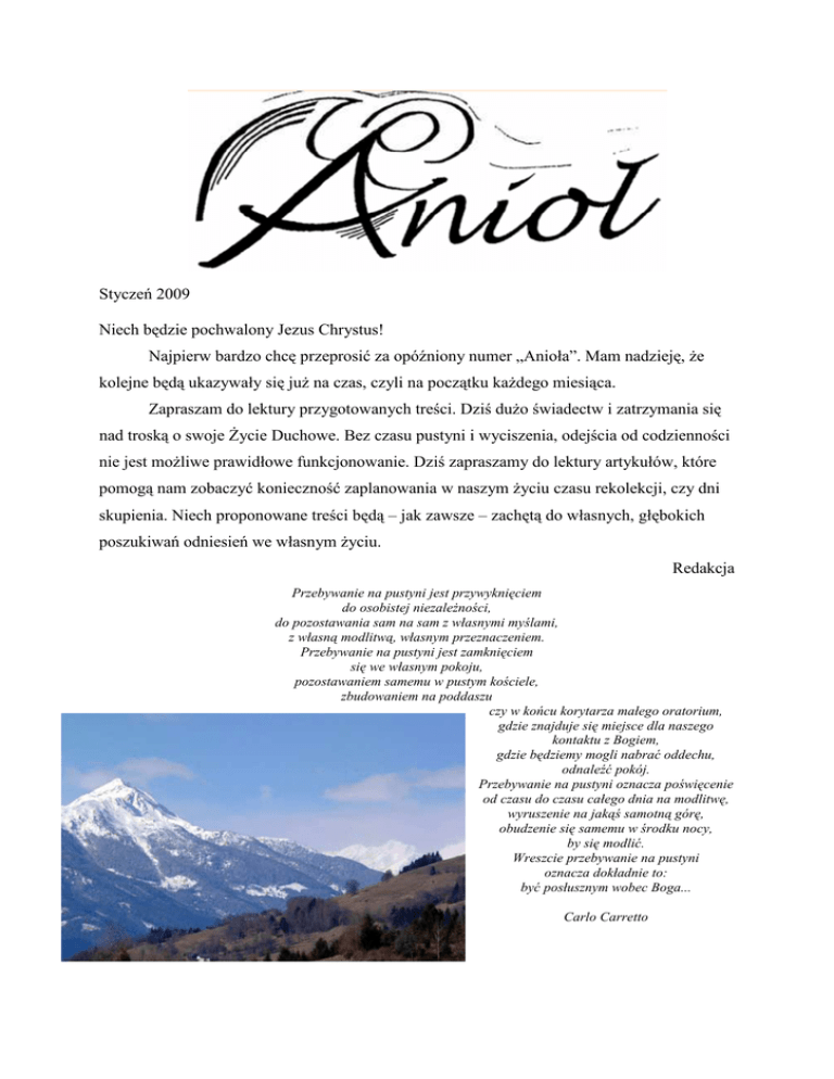Styczeń 2009 Niech będzie pochwalony Jezus Chrystus! Najpierw bardzo chcę przeprosić za opóźniony numer „Anioła”. Mam nadzieję, Ŝe kolejne będą ukazywały się juŜ na czas, czyli na początku kaŜdego miesiąca. Zapraszam do lektury przygotowanych treści. Dziś duŜo świadectw i zatrzymania się nad troską o swoje śycie Duchowe. Bez czasu pustyni i wyciszenia, odejścia od codzienności nie jest moŜliwe prawidłowe funkcjonowanie. Dziś zapraszamy do lektury artykułów, które pomogą nam zobaczyć konieczność zaplanowania w naszym Ŝyciu czasu rekolekcji, czy dni skupienia. Niech proponowane treści będą – jak zawsze – zachętą do własnych, głębokich poszukiwań odniesień we własnym Ŝyciu. Redakcja Przebywanie na pustyni jest przywyknięciem do osobistej niezaleŜności, do pozostawania sam na sam z własnymi myślami, z własną modlitwą, własnym przeznaczeniem. Przebywanie na pustyni jest zamknięciem się we własnym pokoju, pozostawaniem samemu w pustym kościele, zbudowaniem na poddaszu czy w końcu korytarza małego oratorium, gdzie znajduje się miejsce dla naszego kontaktu z Bogiem, gdzie będziemy mogli nabrać oddechu, odnaleźć pokój. Przebywanie na pustyni oznacza poświęcenie od czasu do czasu całego dnia na modlitwę, wyruszenie na jakąś samotną górę, obudzenie się samemu w środku nocy, by się modlić. Wreszcie przebywanie na pustyni oznacza dokładnie to: być posłusznym wobec Boga... Carlo Carretto W tych dniach skupienia Jezus przemówił naprawdę do mnie, ja teraz wiem, Ŝe nikt mnie tak nie kocha jak On. Ja zrozumiałam, Ŝe Ŝycie bez Jezusa jest bardzo smutne. Co by nie stało się w moim Ŝyciu wiem, Ŝe Jezus będzie zawsze ze mną. Zrozumiałam dopiero teraz, ze Jezus jest najwaŜniejszy w moim Ŝyciu. Alina Wysoczyńska W Bogu KtóŜ nas moŜe odłączyć od miłości Chrystusa? Utrapienie, ucisk czy prześladowanie, głód czy nagość, niebezpieczeństwo czy miecz? Ale we wszystkim tym odnosimy pełne zwycięstwo dzięki Temu, który nas umiłował (Rz 8, 35.37). Nie istnieje Ŝadna zewnętrzna rzecz, która moŜe mnie odłączyć od Ciebie BoŜe. Tak! Jedyne co moŜe mnie od Ciebie odłączyć to moja własna decyzja, to decyzja mego serca. Ale Ŝadna rzecz sama w sobie nie ma tej magicznej siły, która by sprawiła w sposób automatyczny odłączenie mnie od Ciebie. Pracuję, wykonuję codziennie mnóstwo róŜnych czynności. I gdzieś pośród całej mojej aktywności przychodzi do mnie ta jedna myśl: sukcesem jest to, abym pozostał Tobie wierny, abym pozostał z Tobą w łączności, abym po prostu był w Tobie. Czuję się zaskoczony tą myślą, bo przecieŜ do tej pory wiele innych rzeczy było dla mnie sukcesem. Nawet zwykłe wywiązanie się z zaplanowanej przez siebie pracy lub z czegoś, co obiecałem innym. O tak, to jest sukces! JakŜe często u schyłku dnia oceniam jego wartość przez pryzmat tego, co zdziałałem, czego się nauczyłem, co zrozumiałem, co osiągnąłem. CóŜ z tego, Ŝe człowiek cały świat zyska jeśli na swej duszy szkodę poniesie. Czym jest ta szkoda? Odłączeniem się od Ciebie, Panie. A przecieŜ tyle razy modliłem się: Nie daj mi odłączyć się od Ciebie nie rozumiejąc znaczenia tych słów. Mogę dokonywać wielkich dzieł w moim Ŝyciu, ale jeśli zabraknie miłości? Jeśli jej zabraknie, to odpadnę od Ciebie i będę wszystko widział ze swojej perspektywy. JuŜ nie tak, jak Ty patrzysz na mnie, ale jak ja patrzę na siebie i na innych. A jeśli brakuje mi miłości to jest to zawsze patrzenie niepełne, ludzkie a nie BoŜe. CóŜ moŜe mnie zatem odłączyć od Twojej miłości skoro Ŝadna rzecz stworzona nie moŜe tego dokonać? Tylko ja sam mogę podjąć w sobie taką decyzję. I w rzeczywistości podejmuję ją za kaŜdym razem, gdy rezygnuję z prostoty bycia i gdy wpadam w złoŜoność pychy: chęci bycia kimś innym niŜ naprawdę jestem. Kimś lepszym, kimś waŜniejszym, kimś piękniejszym, kimś bardziej... Patrzę na Ciebie rozciągniętego na krzyŜu i zaczynam rozumieć, Ŝe św. Paweł kiedy pytał się siebie cóŜ nas moŜe odłączyć od Twojej miłości, to patrzył właśnie na Ciebie ukrzyŜowanego. Bo właśnie na KrzyŜu nie pozwoliłeś, aby utrapienie, ucisk czy prześladowanie, głód czy nagość, niebezpieczeństwo czy miecz odłączyły Cię od Ojca. Nie! Trwając w cierpieniu i prześladowaniu odniosłeś pełne zwycięstwo. Twoje serce pozostało czyste, zjednoczone z Ojcem i współczujące dla nas, współczujące wszystkim ludziom, nawet swoim oprawcom. Wiem, Ŝe zapraszasz mnie, abym Cię naśladował, abym poszedł za Tobą. Wiem, Ŝe udzielisz mi sił, udzielisz mi łaski płynącej z KrzyŜa. Nie czuję się ani silny ani mocny. Wręcz przeciwnie! Ale tak jak Maryja nie pytam czy to się stanie. Pytam: jak to się stanie? Źródło tekstu: http://www.eccc.pl/p/czytelnia/czytelnia-rozwazania-70.html Podstawowe informacje o rekolekcjach. Poradnik dla poszukujących i wątpiących Jak jechać, Ŝeby dojechać na najlepsze dla siebie rekolekcje? śeby pozbierać do kupy swoje Ŝycie, poczuć jego sens i radość. Oto kilka prostych rad. 1. Kiedy jechać na rekolekcje? Symptomy mogą być co najmniej trzy. Po pierwsze, gdy czasami stając przed lustrem mamy wraŜenie, Ŝe człowiek, na którego spoglądamy nie jest juŜ tym miłym gościem sprzed lat i zaczynamy czuć do niego pogardę. Po drugie, gdy spoglądając na kolegów, przyjaciół, którzy stale czegoś od nas chcą, czujemy zmęczenie i zaczynamy marzyć o innym, lepszym Ŝyciu. Po trzecie, gdy spoglądamy w lustro i widzimy zadowolonego z siebie gościa, któremu wszystko się udaje, Ŝyje w kochającej rodzinie, uczy się dobrze albo ma świetną i rozwijającą pracę, wygodne mieszkanie w centrum i domek letni w Jastrzębiej Górze, samochód i konto w szwajcarskim banku lub przynajmniej jedną z tych rzeczy. W tych trzech przypadkach wyjazd na reko