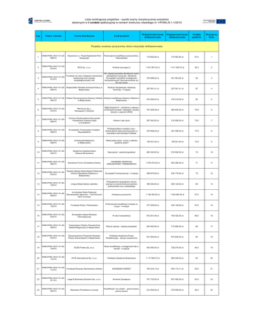 Lista rankingowa projektów - wyniki oceny merytorycznej wniosków złoŜonych w I rundzie aplikacyjnej w ramach konkursu otwartego nr 1/POKL/8.1.1/2010 L.p. Numer wniosku Nazwa beneficjenta Tytuł projektu Wnioskowana kwota dofinansowania Proponowana kwota dofinansowania Średnia punktów Pozycja na liście Projekty ocenione pozytywnie, które otrzymały dofianasowanie 1 WND-POKL.08.01.01-20099/10 Cityschool s.c. Paweł Kędzierski Piotr Kossowski Podnoszenie kwalifikacji pracowników Telemarketer 719 582,90 zł 719 582,90 zł 97,5 1 2 WND-POKL.08.01.01-20012/10 RCS Sp. z o.o. Kobieta pracująca 2 1 051 897,30 zł 1 011 983,70 zł 92,5 2 3 WND-POKL.08.01.01-20013/10 Fundacja na rzecz integracji zawodowej, społecznej oraz rozwoju przedsiębiorczości VIA 50 i więcej powodów dla których warto obsługiwacć komputer. Szkolenia "Europejski Certyfikat Umiejętności Komputerowych" dla pracowników po 50 roku Ŝycia 279 486,00 zł 241 943,00 zł 92 3 4 WND-POKL.08.01.01-20- Wojewódzki Ośrodek Animacji Kultury w 090/10 Białymstoku Studium Socjoterapii i Edukacji Twórczej - V edycja 297 951,41 zł 297 951,41 zł 87 4 5 WND-POKL.08.01.01-20- Polskie Stowarzyszenie Dekarzy Oddział WyŜsze kwalifikacje Dekarzy Oddział w 040/10 w Białymstoku Białymstoku 915 065,00 zł 734 515,00 zł 82 5 6 WND-POKL.08.01.01-20010/10 PM Group Sp. j. Panasewicz, Zubrycki D@ta Explorer II - szkolenia z zakresu prowadzenia badań, statystyki i analizy danych z uŜyciem SPSS 761 659,48 zł 560 630,00 zł 79,5 6 7 WND-POKL.08.01.01-20062/10 Centrum Doskonalenia Nauczycieli i Kształcenia Ustawicznego w Suwałkach Aktywni całe Ŝycie 287 940,00 zł 216 990,00 zł 79,5 7 8 WND-POKL.08.01.01-20008/10 Europejskie Towarzystwo Inicjatyw Obywatelskich Profesjonalista w kaŜdym calu doskonalenie kadr pracowniczych w powaitach zachodniego Podlasia 470 556,40 zł 461 556,40 zł 77,5 8 9 WND-POKL.08.01.01-20059/10 Uniwersytet Medyczny w Białymstoku "Dieta pełna Ŝycia - kursy z zakresu Ŝywienia dzieci" 169 421,64 zł 156 621,64 zł 72,5 9 10 WND-POKL.08.01.01-20003/10 Akademia Szybkiej Nauki Tadeusz Buzarewicz Nauczyciel - zawód przyszłości 683 340,00 zł 519 540,00 zł 72 10 11 WND-POKL.08.01.01-20065/10 Narodowe Forum Doradztwa Kariery AKADEMIA ROZWOJU UMIEJĘTNOŚCI TRENERSKICH 1 076 574,00 zł 823 282,00 zł 71 11 12 WND-POKL.08.01.01-20072/10 WyŜsza Szkoła Administracji Publicznej imienia Stanisława Staszica w Białysmtoku Europejski Funkcjonariusz - II edycja 586 870,65 zł 532 770,50 zł 70 12 13 WND-POKL.08.01.01-20125/10 Lingua Edyta Sylwia Jasińska Posługiwanie się językiem obcym szansą na wzrost konkurencyjności pracowników woj. podlaskiego 499 320,00 zł 380 120,00 zł 69 13 14 ŁomŜyńska Rada Federacji WND-POKL.08.01.01-20Stowarzyszeń Naukowo - Technicznych 049/10 NOT w ŁomŜy Kreatywny pracownik 1 199 360,00 zł 1 093 960,00 zł 67,5 14 15 WND-POKL.08.01.01-20122/10 Fundacja Prawo i Partnerstwo Podnoszenie kwalifikacji receptą na kryzys - II edycja 377 355,00 zł 335 155,00 zł 67,5 15 16 WND-POKL.08.01.01-20033/10 Europejski Instytut Edukacji Informatycznej W sieci kompetencji 872 931,84 zł 746 420,00 zł 66,5 16 17 WND-POKL.08.01.01-20056/10 Towarzystwo Wiedzy Powszechnej Oddział Regionalny w Białymstoku Równe szanse - lepsza przyszłość 843 940,00 zł 715 660,00 zł 66 17 18 WND-POKL.08.01.01-20079/10 Stowarzyszenie Przyjaciół Wydziału Prawa Uniwerstytetu w Białymstoku Podlaska Akademia Prawa Podatkowego - edycja rozszerzona 931 600,00 zł 673 600,00 zł 65 18 19 WND-POKL.08.01.01-20104/10 ECDS Polska Sp. zo.o. Nowe kwalifikacje i umiejętności dla ehandlu - II edycja 840 590,00 zł 728 270,00 zł 64,5 19 20 WND-POKL.08.01.01-20110/10 WYG International Sp. z o.o. Podlaska Akademia Budowlana 1 117 658,72 zł 906 400,00 zł 64 20 21 WND-POKL.08.01.01-20Fundacja Rozwoju Demokracji Lokalnej 112/10 AKADEMIA WIEDZY 790 334,10 zł 593 174,11 zł 63,5 21 22 WND-POKL.08.01.01-20071/10 Legal & Business Solutions Sp. z o.o. Kontrola Zarządcza 791 720,00 zł 657 460,00 zł 63,5 22 23 WND-POKL.08.01.01-20054/10 Starostwo Powiatowe w ŁomŜy Kwalifikacje "na czasie" - pewna praca, pewny awans 512 500,00 zł 379 550,00 zł 62,5 23 L.p. Numer wniosku Nazwa beneficjenta Tytuł projektu Wnioskowana kwota dofinansowania Proponowana kwota dofinansowania Średnia punktów Pozycja na liście Projekty ocenione negatywnie, nierekomendowane do dofinansowania Projekty ocenione negatywnie, nierekomendowane do dofianasowania z powodu nieuzyskania wymaganych 60% punktów w co najmniej jednej pozycji wniosku 24 WND-POKL.08.01.01-20005/10 DGA Human Capital Management Sp. zo.o. AKADEMIA TRENERA. Kompleksowy program szkoleń dla osob pracujących 581 196,00 zł 0,00 zł 78,5 24 25 WND-POKL.08.01.01-20070/10 TOMRAD Niepubliczny Ośrodek Kształcenia Ustawicznego Uprawnienia zawodowe dla pracowników branŜy budowlanej 1 194 882,00 zł 0,00 zł 74,5 25 26 Centrum Edukacji WND-POKL.08.01.01-20ATUT - WSCHÓD s.c. Jarosław 145/10 Jastrzębski, Krystyna Tischner, Ireneusz Tracz Inwestujemy w kompetencje kluczowe pracowników 279 743,46 zł 0,00 zł 74,5 26 27 WND-POKL.08.01.01-20060/10 Melting Pot - Piotr Kossowski HANDLOWO - BIUROWA KADRA 50+ 881 548,00 zł 0,00 zł 72 27 28 WND-POKL.08.01.01-20042/10 Stowarzyszenie Przedsiębiorczości w Nieruchmościach Podlaska Akademia Nieruchmości 299 600,00 zł 0,00 zł 71,5 28 29 WND-POKL.08.01.01-20094/10 EC Euro Consulting Sp. z o.o. Księgowy projektów współfinansowanych ze środkó UE 232 000,00 zł 0,00 zł 71 29 30 Rysunke Twoją Perspektywą. Kurs WND-POKL.08.01.01-20- Atelier Klimowicz ElŜbieta Orzechowska rysunku i projektowania dla pracujących 032/10 Klimowicz mieszkańców Podlasia 1 049 174,00 zł 0,00 zł 70 30 31 WND-POKL.08.01.01-20053/10 Wiek i wiedza - szkolenia doskonalące dla osób po 50 roku Ŝycia 1 175 813,16 zł 0,00 zł 69,5 31 32 WND-POKL.08.01.01-20Centrum Rozwiązań MenedŜerskich S.A. 009/10 PRINCE2 dla pracowników Podlasia podni
