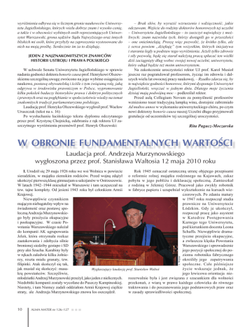 wyróżnienia odbywa się w licznym gronie naukowców Uniwersytetu Jagiellońskiego, których wielu dobrze znam i wysoko cenię, a także i w obecności wybitnych osób reprezentujących Uniwersytet Warszawski, grona sędziów Sądu Najwyższego oraz innych bliskich mi osób, które przybyły na zaproszenia wystosowane do nich na moją prośbę. Serdecznie im za to dziękuję. JEDEN Z NAJZNAKOMITSZYCH ZNAWCÓW HISTORII USTROJU I PRAWA POLSKIEGO W uchwale Senatu Uniwersytetu Jagiellońskiego w sprawie nadania godności doktora honoris causa prof. Henrykowi Olszewskiemu szczególną uwagę zwrócono na jego wybitne osiągnięcia naukowe, postawę obywatelską i ściśle z tym związaną rolę, jaką odgrywa w środowisku prawniczym w Polsce, wypromowanie kilku pokoleń badaczy historyków prawa i doktryn politycznych i prawnych oraz na pogłębianie w społeczeństwie wiedzy na temat znakomitych tradycji parlamentaryzmu polskiego. Laudację prof. Henryka Olszewskiego wygłosił prof. Wacław Uruszczak (tekst na s. 16) Po wysłuchaniu łacińskiego tekstu dyplomu odczytanego przez prof. Krystynę Chojnicką, odebraniu z rąk rektora UJ zaszczytnego wyróżnienia przemówił prof. Henryk Olszewski: – Brak słów, by wyrazić wzruszenie i wdzięczność, jakie odczuwam. Wejście do rodziny doktorów honorowych tej uczelni – Uniwersytetu Jagiellońskiego – to zaszczyt największy z możliwych; znam nazwiska tych, którzy dostąpili go w przeszłości – one onieśmielają. Proszę więc pozwolić, że krótko tylko, ale z serca powiem „dziękuję” tym wszystkim, których inicjatywa i starania legły u podstaw tego wyróżnienia. Jeżeli tylko zdrowie i siły pozwolą, będę się starał należytą pracą spłacać ten wielki dziś zaciągnięty dług wobec swojej nowej uczelni, uniwersytetu, który odtąd będzie też moim uniwersytetem. Na zakończenie uroczystości rektor UJ prof. Karol Musioł jeszcze raz pogratulował profesorom, życząc im zdrowia i dalszych wielu lat owocnej pracy naukowej. – Rzadko zdarza się, by te największe godności honorowe, którymi dysponuje Uniwersytet Jagielloński, wręczać w jednym dniu. Dlatego moje życzenia dzisiaj mają podwójną moc – podkreślał rektor. Przed aulą Collegium Novum za pomyślność profesorów wzniesiono toast tradycyjną lampką wina, dostojnie zabrzmiało Ad multos annos w wykonaniu uniwersyteckiego chóru, po czym nowi doktorzy honoris causa naszej Uczelni długo przyjmowali gratulacje od uczestników tej szczególnej uroczystości. Rita Pagacz-Moczarska W OBRONIE FUNDAMENTALNYCH WARTOŚCI Laudacja prof. Andrzeja Murzynowskiego wygłoszona przez prof. Stanisława Waltosia 12 maja 2010 roku A. Wojnar I. Urodził się 29 maja 1926 roku we wsi Wolnica w powiecie Rok 1945 oznaczał ostateczną utratę objętego przepisami sieradzkim, w majątku ziemskim rodziców. Przed wojną zdążył o reformie rolnej majątku rodzinnego na Kujawach, zakaz ukończyć pierwszą klasę gimnazjum u salezjanów w Ostrzeszowie. pobytu w jego pobliżu i deklasację społeczną. Zamieszkał W latach 1942–1944 mieszkał w Warszawie i tam uczęszczał na z rodziną w Jeleniej Górze. Pracował jako zwykły robotnik tzw. tajne komplety. Od jesieni 1943 roku był członkiem Armii w fabryce papieru i uzupełniał wykształcenie na kursach wieKrajowej. czorowych. Po zdaniu matury Niewątpliwie czynnikiem w 1947 roku rozpoczął studia mającym niebagatelny wpływ na prawnicze na Uniwersytecie świadomość oraz postawę spoŁódzkim. Gdy je ukończył, łeczną Andrzeja Murzynowskierozpoczął pracę jako asystent go były przeżycia okupacyjne w Katedrze Postępowania i pookupacyjne. W czasie PoKarnego tego Uniwersytetu, wstania Warszawskiego należał pod kierunkiem docenta Leona do kompanii AK ugrupowania Schaffa. Niewątpliwie dramaJeleń, która otrzymała rozkaz tyczne przejścia okupacyjne, zaatakowania i zdobycia silnie a zwłaszcza klęska Powstania bronionej siedziby gestapo i SD Warszawskiego i sprowadzenie przy alei Szucha. Karabiny były jego pozycji społecznej do pow rękach zaledwie kilku żołnieziomu robotnika fabrycznego rzy, reszta miała granaty, tzw. określiły jego zapatrywania filipinki. Atak skończył się tak, społeczne. Całe późniejsze jak musiał się skończyć: masażycie wskazuje jednak, że Wygłaszający laudację prof. Stanisław Waltoś krą powstańców. Szczęśliwie, jego lewicowa orientacja niemłodziutki Andrzej Murzynowski przeżył, jako jeden z nielicznych. rozerwalnie była i jest związana z szacunkiem dla wolności Niedobitki kompanii zostały wycofane do Puszczy Kampinoskiej. przekonań, z wiarą w prawo każdego człowieka do równego Niestety, i tam Niemcy zadali oddziałom Armii Krajowej ciężkie traktowania i do poszanowania jego podstawowych praw oraz straty, ale Andrzeja Murzynowskiego znowu los oszczędził. w zasady sprawiedliwości społecznej. 10 ALMA MATER nr 126–127 A. Wojnar II. W 1953 roku został służbowo przeniesiony do Katedry naukowych w Polsce oraz za granicą, 15 artykułów polemicznych, Postępowania Karnego Uniwersytetu Warszawskiego, gdzie praco- 62 glos do orzeczeń Sądu Najwyższego. Według stanu na początek wał do przejścia na emeryturę w 1996 roku. W 1960 roku uzyskał roku 2009 ma na swym koncie 225 publikacji naukowych, nie stopień naukowy doktora nauk prawnych, a w 1965 roku, po habili- licząc wywiadów i publikacji w dziennikach. tacji, został docentem Uniwersytetu Warszawskiego. W 1978 roku Przez jego twórczość naukową przewija się przeciwstawianie otrzymał tytuł naukowy profesora nadzwyczajnego. Tytuł naukowy się traktowaniu tymczasowego aresztowania jako środka represyjprofesora zwyczajnego zaś dopiero w 1988 roku. Czekał więc na nego, antycypującego orzeczenie i wykonanie kary pozbawienia oba tytuły długo, w odpowiedniej proporcji do postępowania zgod- wolności. Nutę tę można znaleźć już w jego pierwszym artykule –