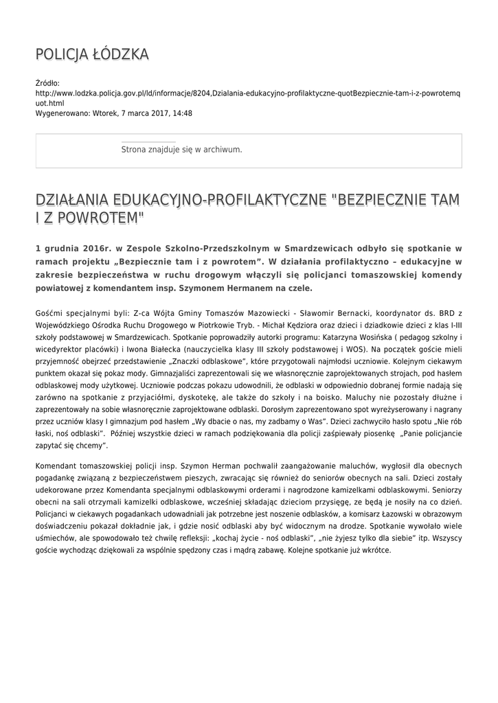 POLICJA ŁÓDZKA Źródło: http://www.lodzka.policja.gov.pl/ld/informacje/8204,Dzialania-edukacyjno-profilaktyczne-quotBezpiecznie-tam-i-z-powrotemq uot.html Wygenerowano: Wtorek, 7 marca 2017, 14:48 Strona znajduje się w archiwum. DZIAŁANIA EDUKACYJNO-PROFILAKTYCZNE "BEZPIECZNIE TAM I Z POWROTEM" 1 grudnia 2016r. w Zespole Szkolno-Przedszkolnym w Smardzewicach odbyło się spotkanie w ramach projektu „Bezpiecznie tam i z powrotem”. W działania profilaktyczno – edukacyjne w zakresie bezpieczeństwa w ruchu drogowym włączyli się policjanci tomaszowskiej komendy powiatowej z komendantem insp. Szymonem Hermanem na czele. Gośćmi specjalnymi byli: Z-ca Wójta Gminy Tomaszów Mazowiecki - Sławomir Bernacki, koordynator ds. BRD z Wojewódzkiego Ośrodka Ruchu Drogowego w Piotrkowie Tryb. - Michał Kędziora oraz dzieci i dziadkowie dzieci z klas I-III szkoły podstawowej w Smardzewicach. Spotkanie poprowadziły autorki programu: Katarzyna Wosińska ( pedagog szkolny i wicedyrektor placówki) i Iwona Białecka (nauczycielka klasy III szkoły podstawowej i WOS). Na początek goście mieli przyjemność obejrzeć przedstawienie „Znaczki odblaskowe”, które przygotowali najmłodsi uczniowie. Kolejnym ciekawym punktem okazał się pokaz mody. Gimnazjaliści zaprezentowali się we własnoręcznie zaprojektowanych strojach, pod hasłem odblaskowej mody użytkowej. Uczniowie podczas pokazu udowodnili, że odblaski w odpowiednio dobranej formie nadają się zarówno na spotkanie z przyjaciółmi, dyskotekę, ale także do szkoły i na boisko. Maluchy nie pozostały dłużne i zaprezentowały na sobie własnoręcznie zaprojektowane odblaski. Dorosłym zaprezentowano spot wyreżyserowany i nagrany przez uczniów klasy I gimnazjum pod hasłem „Wy dbacie o nas, my zadbamy o Was”. Dzieci zachwyciło hasło spotu „Nie rób łaski, noś odblaski”. Później wszystkie dzieci w ramach podziękowania dla policji zaśpiewały piosenkę „Panie policjancie zapytać się chcemy”. Komendant tomaszowskiej policji insp. Szymon Herman pochwalił zaangażowanie maluchów, wygłosił dla obecnych pogadankę związaną z bezpieczeństwem pieszych, zwracając się również do seniorów obecnych na sali. Dzieci zostały udekorowane przez Komendanta specjalnymi odblaskowymi orderami i nagrodzone kamizelkami odblaskowymi. Seniorzy obecni na sali otrzymali kamizelki odblaskowe, wcześniej składając dzieciom przysięgę, ze będą je nosiły na co dzień. Policjanci w ciekawych pogadankach udowadniali jak potrzebne jest noszenie odblasków, a komisarz Łazowski w obrazowym doświadczeniu pokazał dokładnie jak, i gdzie nosić odblaski aby być widocznym na drodze. Spotkanie wywołało wiele uśmiechów, ale spowodowało też chwilę refleksji: „kochaj życie - noś odblaski”, „nie żyjesz tylko dla siebie” itp. Wszyscy goście wychodząc dziękowali za wspólnie spędzony czas i mądrą zabawę. Kolejne spotkanie już wkrótce. spotkanie z dziećmi pokaz mody odblaskowej spotkanie z dziećmi spotkanie z dziećmi spotkanie z dziećmi spotkanie z dziećmi spotkanie z dziećmi spotkanie z dziećmi pamiątkowa fotografia Ocena: 5/5 (2) Tweetnij prewencja