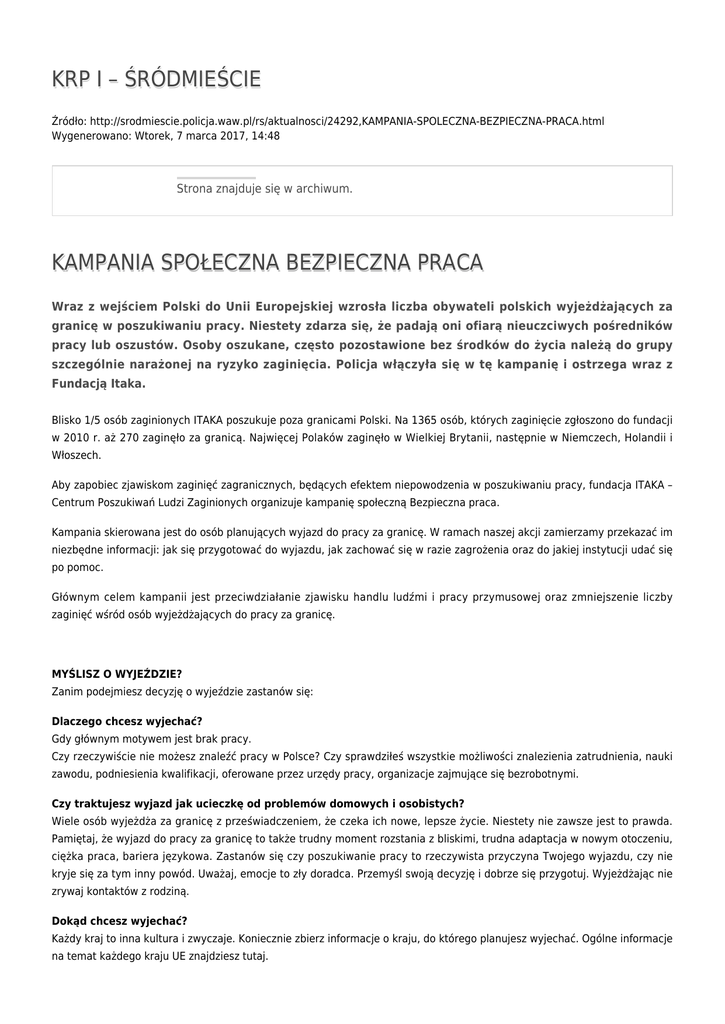 KRP I – ŚRÓDMIEŚCIE Źródło: http://srodmiescie.policja.waw.pl/rs/aktualnosci/24292,KAMPANIA-SPOLECZNA-BEZPIECZNA-PRACA.html Wygenerowano: Wtorek, 7 marca 2017, 14:48 Strona znajduje się w archiwum. KAMPANIA SPOŁECZNA BEZPIECZNA PRACA Wraz z wejściem Polski do Unii Europejskiej wzrosła liczba obywateli polskich wyjeżdżających za granicę w poszukiwaniu pracy. Niestety zdarza się, że padają oni ofiarą nieuczciwych pośredników pracy lub oszustów. Osoby oszukane, często pozostawione bez środków do życia należą do grupy szczególnie narażonej na ryzyko zaginięcia. Policja włączyła się w tę kampanię i ostrzega wraz z Fundacją Itaka. Blisko 1/5 osób zaginionych ITAKA poszukuje poza granicami Polski. Na 1365 osób, których zaginięcie zgłoszono do fundacji w 2010 r. aż 270 zaginęło za granicą. Najwięcej Polaków zaginęło w Wielkiej Brytanii, następnie w Niemczech, Holandii i Włoszech. Aby zapobiec zjawiskom zaginięć zagranicznych, będących efektem niepowodzenia w poszukiwaniu pracy, fundacja ITAKA – Centrum Poszukiwań Ludzi Zaginionych organizuje kampanię społeczną Bezpieczna praca. Kampania skierowana jest do osób planujących wyjazd do pracy za granicę. W ramach naszej akcji zamierzamy przekazać im niezbędne informacji: jak się przygotować do wyjazdu, jak zachować się w razie zagrożenia oraz do jakiej instytucji udać się po pomoc. Głównym celem kampanii jest przeciwdziałanie zjawisku handlu ludźmi i pracy przymusowej oraz zmniejszenie liczby zaginięć wśród osób wyjeżdżających do pracy za granicę. MYŚLISZ O WYJEŹDZIE? Zanim podejmiesz decyzję o wyjeździe zastanów się: Dlaczego chcesz wyjechać? Gdy głównym motywem jest brak pracy. Czy rzeczywiście nie możesz znaleźć pracy w Polsce? Czy sprawdziłeś wszystkie możliwości znalezienia zatrudnienia, nauki zawodu, podniesienia kwalifikacji, oferowane przez urzędy pracy, organizacje zajmujące się bezrobotnymi. Czy traktujesz wyjazd jak ucieczkę od problemów domowych i osobistych? Wiele osób wyjeżdża za granicę z przeświadczeniem, że czeka ich nowe, lepsze życie. Niestety nie zawsze jest to prawda. Pamiętaj, że wyjazd do pracy za granicę to także trudny moment rozstania z bliskimi, trudna adaptacja w nowym otoczeniu, ciężka praca, bariera językowa. Zastanów się czy poszukiwanie pracy to rzeczywista przyczyna Twojego wyjazdu, czy nie kryje się za tym inny powód. Uważaj, emocje to zły doradca. Przemyśl swoją decyzję i dobrze się przygotuj. Wyjeżdżając nie zrywaj kontaktów z rodziną. Dokąd chcesz wyjechać? Każdy kraj to inna kultura i zwyczaje. Koniecznie zbierz informacje o kraju, do którego planujesz wyjechać. Ogólne informacje na temat każdego kraju UE znajdziesz tutaj. Dowiedz się: Jak legalnie się zatrudnić; Jakie obowiązuje prawo pracy; Jakie są warunki zatrudnienia (jaki rodzaj pracy – stały czy okresowy; ile godzin w tygodniu, czy pracodawca zapewnia mieszkanie, jakie pobiera za nie opłaty, wysokość wynagrodzenia itp.); Jakie są zarobki i czy są one zgodne z minimalnymi stawkami wynagrodzenia w danym kraju (odpowiedni urząd przedstawia takie dane); Czy i jakie są możliwości uzyskania pomocy na miejscu. Chodzi przede wszystkim o konsulaty polskie, które z urzędu udzielają pomocy obywatelom; Zobacz wydany przez MSZ poradnik ,,Polak za granicą” Bazę danych kontaktowych polskich placówek znajdziesz tutaj Czy tam gdzie wyjeżdżasz wymagane jest pozwolenie o pracę. W tej chwili spośród krajów należących do Unii Europejskiej pozwolenie na pracę wymagane jest w Austrii, Niemczech. 1 maja 2011 mija 7-letni okres przejściowy i po tym terminie we wszystkich krajach UE dla obywateli Polski nie będzie ograniczeń w dostępie do rynku pracy. Należy pamiętać, że takie kraje jak Norwegia, Liechtenstein czy Islandia nie są członkami UE, ale należą do EOG i realizują umowę o swobodnym przepływie pracowników. Aby sprawdzić, w których krajach jest wymagane pozwolenie na pracę skorzystaj z wyszukiwarki. Zastanów się, czy masz tam znajomych, nawet daleką rodzinę. Zbierz adresy, uprzedź przed wyjazdem, że jedziesz do ich kraju; Jaką pracę chcesz wykonywać? Sezonową, czy stałą, fizyczną (najczęściej nie wymaga się żadnych dyplomów i stosunkowo łatwo jest ją znaleźć) czy biurową (pamiętaj, że konkurencja jest większa, ponad to wymagana jest znajomość jeżyka kraju, w którym zamierzasz pracować). Zrób bilans swoich możliwości, kompetencji zawodowych i znajomości języka. Spisz swoje dotychczasowe doświadczenia zawodowe: zbierz dokumenty, dyplomy, certyfikaty, świadectwa ukończonych kursów. Pamiętaj, że lepsza znajomość języka zwiększa Twoje bezpieczeństwo i szanse na lepszą pracę. Dowiedz się, czy na miejscu, do którego jedziesz są organizowane kursy językowe dla emigrantów. Poszukaj legalnej i sprawdzonej pracy. Pomóc Ci w tym mogą: EURES: Sieć europejskich ofert pracy. KRAZ: Wykaz czynnych, zarejestrowanych agencji pracy w Polsce Informatory i poradniki: Poradnik MSZ „Polak za granicą” „Οdezwiemy się wkrótce...”. Co należy wiedzieć przy ubieganiu się o pracę w innym kraju EOG Znaleźć pracę w Europie. Przewodnik dla poszukujących pracy: Przepisy UE w dziedzinie zabezpieczenia społecznego. Twoje prawa w innych państwach Unii Europejskiej Chcesz pracować w innym państwie członkowskim UE? Poznaj swoje prawa! Swoboda przemieszczania się i pobytu w Europie. Przewodnik po prawach obywatela UE. Więcej na stronie www.bezpiecznapraca.pl Ocena: 0/5 (0) Tweetnij