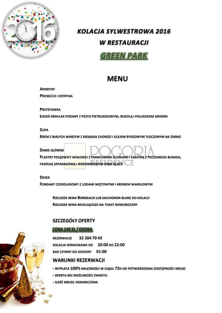 KOLACJA SYLWESTROWA 2016 W RESTAURACJI GREEN PARK MENU APERITIFF PROSECCO I OSTRYGA PRZYSTAWKA ŁOSOŚ GRAVLAX PODANY Z PESTO PIETRUSZKOWYM, RUKOLĄ I PALUSZKIEM GRISSINI ZUPA KREM Z BIAŁYCH WARZYW Z KIEŁBASA CHORIZO I OLEJEM RYDZOWYM TŁOCZONYM NA ZIMNO DANIE GŁÓWNE PLASTRY POLĘDWICY WOŁOWEJ Z FRANCUSKIMI KLUSKAMI I SAŁATKĄ Z PIECZONEGO BURAKA, FASOLKĄ SZPARAGOWĄ I BOROWIKOWYM DEMI GLACE DESER FONDANT CZEKOLADOWY Z LODAMI MIĘTOWYMI I KREMEM WANILIOWYM KIELISZEK WINA BORDEAUX LUB SAUVIGNON BLANC DO KOLACJI KIELISZEK WINA MUSUJĄCEGO NA TOAST NOWOROCZNY SZCZEGÓŁY OFERTY CENA 149 ZŁ / OSOBA REZERWACJE 32 264 70 43 KOLACJA SERWOWANA OD BAR CZYNNY DO GODZINY 20:00 DO 22:00 01:00 WARUNKI REZERWACJI - WYPŁATA 100% NALEŻNOŚCI W CIĄGU 72H OD POTWIERDZENIA DOSTĘPNOŚCI MIEJSC - OFERTA BEZ MOŻLIWOŚCI ZWROTU - ILOŚĆ MIEJSC OGRANICZONA