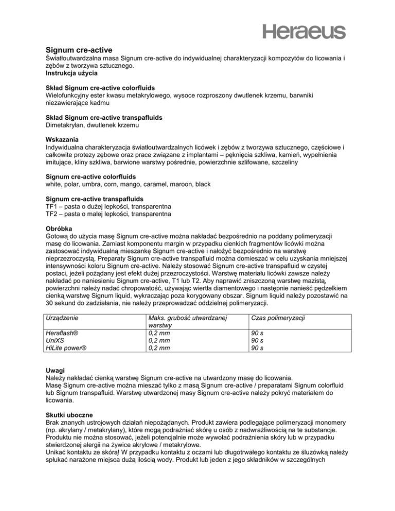 Signum cre-active Światłoutwardzalna masa Signum cre-active do indywidualnej charakteryzacji kompozytów do licowania i zębów z tworzywa sztucznego. Instrukcja użycia Skład Signum cre-active colorfluids Wielofunkcyjny ester kwasu metakrylowego, wysoce rozproszony dwutlenek krzemu, barwniki niezawierające kadmu Skład Signum cre-active transpafluids Dimetakrylan, dwutlenek krzemu Wskazania Indywidualna charakteryzacja światłoutwardzalnych licówek i zębów z tworzywa sztucznego, częściowe i całkowite protezy zębowe oraz prace związane z implantami – pęknięcia szkliwa, kamień, wypełnienia imitujące, kliny szkliwa, barwione warstwy pośrednie, powierzchnie szlifowane, szczeliny Signum cre-active colorfluids white, polar, umbra, corn, mango, caramel, maroon, black Signum cre-active transpafluids TF1 – pasta o dużej lepkości, transparentna TF2 – pasta o malej lepkości, transparentna Obróbka Gotową do użycia masę Signum cre-active można nakładać bezpośrednio na poddany polimeryzacji masę do licowania. Zamiast komponentu margin w przypadku cienkich fragmentów licówki można zastosować indywidualną mieszankę Signum cre-active i nałożyć bezpośrednio na warstwę nieprzezroczystą. Preparaty Signum cre-active transpafluid można domieszać w celu uzyskania mniejszej intensywności koloru Signum cre-active. Należy stosować Signum cre-active transpafluid w czystej postaci, jeżeli pożądany jest efekt dużej przezroczystości. Warstwę materiału licówki zawsze należy nakładać po naniesieniu Signum cre-active, T1 lub T2. Aby naprawić zniszczoną warstwę mazistą, powierzchni należy nadać chropowatość, używając wiertła diamentowego i następnie nanieść pędzelkiem cienką warstwę Signum liquid, wykraczając poza korygowany obszar. Signum liquid należy pozostawić na 30 sekund do zadziałania, nie należy przeprowadzać oddzielnej polimeryzacji. Urządzenie Heraflash® UniXS HiLite power® Maks. grubość utwardzanej warstwy 0,2 mm 0,2 mm 0,2 mm Czas polimeryzacji 90 s 90 s 90 s Uwagi Należy nakładać cienką warstwę Signum cre-active na utwardzony masę do licowania. Masę Signum cre-active można mieszać tylko z masą Signum cre-active / preparatami Signum colorfluid lub Signum transpafluid. Warstwę utwardzonej masy Signum cre-active należy pokryć materiałem do licowania. Skutki uboczne Brak znanych ustrojowych działań niepożądanych. Produkt zawiera podlegające polimeryzacji monomery (np. akrylany / metakrylany), które mogą podrażniać skórę u osób z nadwrażliwością na te substancje. Produktu nie można stosować, jeżeli potencjalnie może wywołać podrażnienia skóry lub w przypadku stwierdzonej alergii na żywice akrylowe / metakrylowe. Unikać kontaktu ze skórą! W przypadku kontaktu z oczami lub długotrwałego kontaktu ze śluzówką należy spłukać narażone miejsca dużą ilością wody. Produkt lub jeden z jego składników w szczególnych przypadkach może wywołać reakcje nadwrażliwości. W razie wątpliwości informacje o składnikach można uzyskać od producenta. Przechowywanie Nie należy przechowywać materiału w temp. powyżej 25°C. Unikać wystawiania bezpośrednio na działanie promieni słonecznych. Po użyciu należy zamknąć wszystkie pojemniki. Produktu nie należy używać po upływie daty przydatności. Przechowywać w miejscu niedostępnym dla dzieci. Wskazówki dotyczące utylizacji Należy postępować zgodnie z kartą danych substancji niebezpiecznej lub przestrzegać krajowych przepisów dotyczących utylizacji. Więcej informacji, patrz instrukcja obróbki Signum. ® = zarejestrowany znak handlowy Heraeus Kulzer GmbH Stan: 07.2009 Producent: Heraeus Kulzer GmbH & Co. KG Grüner Weg 11, D-63450 Hanau www.heraeus-dental.com [email protected] Biuro w Polsce: ul. I Dywizji Pancernej 45, pok. 201, 43-300 Bielsko-Biała tel/fax: 0048 (33) 496 35 39 [email protected] www.heraeus-kulzer.pl Konsultant w Polsce: Przemysław Rajczak tel. kom.: +48 602 267 218 e-mail: [email protected]