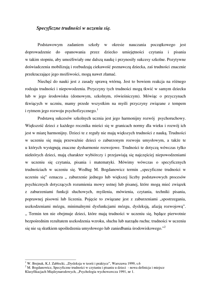 Specyficzne trudności w uczeniu się. Podstawowym doprowadzenie do zadaniem szkoły opanowania przez w okresie dziecko nauczania umiejętności początkowego czytania i jest pisania w takim stopniu, aby umożliwiały one dalszą naukę i przynosiły sukcesy szkolne. Pozytywne doświadczenia mobilizują i rozbudzają ciekawość poznawczą dziecka, zaś trudności znacznie przekraczające jego możliwości, mogą nawet złamać. Niechęć do nauki jest z zasady sprawą wtórną. Jest to bowiem reakcja na różnego rodzaju trudności i niepowodzenia. Przyczyny tych trudności mogą tkwić w samym dziecku lub w jego środowisku (domowym, szkolnym, rówieśniczym). Mówiąc o przyczynach tkwiących w uczniu, mamy przede wszystkim na myśli przyczyny związane z tempem i rytmem jego rozwoju psychofizycznego.1 Podstawą sukcesów szkolnych ucznia jest jego harmonijny rozwój psychoruchowy. Większość dzieci z każdego rocznika mieści się w granicach normy dla wieku i rozwój ich jest w miarę harmonijny. Dzieci te z reguły nie mają większych trudności z nauką. Trudności w uczeniu się mają przeważnie dzieci o zaburzonym rozwoju umysłowym, a także te u których występują znaczne dysharmonie rozwojowe. Trudności te dotyczą wówczas tylko niektórych dzieci, mają charakter wybiórczy i przejawiają się najczęściej niepowodzeniami w uczeniu się czytania, pisania i matematyki. Mówimy wówczas o specyficznych trudnościach w uczeniu się. Według M. Bogdanowicz termin „specyficzne trudności w uczeniu się” oznacza „ zaburzenie jednego lub większej liczby podstawowych procesów psychicznych dotyczących rozumienia mowy ustnej lub pisanej, które mogą mieć związek z zaburzeniami funkcji słuchowych, myślenia, mówienia, czytania, techniki pisania, poprawnej pisowni lub liczenia. Pojęcie to związane jest z zaburzeniami „spostrzegania, uszkodzeniami mózgu, minimalnymi dysfunkcjami mózgu, dysleksją, afazją rozwojową”. „ Termin ten nie obejmuje dzieci, które mają trudności w uczeniu się, będące pierwotnie bezpośrednim rezultatem uszkodzenia wzroku, słuchu lub narządu ruchu; trudności w uczeniu się nie są skutkiem upośledzenia umysłowego lub zaniedbania środowiskowego.”2 1 W. Brejnak, K.J. Zabłocki, „Dysleksja w teorii i praktyce”, Warszawa 1999, s.6 M. Bogdanowicz, Specyficzne trudności w czytaniu i pisaniu u dzieci - nowa definicja i miejsce Klasyfikacjach Międzynarodowych, „Psychologia wychowawcza 1991, nr 1. 2 Specyficzne trudności w uczeniu się mogą współwystępować z innymi zaburzeniami sensorycznymi, emocjonalnymi czy osobowości, nadpobudliwością psychoruchową często wiążącą się z zaburzeniami uwagi.3 Mikrozaburzenia rozwojowe łączyć się mogą w odpowiednie jednostki kliniczne lub modele mikrozaburzeń. Można więc mówić o zaburzeniach sprzężonych i nakładających się, a także wtórnych będących następstwem pierwotnych. W wyjaśnieniu pojęcia „specyficzne trudności w uczeniu” się silny akcent pada na określenie „specyficzne”, gdyż sugeruje ono, iż chodzi w ich przypadku o szczególny rodzaj trudności ze względu na charakterystyczny zespół objawów i moment ujawnienia się ich w całokształcie działań i zachowań dziecka.4 Znaczy to , że nie wszystkie tkwiące w uczniu mikrozaburzenia ujawniają się w jednakowym i w stałym układzie współzależności. Mogą manifestować się pojedynczo, kilkuzakresowo, niezależnie od siebie lub nakładając się wywoływać spotęgowane skutki. Dla określenia rodzaju poszczególnych trudności funkcjonują na ogół trzy pojęcia (ustalenia definicyjne przytaczam za Martą Bogdanowicz):5 • Dysleksja – określenie specyficznych trudności/zaburzeń w nauce czytania którym często towarzyszą trudności w pisaniu, • Dysgrafia – trudności/zaburzenia w opanowaniu właściwego poziomu graficznego pisma, • Dysortografia – specyficzne trudności/zaburzenia komunikowania się za pomocą pisma szczególnie trudności z opanowaniem poprawnej pisowni. Dzięki zastosowaniu powyższego systemu terminologicznego możemy precyzyjnie określić, jakie zaburzenia w obszarze komunikowania się za pomocą mowy pisanej występują u danego dziecka, bowiem każda z tych form trudności charakteryzuje się innymi symptomami. Trudności te mogą występować jednocześnie (wszystkie formy) lub w izolacji. Dla nazwania opisanych problemów w sposób bardziej ogólny używamy określeń: problem dysleksji, uczeń z dysleksją, dziecko dyslektyczne.6 Oprócz powyższych terminów często używany jest też termin „ryzyko dysleksji” – stosuje się go wobec młodszych dzieci 3 J. Jastrząb, Specyficzne trudności w uczeniu się jedną z przyczyn niepowodzeń szkolnych, „ Wychowanie na co dzień” 1997, nr 6 4 Tamże. 5 M. Bogdanowicz, Dysleksja rozwojowa, symptomy, patomechanizmy, terapia pedagogiczna, „Terapia” 1997. 6 M Bogdanowicz, A. Adryjanek, Uczeń z dysleksją w szkole, Gdynia 2005, s.21. wykazujących wybiórcze zaburzenia w rozwoju psychoruchowym, które mogą warunkować wystąpienie specyficznych trudności w czytaniu i pisaniu.7 Najnowsza definicja dysleksji została ogłoszona w 1994 roku przez Towarzystwo im. Ortona. Zgodnie z tą definicją „dysleksja jest jednym z wielu różnych rodzajów trudności w uczeniu się. Jest specyficznym zaburzeniem o podłożu językowym uwarunkowanym konstytucjonalnie, charakteryzuje się trudnościami w dekodowaniu pojedynczych słów, co najczęściej odzwierciedla niewystarczające zdolności przetwarzania fonologicznego. Trudności w dekodowaniu pojedynczych słów są zazwyczaj niewspółmierne do wieku życia oraz innych zdolności poznawczych i umiejętności szkolnych; trudności te nie są wynikiem ogólnego zaburzenia rozwoju ani zaburzeń sensorycznych. Dysleksja manifestuje się różnorodnymi trudnościami w odniesieniu do różnych form komunikacji językowej, często op