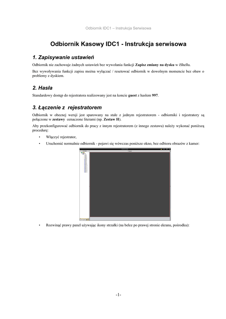 Odbiornik IDC1 – Instrukcja Serwisowa Odbiornik Kasowy IDC1 - Instrukcja serwisowa 1. Zapisywanie ustawień Odbiornik nie zachowuje żadnych ustawień bez wywołania funkcji Zapisz zmiany na dysku w iShellu. Bez wywoływania funkcji zapisu można wyłączać / resetować odbiornik w dowolnym momencie bez obaw o problemy z dyskiem. 2. Hasła Standardowy dostęp do rejestratora realizowany jest na koncie guest z hasłem 997. 3. Łączenie z rejestratorem Odbiornik w obecnej wersji jest sparowany na stałe z jednym rejestratorem - odbiorniki i rejestratory są połączone w zestawy oznaczone literami (np. Zestaw H). Aby przekonfigurować odbiornik do pracy z innym rejestratorem (z innego zestawu) należy wykonać poniższą procedurę: • Włączyć rejestrator, • Uruchomić normalnie odbiornik - pojawi się wówczas poniższe okno, bez odbioru obrazów z kamer: • Rozwinąć prawy panel używając ikony strzałki (na belce po prawej stronie ekranu, pośrodku): -1- Odbiornik IDC1 – Instrukcja Serwisowa • Na prawym panelu wybrać opcję Konfiguracja: • Na drzewku po lewej stronie zaznaczyć ikonę rejestratora IDR1 i skasować go używając ikony kosza (Usuń) z górnej belki. • Użyć ikony Dodaj urządzenie aby rozpocząć konfigurację nowego rejestratora: • Pojawi się wówczas okno konfiguracji rejestratora: -2- Odbiornik IDC1 – Instrukcja Serwisowa • Wcisnąć przycisk Wyszukaj: • Jeżeli odbiornik jest poprawnie połączony z rejestratorem, pojawi się odnaleziony adres 192.168.3.31. Należy dwukrotnie kliknąć ten adres, aby wprowadzić go do okna konfiguracji: • Należy uzupełnić pola: Użytkownik nazwą guest, oraz Hasło standardowym hasłem 997 i zatwierdzić przyciskiem OK. • Po zatwierdzeniu lista kanałów rejestratora pojawi się na drzewku w lewym panelu. Należy zaznaczyć rejestrator IDR1 prawym przyciskiem myszy i z menu kontekstowego wybrać opcję Wszystko - strumień główny: • Następnie należy otworzyć podgląd kamer przyciskiem Podgląd z prawego panelu, oraz zamknąć prawy panel ikoną strzałki na suwaku: • Następnie należy wybrać kamerę, która będzie się automatycznie pojawiać po restarcie odbiornika i otworzyć jej podgląd, dwukrotnie klikając na jej nazwie. • Po pojawieniu się obrazu z kamery należy zamknąć aplikację Control Center ikoną krzyżyka w prawym górnym rogu. -3- Odbiornik IDC1 – Instrukcja Serwisowa • Po zamknięciu aplikacji (po kilku sekundach) pojawi się okno aplikacji nadzorczej iShell - należy zatrzymać ładowanie, wybrać opcję Zapisz zmiany na dysku..., a następnie wybrać opcję Uruchom ponownie system (restart). • Po restarcie odbiornik powinien się poprawnie połączyć z nowym rejestratorem. Wersja 1.0 (2013-12-15) (c) 2013 Indingo s.c. www.indingo.com -4-