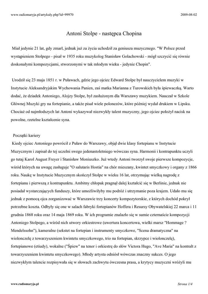 dodać, że dziadek Antoniego, Alojzy Stolpe, był zasłużonym dla Warszawy muzykiem. Nauczał w Szkole