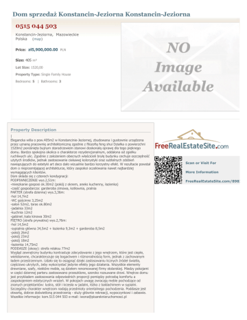 Dom sprzedaż Konstancin-Jeziorna Konstancin-Jeziorna 0515 044 503 Konstancin-Jeziorna, Mazowieckie Polska (map) Price: zł5,900,000.00 PLN Size: 405 m² Lot Size: 1520,00 Property Type: Single Family House Bedrooms: 5 | Bathrooms: 3 Property Description | Elegancka willa o pow.405m2 w Konstancinie-Jeziornej, zbudowana i gustownie urządzona przez uznaną pracownię architektoniczną zgodnie z filozofią feng shui Działka o powierzchni 1520m2 porośnięta bujnym starodrzewiem stanowi doskonałą oprawę dla tego pięknego domu. Bardzo spokojna okolica o charakterze rezydencjonalnym, oddalona od zgiełku ruchliwych ulic. Zgodnie z założeniem obecnych właścicieli bryłę budynku cechuje oszczędność użytych środków, jednak zastosowanie ciekawej kolorystyki oraz subtelnych zdobień nawiązujących do estetyki art deco dało wizualnie bardzo korzystny efekt. W rezultacie powstał dom o nieprzemijającej architekturze, który zaspokoi oczekiwania nawet najbardziej wymagających klientów. Dom składa się z czterech kondygnacji: PODPIWNICZENIE wys.2,51m: -mieszkanie gosposi ok.30m2 (pokój z oknem, aneks kuchenny, łazienka) -część gospodarcza: garderoba zimowa, kotłownia, pralnia PARTER (strefa dzienna) wys.3,36m: -hol 14,7m2 -WC gościnne 3,25m2 -salon 52m2, taras ok.80m2 -jadalnia 33m2 -kuchnia 12m2 -gabinet /sala kinowa 30m2 PIĘTRO (strefa prywatna) wys.2,76m: -hol 14,5m2 -sypialnia główna 34,5m2 + łazienka 9,3m2 + garderoba 8,5m2 -pokój 26m2 -pokój 23m2 -pokój 18m2 -łazienka 14,75m2 PODDASZE (skosy): strefa relaksu 77m2 Wygląd zewnętrzny budynku kontrastuje zdecydowanie z jego wnętrzem, które jest ciepłe, wielobarwne, chcarakteryzuje się bogactwem i różnorodnością form, jednak z zachowanym ładem przestrzennym. Udało się to osiągnąć dzięki zastosowaniu licznych źródeł światła, częściowo ukrytych, żeby wykorzystać jedynie efekty jego działania. Wszystkie elementy drewniane, szafy, niektóre meble, są dziełem renomowanej firmy stolarskiej. Miedzy pokojami w części dziennej parteru zastosowano przeszklone, szeroko rozsuwane drzwi. Wnętrze domu jest przykładem zastosowania odpowiednich proporcji pomiędzy potrzebą komfortu a zaspokojeniem estetycznych wrażeń. W pokojach uwagę zwracają meble pochodzące od znanych projektantów: lustra, stół i krzesła w jadalni, łóżko z baldachimem w sypialni. Szczególny charakter wnętrzom nadają przedmioty orientalnego pochodzenia. Poddasze jest otwartą, dobrze doświetloną przestrzenią - służy głównie rekreacji, wypoczynkowi i zabawie. Wszelkie informacje: kom.515 044 503 e-mail: [email protected] Scan or Visit For More Information FreeRealEstateSite.com/898350 ::DODATKOWE INFORMACJE | Prąd: tak | Gaz: miejski | Woda: piec dwufunkcyjny | Dojazd: asfaltowa/kostka | Otoczenie: las | Ogrzewanie: podłogowe | Kanalizacja: miejska | Alarm: TAK | Internet: TAK | Komunikacja publ.: MZK | Teren ogrodzony: TAK | Okna: nowe drewniane | Balkon: jest | Ilość balkonów: 2 | Tarasy: taras duży | Ilość tarasów: 1 | Zagosp. działki: zagospodarowana | Ukształtowanie działki: płaska | Kształt działki: prostokąt | Rodzaj domu: wolnostojący | Stan wybudowania: Pod klucz | Typ elewacji: tynk szlachetny | Podst. materiał budowlany: cegła pełna | Pokrycie dachu: blacha | Pozwolenie na użytkowanie: tak | Stan budynku: wykończony | Podpiwniczenie: częściowo podpiwniczony | Rok budowy: 2001 | Ilość pokoi: 8 | Wysokość pomieszczeń [m]: 3,20 | Ilość sypialni: 5 | Powierzchnia pokoi [m2]: 52/33/30/34,5/26/23/18/77 | Podłogi pokoi: parkiet | Typ kuchni: widna otwarta | Rodzaj kuchni: z zabudową kuchenną | Powierzchnia kuchni [m2]: 12 | Typ łazienki: razem z wc | Ilość łazienek: 3 | Powierzchnia łazienki [m2]: 14,75/9,3/3 | Wyposażenie łazienki: wanna, kabina prysznicowa, bidet | Ilość WC: 1 | Powierzchnia WC: 3,25 | Ilość przedpokoi: 2 | Powierzchnia przedpokoi [m2]: 29,5 | ::LINK DO STRONY | http://www.pisareknieruchomosci.pl/oferta.aspx?id=26742 ::KONTAKT DO AGENTA | Iwona Biniek | (22) 628 23 80, (22) 628 23 81, (22) 350 71 30 | 0515 044 503 | [email protected] Pośrednik odpowiedzialny zawodowo za wykonanie umowy pośrednictwa: Iwona Pisarek Security: alarm Year Built: 2001