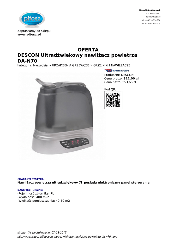 PitoszPiotr Adamczyk Pszczelińska 102 05-805 Otrębusy tel. +48 790 354 038 tel. +48 501 858 218 Zapraszamy do sklepu www.pitosz.pl OFERTA DESCON Ultradźwiekowy nawilżacz powietrza DA-N70 kategoria: Narzędzia > URZĄDZENIA GRZEWCZE > GRZEJNIKI I NAWILŻACZE Producent: DESCON Cena brutto: 312,00 zł Cena netto: 253,66 zł Kod QR: CHARAKTERYSTYKA: Nawilżacz powietrza ultradźwiękowy 7l posiada elektroniczny panel sterowania DANE TECHNICZNE: -Pojemność zbiornika: 7L -Wydajność: 400 ml/h -Wielkość pomieszczenia: 40-50 m2 strona: 1/1 wydrukowano: 07-03-2017 http://www.pitosz.pl/descon-ultradzwiekowy-nawilzacz-powietrza-da-n70.html