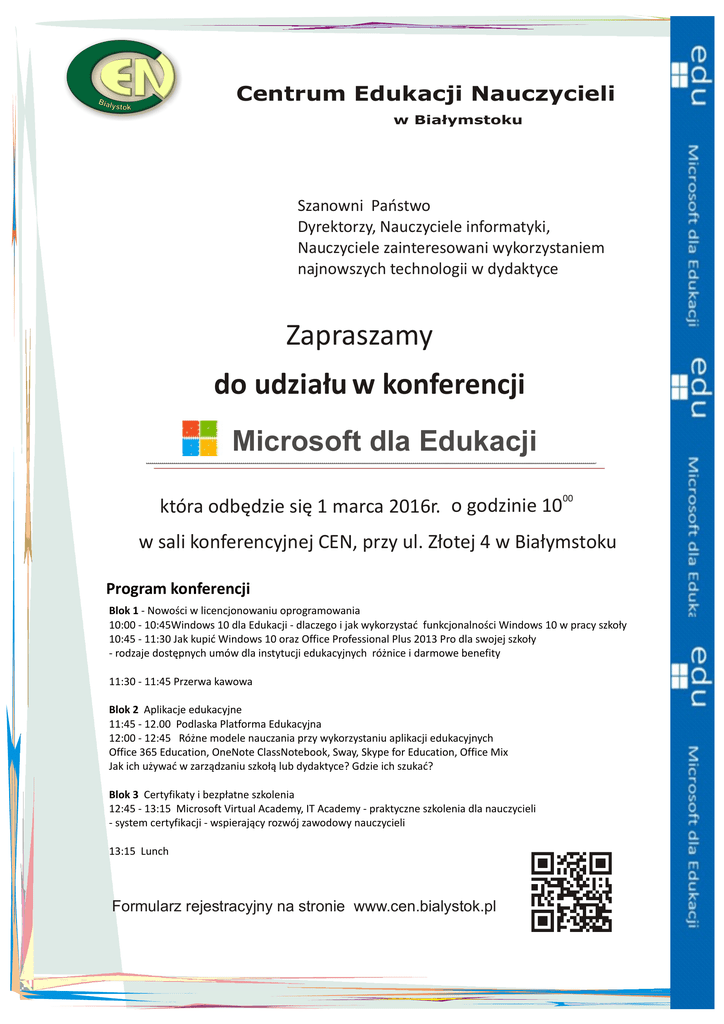 Bia Centrum Edukacji Nauczycieli łystok w Białymstoku Szanowni Państwo Dyrektorzy, Nauczyciele informatyki, Nauczyciele zainteresowani wykorzystaniem najnowszych technologii w dydaktyce Zapraszamy do udziału w konferencji Microsoft dla Edukacji 00 która odbędzie się 1 marca 2016r. o godzinie 10 w sali konferencyjnej CEN, przy ul. Złotej 4 w Białymstoku Program konferencji Blok 1 - Nowości w licencjonowaniu oprogramowania 10:00 - 10:45Windows 10 dla Edukacji - dlaczego i jak wykorzystać funkcjonalności Windows 10 w pracy szkoły 10:45 - 11:30 Jak kupić Windows 10 oraz Office Professional Plus 2013 Pro dla swojej szkoły - rodzaje dostępnych umów dla instytucji edukacyjnych różnice i darmowe benefity 11:30 - 11:45 Przerwa kawowa Blok 2 Aplikacje edukacyjne 11:45 - 12.00 Podlaska Platforma Edukacyjna 12:00 - 12:45 Różne modele nauczania przy wykorzystaniu aplikacji edukacyjnych Office 365 Education, OneNote ClassNotebook, Sway, Skype for Education, Office Mix Jak ich używać w zarządzaniu szkołą lub dydaktyce? Gdzie ich szukać? Blok 3 Certyfikaty i bezpłatne szkolenia 12:45 - 13:15 Microsoft Virtual Academy, IT Academy - praktyczne szkolenia dla nauczycieli - system certyfikacji - wspierający rozwój zawodowy nauczycieli 13:15 Lunch Formularz rejestracyjny na stronie www.cen.bialystok.pl