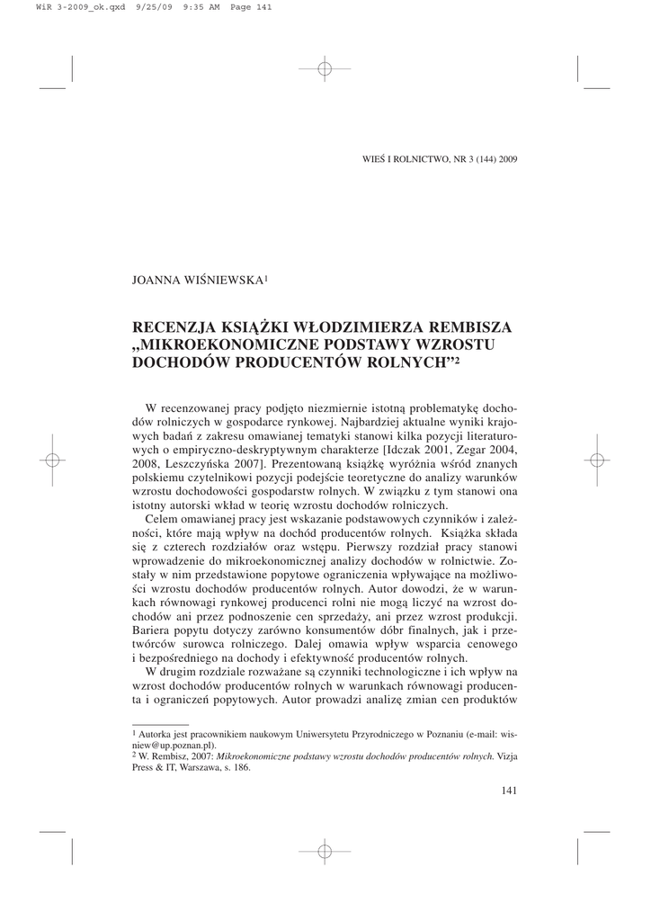 WiR 3-2009_ok.qxd 9/25/09 9:35 AM Page 141 WIEŒ I ROLNICTWO, NR 3 (144) 2009 JOANNA WIŒNIEWSKA1 RECENZJA KSI¥¯KI W£ODZIMIERZA REMBISZA „MIKROEKONOMICZNE PODSTAWY WZROSTU DOCHODÓW PRODUCENTÓW ROLNYCH”2 W recenzowanej pracy podjêto niezmiernie istotn¹ problematykê dochodów rolniczych w gospodarce rynkowej. Najbardziej aktualne wyniki krajowych badañ z zakresu omawianej tematyki stanowi kilka pozycji literaturowych o empiryczno-deskryptywnym charakterze [Idczak 2001, Zegar 2004, 2008, Leszczyñska 2007]. Prezentowan¹ ksi¹¿kê wyró¿nia wœród znanych polskiemu czytelnikowi pozycji podejœcie teoretyczne do analizy warunków wzrostu dochodowoœci gospodarstw rolnych. W zwi¹zku z tym stanowi ona istotny autorski wk³ad w teoriê wzrostu dochodów rolniczych. Celem omawianej pracy jest wskazanie podstawowych czynników i zale¿noœci, które maj¹ wp³yw na dochód producentów rolnych. Ksi¹¿ka sk³ada siê z czterech rozdzia³ów oraz wstêpu. Pierwszy rozdzia³ pracy stanowi wprowadzenie do mikroekonomicznej analizy dochodów w rolnictwie. Zosta³y w nim przedstawione popytowe ograniczenia wp³ywaj¹ce na mo¿liwoœci wzrostu dochodów producentów rolnych. Autor dowodzi, ¿e w warunkach równowagi rynkowej producenci rolni nie mog¹ liczyæ na wzrost dochodów ani przez podnoszenie cen sprzeda¿y, ani przez wzrost produkcji. Bariera popytu dotyczy zarówno konsumentów dóbr finalnych, jak i przetwórców surowca rolniczego. Dalej omawia wp³yw wsparcia cenowego i bezpoœredniego na dochody i efektywnoœæ producentów rolnych. W drugim rozdziale rozwa¿ane s¹ czynniki technologiczne i ich wp³yw na wzrost dochodów producentów rolnych w warunkach równowagi producenta i ograniczeñ popytowych. Autor prowadzi analizê zmian cen produktów 1 Autorka jest pracownikiem naukowym Uniwersytetu Przyrodniczego w Poznaniu (e-mail: [email protected]). 2 W. Rembisz, 2007: Mikroekonomiczne podstawy wzrostu dochodów producentów rolnych. Vizja Press & IT, Warszawa, s. 186. 141 WiR 3-2009_ok.qxd 9/25/09 9:35 AM Page 142 rolniczych i udzia³u wydatków na produkty rolnicze w wydatkach konsumenta. Opisuje proces optymalizacji nak³adów czynników produkcji i podzia³u ich wynagrodzenia. Wprowadza pojêcie kapita³u ludzkiego i œledzi jego znaczenie dla wynagrodzenia czynnika pracy. Analizuje popyt i poda¿ na czynniki wytwórcze oraz sposób kszta³towania siê ich cen. Bada, czy udzia³ ¿ywnoœci w wydatkach konsumentów i ceny dóbr rolno-¿ywnoœciowych maj¹ znaczenie dla wynagrodzenia czynników zaanga¿owanych do ich wytworzenia. Na podstawie analizy roli oszczêdnoœci i inwestycji w podnoszeniu wydajnoœci pracy buduje d³ugookresowe modele wzrostu, przechodz¹c na koñcu do analizy wzrostu dochodów producentów rolnych w warunkach niezmiennoœci czynników wytwórczych. W trzecim rozdziale autor rozpatruje czynniki zmian dochodów producentów rolnych w warunkach równowagi konkurencyjnej. Przyjmuje za³o¿enia, dotycz¹ce warunków rynkowych – konkurencji doskona³ej. Poszukuje i analizuje czynniki endogenne, uznaj¹c za takie wszystkie zale¿ne od dzia³añ producenta, oraz egzogenne, okreœlone jako niezale¿ne od jego decyzji. Identyfikuje przyczyny wp³ywaj¹ce na wynagrodzenie czynnika pracy. Wskazuje na efektywnoœæ produkcji, jako uwarunkowanie wewnêtrzne, oraz na op³acalnoœæ produkcji, uwarunkowanej zewnêtrznie cenami i ich relacjami. Bada zale¿noœæ miêdzy elastycznoœci¹ popytu na produkty rolne a wysokoœci¹ przychodów producentów rolnych. Podejmuje kwestiê Ÿród³a wzrostu przychodów producentów rolnych i ich wp³ywu na dobrobyt konsumentów. Analizuje zale¿noœci miêdzy tempem wzrostu przychodów i kosztów wytwarzania oraz skutki dla producentów rolnych, konsumentów i podatników, wynikaj¹ce z przyjêcia formu³y kosztowej, jako podstawy stanowienia cen rolnych. W czwartym i zarazem ostatnim rozdziale autor analizuje mikroekonomiczne podstawy zarz¹dzania ryzykiem, jako sposób ochrony dochodów rolniczych. Opisuje Ÿród³a ryzyka rynkowego przedsiêbiorcy rolnego sprzedaj¹cego i kupuj¹cego dobra i us³ugi na rynku. Omawia zjawisko niepewnoœci przychodów oraz sposób zachowania producenta w warunkach ryzyka cenowego. Œledzi sposób kalkulowania oczekiwanej ceny sprzeda¿y oraz wra¿liwoœæ dochodów producentów rolnych na zmiany cen skupu. Przedstawia mechanizm ubezpieczenia ryzyka cenowego i strategie na rynku terminowym. W recenzowanej pracy zosta³y postawione tezy dotycz¹ce warunków wzrostu dochodów producentów rolnych w gospodarce rynkowej. Punkt wyjœcia rozwa¿añ stanowi brak mo¿liwoœci wp³ywu producenta na cenê dóbr rolno-¿ywnoœciowych, od których zale¿y jego dochód. Przyjêto klasyczne kryterium wzrostu na drodze redukcji czynnika pracy, zwiêkszenia wydajnoœci pracy oraz iloœci kapita³u. Autor stawia g³ówn¹ tezê pracy, i¿ jedyn¹ drog¹ wzrostu dochodów producentów rolnych jest poprawa efektywnoœci wytwarzania, w tym przede wszystkim poprawa wydajnoœci pracy w warunkach ograniczonych mo¿liwoœci wzrostu wolumenu produkcji globalnej [s. 11]. Interpretuje kolejno tezy o: 142 WiR 3-2009_ok.qxd 9/25/09 9:35 AM Page 143 – koniecznoœci zmniejszenia zatrudnienia w skali ca³ego rolnictwa, – potrzebie wzrostu produkcji i udzia³u w rynku rolnym pojedynczego producenta rolnego poprzez koncentracjê produkcji, – wzroœcie znaczenia kapita³u ludzkiego jako czynnika rozwoju i wzrostu efektywnoœci producenta rolnego (profesjonalizacji i specjalizacji zawodu rolnika), – potrzebie zarz¹dzania ryzykiem cenowym w celu stabilizacji i poprawy sytuacji dochodowej producentów rolnych, – braku przymusu poprawy wydajnoœci pracy, jako Ÿród³a wzrostu wynagrodzenia czynnika pracy w warunkach instytucjonalnego wsparcia dochodów, oraz stratach podatnika i konsumenta, wynikaj¹cych z podtrzymywania cen rolnych, – zale¿noœci dochodu rolniczego od ceny produktów rolniczych i stosowanych te