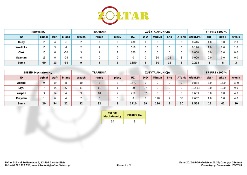 Plastyk IIG TRAFIENIA ZUŻYTA AMUNICJA FR FIRE x100 % ID zginał trafił bilans brzuch ramię plecy UZI D-D Mhgun Shg ATank efekt.(%) pkt - pkt + wynik Rudy 15 4 -8 2 2 0 480 1 0 0 0 0.416 1.0 3.0 2.0 Worlicka 15 3 -7 2 1 0 510 0 0 0 0 0.196 1.0 2.0 1.0 Olek 15 6 -10 5 1 1 360 0 0 0 0 0.000 3.0 3.0 0.0 Szaman 15 0 -14 0 0 0 0 0 30 12 8 0.000 0.0 0.0 0.0 Suma 60 13 -39 9 4 1 1350 1 30 12 8 0.214 5 8 3 ZSEEiM Mechatronicy TRAFIENIA ZUŻYTA AMUNICJA FR FIRE x100 % ID zginał trafił bilans brzuch ramię plecy UZI D-D Mhgun Shg ATank efekt.(%) pkt - pkt + wynik Adahil 9 19 8 10 8 3 1470 0 0 0 0 0.884 3.0 16.0 13.0 Eryk 7 15 6 11 11 1 30 37 0 0 0 13.433 3.0 12.0 9.0 Yarpen 3 14 4 9 10 2 210 32 0 0 0 1.653 5.0 9.0 4.0 Krzychu 1 6 4 2 3 3 0 0 120 2 30 2.632 1.0 5.0 4.0 Suma 20 54 22 32 32 9 1710 69 120 2 30 1.554 12 42 30 Zoltar B-B - ul.Sukiennicza 3, 43-300 Bielsko-Biała Tel.:+48 791 121 530, e-mail:[email protected] ZSEEiM Mechatronicy Plastyk IIG 30 3 Strona 1 z 5 Data: 2016-05-30; Godzina: 18:39; Czas gry: 24minut Prowadzący: Gamemaster ZOLTAR Plastyk IIG TRAFIENIA ZUŻYTA AMUNICJA FR FIRE x100 % ID zginał trafił bilans brzuch ramię plecy UZI D-D efekt.(%) pkt - pkt + wynik Olek 15 6 -4 6 1 0 630 2 0.949 0.0 6.0 6.0 Rudy 15 5 -7 3 1 1 990 0 0.303 1.0 4.0 3.0 Szaman 15 8 -5 3 4 4 390 1 0.512 3.0 5.0 2.0 Worlicka 15 0 -9 0 0 0 330 0 0.000 0.0 0.0 0.0 Suma 60 19 -25 12 6 5 2340 3 0.469 4 15 11 ZSEEiM Mechatronicy TRAFIENIA ZUŻYTA AMUNICJA FR FIRE x100 % ID zginał trafił bilans brzuch ramię plecy UZI D-D efekt.(%) pkt - pkt + wynik Adahil 10 10 3 7 1 4 1320 0 0.758 0.0 10.0 10.0 Eryk 9 12 3 8 11 1 120 44 4.878 2.0 10.0 8.0 Krzychu 7 12 4 9 1 2 1800 0 0.333 3.0 9.0 6.0 Yarpen 2 11 2 5 7 5 480 38 0.579 4.0 7.0 3.0 Suma 28 45 12 29 20 12 3720 82 0.710 9 36 27 Zoltar B-B - ul.Sukiennicza 3, 43-300 Bielsko-Biała Tel.:+48 791 121 530, e-mail:[email protected] ZSEEiM Mechatronicy Plastyk IIG 27 11 Strona 2 z 5 Data: 2016-05-30; Godzina: 18:25; Czas gry: 24minut Prowadzący: Gamemaster ZOLTAR Drużyny Miejsce Nazwa Rozgrywki 1 2 ZSEEiM Mechatronicy 30 27 Plastyk IIG Zoltar B-B - ul.Sukiennicza 3, 43-300 Bielsko-Biała Tel.:+48 791 121 530, e-mail:[email protected] Strona 3 z 5 3 11 Suma 57 14 Data: 2016-05-30 Prowadzący: Gamemaster ZOLTAR Zestawienie wg wyniku Miejsce TRAFIENIA ZUŻYTA AMUNICJA ID zginał trafił bilans brzuch ramię plecy UZI D-D Mhgun Shg aTank efekt.(%) pkt - pkt + wynik Adahil 23.75 36.25 5.00 21.25 11.25 8.75 3487.50 0.00 0.00 0.00 0.00 0.824 3.75 32.50 28.75 Eryk 20.00 33.75 1.25 23.75 27.50 2.50 187.50 101.25 0.00 0.00 0.00 7.359 6.25 27.50 21.25 Krzychu 10.00 22.50 2.50 13.75 5.00 6.25 2250.00 0.00 150.00 2.50 37.50 0.512 5.00 17.50 12.50 4 Yarpen 6.25 31.25 2.50 17.50 21.25 8.75 862.50 87.50 0.00 0.00 0.00 0.921 11.25 20.00 8.75 5 Olek 37.50 15.00 -30.00 13.75 2.50 1.25 1237.50 2.50 0.00 0.00 0.00 0.605 3.75 11.25 7.50 6 Rudy 37.50 11.25 -31.25 6.25 3.75 1.25 1837.50 1.25 0.00 0.00 0.00 0.340 2.50 8.75 6.25 7 Szaman 37.50 10.00 -35.00 3.75 5.00 5.00 487.50 1.25 37.50 15.00 10.00 0.454 3.75 6.25 2.50 8 Worlicka 37.50 3.75 -36.25 2.50 1.25 0.00 1050.00 0.00 0.00 0.00 0.00 0.119 1.25 2.50 1.25 Zestawienie wg bilansu Miejsce TRAFIENIA ZUŻYTA AMUNICJA ID zginał trafił bilans brzuch ramię plecy UZI D-D Mhgun Shg aTank efekt.(%) pkt - pkt + wynik Adahil 23.75 36.25 5.00 21.25 11.25 8.75 3487.50 0.00 0.00 0.00 0.00 0.824 3.75 32.50 28.75 Yarpen 6.25 31.25 17.50 21.25 8.75 862.50 87.50 0.00 0.00 0.00 0.921 11.25 20.00 8.75 Krzychu 10.00 22.50 13.75 5.00 6.25 2250.00 0.00 150.00 2.50 37.50 0.512 5.00 17.50 12.50 Eryk 20.00 33.75 1.25 23.75 27.50 2.50 187.50 101.25 0.00 0.00 0.00 7.359 6.25 27.50 21.25 4 Olek 37.50 15.00 -30.00 13.75 2.50 1.25 1237.50 2.50 0.00 0.00 0.00 0.605 3.75 11.25 7.50 5 Rudy 37.50 11.25 -31.25 6.25 3.75 1.25 1837.50 1.25 0.00 0.00 0.00 0.340 2.50 8.75 6.25 6 Szaman 37.50 10.00 -35.00 3.75 5.00 5.00 487.50 1.25 37.50 15.00 10.00 0.454 3.75 6.25 2.50 7 Worlicka 37.50 3.75 -36.25 2.50 1.25 0.00 1050.00 0.00 0.00 0.00 0.00 0.119 1.25 2.50 1.25 2.50 Zoltar B-B - ul.Sukiennicza 3, 43-300 Bielsko-Biała Tel.:+48 791 121 530, e-mail:[email protected] Strona 4 z 5 Data: 2016-05-30 Prowadzący: Gamemaster ZOLTAR Zestawienie wg efektywności Miejsce TRAFIENIA ZUŻYTA AMUNICJA ID zginał trafił bilans brzuch ramię plecy UZI D-D Mhgun Shg aTank efekt.(%) pkt - pkt + wynik Eryk 20.00 33.75 1.25 23.75 27.50 2.50 187.50 101.25 0.00 0.00 0.00 7.359 6.25 27.50 21.25 Yarpen 6.25 31.25 2.50 17.50 21.25 8.75 862.50 87.50 0.00 0.00 0.00 0.921 11.25 20.00 8.75 Adahil 23.75 36.25 5.00 21.25 11.25 8.75 3487.50 0.00 0.00 0.00 0.00 0.824 3.75 32.50 28.75 4 Olek 37.50 15.00 -30.00 13.75 2.50 1.25 1237.50 2.50 0.00 0.00 0.00 0.605 3.75 11.25 7.50 5 Krzychu 10.00 22.50 2.50 13.75 5.00 6.25 2250.00 0.00 150.00 2.50 37.50 0.512 5.00 17.50 12.50 6 Szaman 37.50 10.00 -35.00 3.75 5.00 5.00 487.50 1.25 37.50 15.00 10.00 0.454 3.75 6.25 2.50 7 Rudy 37.50 11.25 -31.25 6.25 3.75 1.25 1837.50 1.25 0.00 0.00 0.00 0.340 2.50 8.75 6.25 8 Worlicka 37.50 3.75 -36.25 2.50 1.25 0.00 1050.00 0.00 0.00 0.00 0.00 0.119 1.25 2.50 1.25 Zoltar B-B - ul.Sukiennicza 3, 43-300 Bielsko-Biała Tel.:+48 791 121 530, e-mail:[email protected] Strona 5 z 5 Data: 2016-05-30 Prowadzący: Gamemaster ZOLTAR