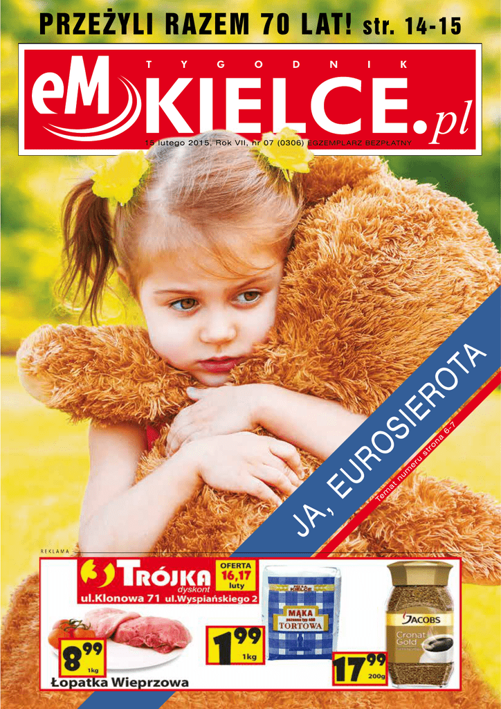 PRZEŻYLI R AZEM 70 L AT! str. 14-15 -7 6 a n st ru X X X X X X X JA Te m a t n u m e UR ,E ro O SI ER O TA 15 lutego 2015, Rok VII, nr 07 (0306) EGZEMPL ARZ BEZPŁ ATNY KIELCE AKTUALNOŚCI cieli sklepów, dystrybutorów i producentów sprzętu. Na stoiskach zobaczymy głównie kolekcje odzieży sportowej oraz sprzętu sportowego na kolejny sezon. W ramach targów odbędzie się również II Salon Turystyki i Sportów Wodnych, podczas którego swoją ofertę szerokiej publiczności zaprezentują producenci i dystrybutorzy wysokiej klasy sprzętu pływającego oraz związanego z nim osprzętu. Obydwie imprezy zakończą się w piątek. /red/ Ferie czas zacząć Dokładnie 200 tysięcy 597 uczniów z województwa świętokrzyskiego rozpocznie od poniedziałku zimowe ferie. Tradycyjnie potrwają one dwa tygodnie. Świętokrzyskie znalazło się w tym roku w gronie województw, w których dzieci rozpoczną zimowy odpoczynek jako ostatnie. Razem z nimi wypoczywać będą również uczniowie z województw: kujawsko–pomorskiego, lubuskiego, małopolskiego i wielkopolskiego. Ofertę różnorodnych zajęć dla młodzieży zaprezentowało wiele placówek w Kielcach. Miasto zaproponowało też zajęcia dla lubiących odpoczywać aktywnie. Więcej informacji na ten temat znaleźć można na stronie em.kielce.pl /jw/ Kielce dla Ukrainy W naszym mieście zorganizowana zostanie aukcja charytatywna, której celem jest zbiórka pieniędzy na rehabilitację rannych żołnierzy walczących na Wschodzie Ukrainy. Skorzystają także kieleckie dzieci, cierpiące na schorzenia onkologiczne. Aukcja odbędzie się 27 marca w Galerii Winda w KCK. W jej trakcie będzie można kupić obrazy ukraińskich artystów. Zdjęcie każdej pracy pojawi się na stronie Urzędu Miasta, który pomaga w organizacji aukcji Polsko–Ukraińskiemu Stowarzyszeniu Medycznemu im. Św. Łukasza. – Akcję nazwaliśmy „Medycyna i sztuka ponad podziałami”. Część środków pójdzie na dzieci chore onkologicznie, a część na rehabilitację żołnierzy w polskich sanatoriach – wyjaśnia prezydent Wojciech Lubawski. Początek aukcji o godz. 19 /MU/ Czterech do Korony Miasto prowadzi intensywne rozmowy w sprawie sprzedaży Korony Kielce. Według władz klubem zainteresowane są cztery podmioty. – To dwaj inwestorzy z Polski, firma ze Szwajcarii oraz z Indii. W grę wchodzi sprzedaż nawet 100 procent akcji klubu – informuje prezydent Wojciech Lubawski. Głównym warunkiem ewentualnej transakcji będzie utrzymanie się złocisto–krwistych w T–Mobile Ekstraklasie. Prezydent wierzy, 2 15 LUTEGO 2015 Ile kosztował Marszałek? Obywatelski Komitet Budowy Pomnika Marszałka Józefa Piłsudskiego w Kielcach w środę oficjalnie rozliczył się z przeprowadzonej zbiórki publicznej. Ostatecznie udało się zebrać ponad 611 tys. zł. Z tego na koncie ŚRODA 8.40 stowarzyszenia pozostało 64 tys. zł, a więc Przed nami Wielki Post W tym tygodniu Środą Popielcową rozpoczyna się Wielki Post. Kościół katolicki zachęca budowa pomnika kosztowała 547 tys. zł. w tym czasie do odmawiania sobie pokarmów, do modlitwy i jałmużny, które duchowo Największą kwotę na ten cel przekazała przygotowują do Świąt Zmartwychwstania Jezusa Chrystusa. Popielec bierze swą nazwę Rada Ochrony Pamięci Walk i Męczeństwa od obrzędu posypywania głów popiołem, co jest to znakiem przyjętej pokuty. Ksiądz wypo- – 90 tys. zł. Reszta pochodziła z datków wiada wtedy słowa: „Prochem jesteś i w proch się obrócisz” lub „Nawracajcie się i wierzcie instytucji oraz osób prywatnych, a także ze w Ewangelię”. W głębszym przeżywaniu Wielkiego Postu pomagają nabożeństwa Drogi zbiórek publicznych i sprzedaży cegiełek. – Nie wiemy jeszcze, na co przeznaczymy Krzyżowej i Gorzkich Żali, w których zawsze uczestniczy imponująca liczba wiernych. /KB/ pozostałe na koncie pieniądze. Ustalimy to w trakcie walnego zgromadzenia, które ma się odbyć w ciągu najbliższych tygodni prezentacji zostali oficjalnie przywitani nowi że to się uda. Urząd Miasta przygotowuje – zapowiada Janusz Koza, przewodniczący dokumentację dla zainteresowanych. – Hin- zawodnicy: Luis Carlos, Lukas Klemenz, komitetu. /top/ Aleksandrs Fertovs, Jakub Kotarzewski i Kadusi przyjadą w przyszłym tygodniu. Zobamil Matulka. /MU/ czymy, czego oczekują od Korony – mówi SŁUCHA J prezydent Kielc. Piłkarze gotowi /MU/ Targi na sportowo Już w najbliższą środę rozpoczynają się w „Korona nigdy nie zginie” – takie hasło przy- halach przy ulicy Zakładowej Międzynaroświecało środowej prezentacji Korony Kielce. dowe Targi Branży Sportowej i Outdoorowej Żółto–czerwoni pokazali się swoim kibicom w hali przy ulicy Krakowskiej. Sporą atrakcją imprezy był pojedynek Drużyny Kibiców z Old–Stars Korona, w którym wystąpiły byłe gwiazdy klubu, m.in. Grzegorz Piechna, Edi Andradina, Arkadiusz Bilski, Przemysław Cichoń i Marek Gołąbek. Najpiękniejszym akcentem tego spotkania był gol zdobyty w... trzeciej sekundzie meczu, gdy tuż po rozpo- „Kielce Sport–Expo” (do niedawna „Kielce częciu gry znakomitym strzałem z połowy Sport – Zima”). To największa i najważniejboiska popisał się Edi. Ostatecznie to jednak sza w tej części Europy impreza skierowana kibice mogli cieszyć się z wygranej. Podczas do przedstawicieli firm sportowych, właści- Nikt nie chce KKSM Nie udało się sprzedać w minioną środę Kieleckich Kopalni Surowców Mineralnych, bo nikt z zainteresowanych nie złożył oferty w terminie, czyli do 10 lutego. Cena wywoławcza likwidowanego przedsiębiorstwa wynosiła 103 mln zł. Trzeba będzie zatem ją obniżyć i ogłosić kolejny przetarg. Dolna granica wyceny to około 70 mln (tzw. cena KIELCE REPORTAŻ likwidacyjna). Przypomnijmy, że pod młotek poszły wszystkie kopalnie spółki wraz z całą infrastrukturą techniczną. Natomiast pieniądze zgromadzone do czasu zmiany w