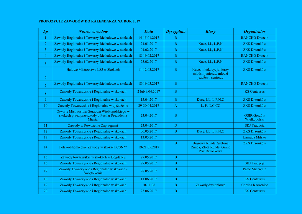 PROPOZYCJE ZAWODÓW DO KALENDARZA NA ROK 2017 Lp Nazwa zawodów Data Dyscyplina 1 Zawody Regionalne i Towarzyskie halowe w skokach 14-15.01.2017 B 2 Zawody Regionalne i Towarzyskie halowe w skokach 21.01.2017 B Kuce, LL, L,P,N ZKS Drzonków 3 Zawody Regionalne i Towarzyskie halowe w skokach 04.02.2017 B Kuce, LL, L,P,N ZKS Drzonków 4 Zawody Regionalne i Towarzyskie halowe w skokach 18-19.02.2017 B Zawody Regionalne i Towarzyskie halowe w skokach 25.02.2017 B Kuce, LL, L,P,N ZKS Drzonków Halowe Mistrzostwa LZJ w Skokach 11-12.03.2017 B Kuce, młodzicy, juniorzy młodsi, juniorzy, młodzi jeźdźcy i seniorzy ZKS Drzonków Zawody Regionalne i Towarzyskie halowe w skokach 18-19.03.2017 B RANCHO Drzecin Zawody Towarzyskie i Regionalne w skokach 2 lub 9.04.2017 B KS Centaurus 9 Zawody Towarzyskie i Regionalne w skokach 15.04.2017 B Kuce, LL, L,P,N,C ZKS Drzonków 10 Zawody Towarzyskie i Regionalne w ujeżdżeniu 29-30.04.2017 A L, P, N,C,CC ZKS Drzonków Otwarte Mistrzostwa Gorzowa Wielkopolskiego w skokach przez przeszkody o Puchar Prezydenta Miasta. 23.04.2017 B OSIR Gorzów Wielkopolski 11 Zawody w Powożeniu Zaprzęgami 23.04.2017 D SKJ Tradycja 12 Zawody Towarzyskie i Regionalne w skokach 06.05.2017 B 13 Zawody Towarzyskie i Regionalne w skokach 13.05.2017 14 Polsko-Niemieckie Zawody w skokach CSN** 19-21.05.2017 15 Zawody towarzyskie w skokach w Bogdańcu 27.05.2017 B 16 Zawody Towarzyskie i Regionalne w skokach 27.05.2017 B SKJ Tradycja 17 Zawody Towarzyskie i Regionalne w skokach Święto konia 28.05.2017 B Pałac Mierzęcin 18 Zawody Towarzyskie i Regionalne w skokach 11.06.2017 B KS Centaurus 19 Zawody Towarzyskie i Regionalne w skokach 10-11.06 B 20 Zawody Towarzyskie i Regionalne w skokach 25.06.2017 B 5 6 7 8 Klasy Organizator RANCHO Drzecin RANCHO Drzecin Kuce, LL, L,P,N,C ZKS Drzonków Lansada Milsko B Brązowa Runda, Srebrna Runda, Złota Runda, Grand Prix Drzonkowa Zawody dwudniowe ZKS Drzonków Cortina Kaczenice KS Centaurus Lp Nazwa zawodów Data Dyscyplina 21 Zawody Towarzyskie i Regionalne w skokach 2.07.2017 B 22 Regionalne Zawody w Ujeżdżeniu, Eliminacje do MPMłodych Koni w Ujeżdżeniu 15-16.07.2017 23 Regionalno-Towarzyskie Zawody w skokach 22.07.2017 24 Polska Liga Jeździecka w skokach – CSN *** 03-06.08.2017 25 Zawody Towarzyskie i Regionalne w skokach 13.08.2017 26 Towarzyskie zawody w skokach przez przeszkody o Puchar Wójta Gminy Kłodawa 19.08.2017 27 Mistrzostwa Polski Młodych Koni w skokach 18-20.08.2017 28 Zawody Towarzyskie i Regionalne w skokach – zakończenie wakacji 27.08.2017 29 Towarzyskie i Regionalne Zawody w Ujeżdżeniu Mistrzostwa LZJ w Ujeżdżeniu 02-03.09.2017 30 Zawody Towarzyskie i Regionalne w skokach 09.09.2017 31 Mistrzostwa Polski Amatorów w powożeniu zaprzęgami 09 lub 10.09.2017 32 Zawody Towarzyskie i Regionalne w skokach 33 A Klasy Organizator Cortina Kaczenice L,P,N,C,CC ZKS Drzonków B LL, L, L,P, N,C ZKS Drzonków B Brązowa Runda, Srebrna Runda, Złota Runda, Grand Prix Zielonej Góry ZKS Drzonków B Cortina Kaczenice B JKS “ROBIR” Chwalęcice, Stajnia “ROBIR” Chwalecice B 4 latki, 5 latki, 6 latki 7 latki Grand Prix Ogierów B A ZKS Drzonków SKJ Tradycja L,P,N,C,CC ZKS Drzonków B Lansada Milsko D SKJ Tradycja 10.09.2017 B KS Centaurus Zawody Towarzyskie i Regionalne w skokach 17.09.2017 B Cortina Kaczenice 34 Mistrzostwa LZJ w skokach 23-24.09.2017 35 Zawody Regionalne i Towarzyskie halowe w skokach 36 Zawody Regionalne i Towarzyskie halowe w skokach B Kuce, młodzicy, juniorzy młodsi, juniorzy, seniorzy ZKS Drzonków 18.11.2017 B LL, L, L,P, N,C ZKS Drzonków 16.12.2017 B LL, L, L,P, N,C ZKS Drzonków