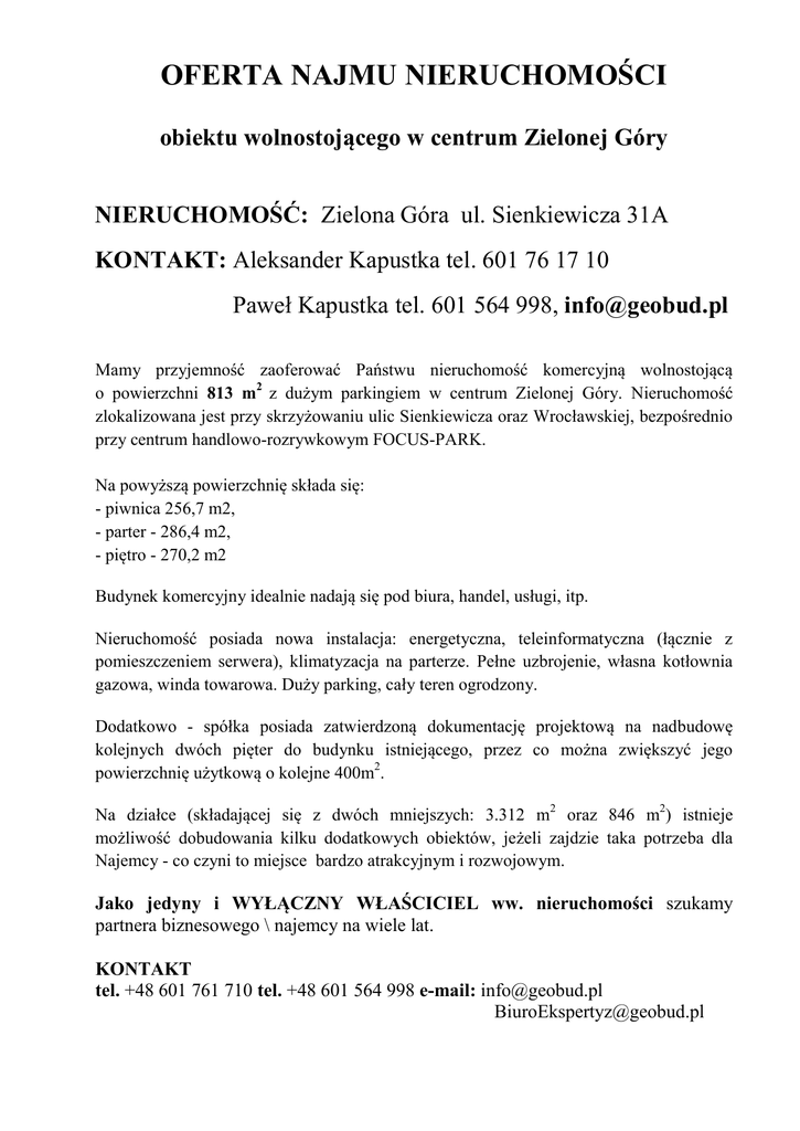 OFERTA NAJMU NIERUCHOMOŚCI obiektu wolnostojącego w centrum Zielonej Góry NIERUCHOMOŚĆ: Zielona Góra ul. Sienkiewicza 31A KONTAKT: Aleksander Kapustka tel. 601 76 17 10 Paweł Kapustka tel. 601 564 998, [email protected] Mamy przyjemność zaoferować Państwu nieruchomość komercyjną wolnostojącą o powierzchni 813 m2 z dużym parkingiem w centrum Zielonej Góry. Nieruchomość zlokalizowana jest przy skrzyżowaniu ulic Sienkiewicza oraz Wrocławskiej, bezpośrednio przy centrum handlowo-rozrywkowym FOCUS-PARK. Na powyższą powierzchnię składa się: - piwnica 256,7 m2, - parter - 286,4 m2, - piętro - 270,2 m2 Budynek komercyjny idealnie nadają się pod biura, handel, usługi, itp. Nieruchomość posiada nowa instalacja: energetyczna, teleinformatyczna (łącznie z pomieszczeniem serwera), klimatyzacja na parterze. Pełne uzbrojenie, własna kotłownia gazowa, winda towarowa. Duży parking, cały teren ogrodzony. Dodatkowo - spółka posiada zatwierdzoną dokumentację projektową na nadbudowę kolejnych dwóch pięter do budynku istniejącego, przez co można zwiększyć jego powierzchnię użytkową o kolejne 400m2. Na działce (składającej się z dwóch mniejszych: 3.312 m2 oraz 846 m2) istnieje możliwość dobudowania kilku dodatkowych obiektów, jeżeli zajdzie taka potrzeba dla Najemcy - co czyni to miejsce bardzo atrakcyjnym i rozwojowym. Jako jedyny i WYŁĄCZNY WŁAŚCICIEL ww. nieruchomości szukamy partnera biznesowego \ najemcy na wiele lat. KONTAKT tel. +48 601 761 710 tel. +48 601 564 998 e-mail: [email protected] [email protected]
