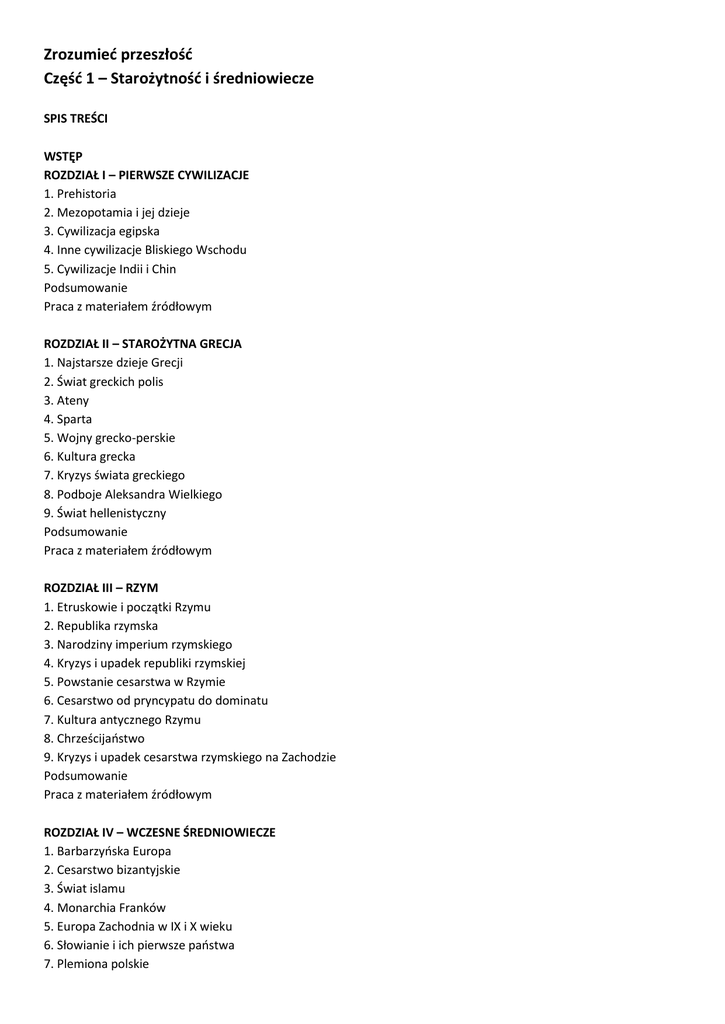 Zrozumieć przeszłość Część 1 – Starożytność i średniowiecze SPIS TREŚCI WSTĘP ROZDZIAŁ I – PIERWSZE CYWILIZACJE 1. Prehistoria 2. Mezopotamia i jej dzieje 3. Cywilizacja egipska 4. Inne cywilizacje Bliskiego Wschodu 5. Cywilizacje Indii i Chin Podsumowanie Praca z materiałem źródłowym ROZDZIAŁ II – STAROŻYTNA GRECJA 1. Najstarsze dzieje Grecji 2. Świat greckich polis 3. Ateny 4. Sparta 5. Wojny grecko-perskie 6. Kultura grecka 7. Kryzys świata greckiego 8. Podboje Aleksandra Wielkiego 9. Świat hellenistyczny Podsumowanie Praca z materiałem źródłowym ROZDZIAŁ III – RZYM 1. Etruskowie i początki Rzymu 2. Republika rzymska 3. Narodziny imperium rzymskiego 4. Kryzys i upadek republiki rzymskiej 5. Powstanie cesarstwa w Rzymie 6. Cesarstwo od pryncypatu do dominatu 7. Kultura antycznego Rzymu 8. Chrześcijaostwo 9. Kryzys i upadek cesarstwa rzymskiego na Zachodzie Podsumowanie Praca z materiałem źródłowym ROZDZIAŁ IV – WCZESNE ŚREDNIOWIECZE 1. Barbarzyoska Europa 2. Cesarstwo bizantyjskie 3. Świat islamu 4. Monarchia Franków 5. Europa Zachodnia w IX i X wieku 6. Słowianie i ich pierwsze paostwa 7. Plemiona polskie 8. Początki paostwa polskiego 9. Kryzys i odbudowa monarchii piastowskiej 7. Paostwo i społeczeostwo wczesnopiastowskie Podsumowanie Praca z materiałem źródłowym ROZDZIAŁ V – POLSKA I ŚWIAT W XI–XIII WIEKU 1. Konflikt cesarstwa z papiestwem 2. Wyprawy krzyżowe 3. Gospodarka i społeczeostwo średniowiecza 4. Kościół i kultura średniowiecza 5. Kościół i kultura w późnym średniowieczu 6. Narodziny monarchii stanowej 7. Powstanie imperium mongolskiego 8. Polska w okresie rozbicia dzielnicowego 9. Zmiany społeczne w czasie rozbicia dzielnicowego 10. Polska w okresie rozbicia dzielnicowego Podsumowanie Praca z materiałem źródłowym ROZDZIAŁ VI – U SCHYŁKU ŚREDNIOWIECZA 1. Odrodzenie Królestwa Polskiego 2. Monarchia Władysława Łokietka 3. Monarchia Kazimierza Wielkiego 4. Rządy Andegawenów i początki rządów Jagiellonów 5. Konflikty z zakonem krzyżackim w XV wieku 6. Kryzys późnego średniowiecza 7. Konflikty w Europie Zachodniej w XIV–XV wieku 8. Jagiellonowie i Europa Środkowa 9. Przemiany ustrojowe w Polsce XIV i XV wieku 10. Kultura Polski w późnym średniowieczu Podsumowanie Praca z materiałem źródłowym Słowniczek
