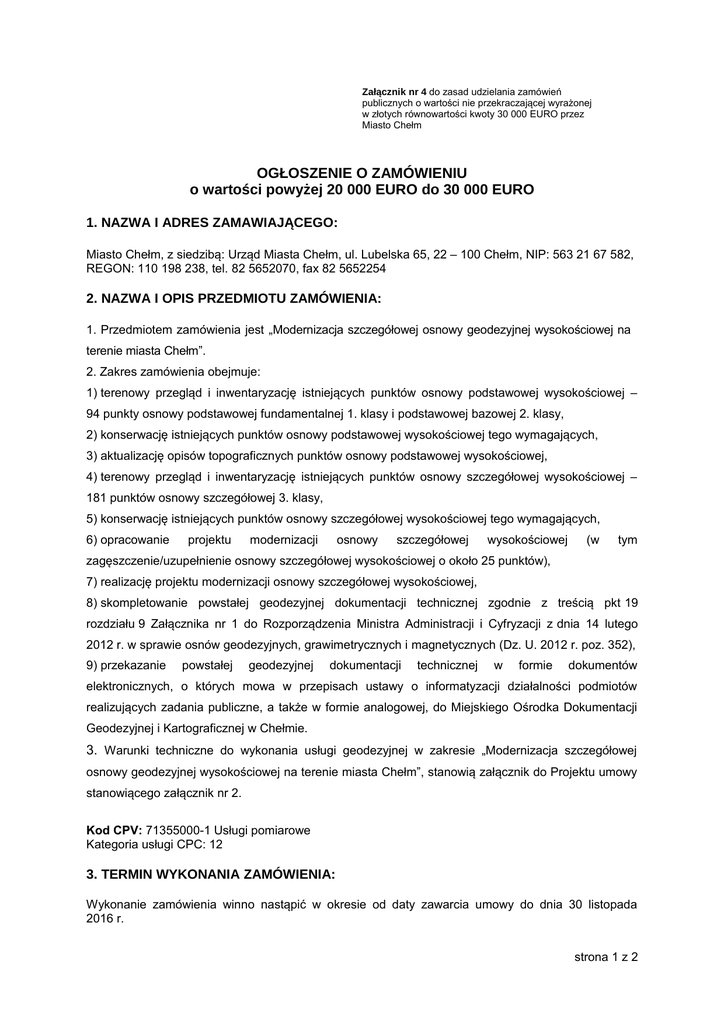 Załącznik nr 4 do zasad udzielania zamówień publicznych o wartości nie przekraczającej wyrażonej w złotych równowartości kwoty 30 000 EURO przez Miasto Chełm OGŁOSZENIE O ZAMÓWIENIU o wartości powyżej 20 000 EURO do 30 000 EURO 1. NAZWA I ADRES ZAMAWIAJĄCEGO: Miasto Chełm, z siedzibą: Urząd Miasta Chełm, ul. Lubelska 65, 22 – 100 Chełm, NIP: 563 21 67 582, REGON: 110 198 238, tel. 82 5652070, fax 82 5652254 2. NAZWA I OPIS PRZEDMIOTU ZAMÓWIENIA: 1. Przedmiotem zamówienia jest „Modernizacja szczegółowej osnowy geodezyjnej wysokościowej na terenie miasta Chełm”. 2. Zakres zamówienia obejmuje: 1) terenowy przegląd i inwentaryzację istniejących punktów osnowy podstawowej wysokościowej – 94 punkty osnowy podstawowej fundamentalnej 1. klasy i podstawowej bazowej 2. klasy, 2) konserwację istniejących punktów osnowy podstawowej wysokościowej tego wymagających, 3) aktualizację opisów topograficznych punktów osnowy podstawowej wysokościowej, 4) terenowy przegląd i inwentaryzację istniejących punktów osnowy szczegółowej wysokościowej – 181 punktów osnowy szczegółowej 3. klasy, 5) konserwację istniejących punktów osnowy szczegółowej wysokościowej tego wymagających, 6) opracowanie projektu modernizacji osnowy szczegółowej wysokościowej (w tym zagęszczenie/uzupełnienie osnowy szczegółowej wysokościowej o około 25 punktów), 7) realizację projektu modernizacji osnowy szczegółowej wysokościowej, 8) skompletowanie powstałej geodezyjnej dokumentacji technicznej zgodnie z treścią pkt 19 rozdziału 9 Załącznika nr 1 do Rozporządzenia Ministra Administracji i Cyfryzacji z dnia 14 lutego 2012 r. w sprawie osnów geodezyjnych, grawimetrycznych i magnetycznych (Dz. U. 2012 r. poz. 352), 9) przekazanie powstałej geodezyjnej dokumentacji technicznej w formie dokumentów elektronicznych, o których mowa w przepisach ustawy o informatyzacji działalności podmiotów realizujących zadania publiczne, a także w formie analogowej, do Miejskiego Ośrodka Dokumentacji Geodezyjnej i Kartograficznej w Chełmie. 3. Warunki techniczne do wykonania usługi geodezyjnej w zakresie „Modernizacja szczegółowej osnowy geodezyjnej wysokościowej na terenie miasta Chełm”, stanowią załącznik do Projektu umowy stanowiącego załącznik nr 2. Kod CPV: 71355000-1 Usługi pomiarowe Kategoria usługi CPC: 12 3. TERMIN WYKONANIA ZAMÓWIENIA: Wykonanie zamówienia winno nastąpić w okresie od daty zawarcia umowy do dnia 30 listopada 2016 r. strona 1 z 2 4. KRYTERIA OCENY OFERT I ICH ZNACZENIE ORAZ SPOSÓB OBLICZENIA PUNKTÓW: Zamawiający przy wyborze oferty posługiwać się kryterium „Cena 100%”. Liczba punktów przyznana za kryterium „Cena" n-tej oferty zostanie obliczona wg wzoru: Nc= Cn/Cbn x Kp x Wc gdzie: Cn Cbn Kp Wc - najniższa cena oferty - cena badanej oferty - współczynnik proporcjonalności = 100 - waga procentowa dla kryterium „Cena" = 100% 5. MIEJSCE I TERMIN SKŁADANIA OFERT: Oferty należy składać w Kancelarii ogólnej Urzędu Miasta Chełm, parter; ul. Lubelska 65, 22-100 Chełm lub za pośrednictwem poczty . Termin wpływu ofert do siedziby Zamawiającego upływa dnia 20 maja 2016r. o godz. 1000 6. SPOSÓB UZYSKANIA DOKUMENTÓW DOTYCZĄCYCH ZAMÓWIENIA: Dokumenty dotyczące przedmiotowego zamówienia dostępne są na stronie internetowej Zamawiającego pod adresem: http://www.umchelm.bip.lubelskie.pl oraz można je uzyskać pod adresem: Urząd Miasta Chełm, Wydział Geodezji, Kartografii i Mienia Komunalnego – Miejski Ośrodek Dokumentacji Geodezyjnej i Kartograficznej w Chełmie, pok. 15, Plac Niepodległości 1, 22-100 Chełm. Dyrektor Wydziału Geodezji, Kartografii i Mienia Komunalnego Ryszard Poniatowski ……………………………………… (data i podpis Dyrektora) ZASTĘPCA PREZYDENTA MIASTA CHEŁM mgr inż. Józef Górny ………………………………………………………..…………….. (data i podpis Prezydent Miasta lub innej osoby upoważnionej) strona 2 z 2
