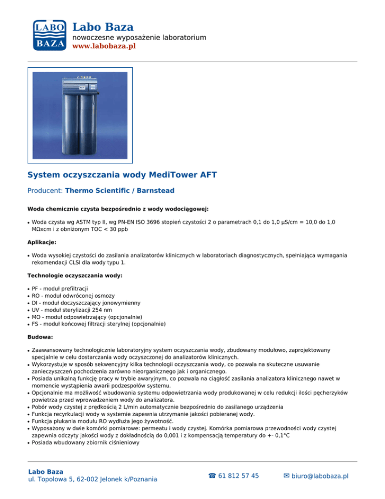 Labo Baza nowoczesne wyposażenie laboratorium www.labobaza.pl System oczyszczania wody MediTower AFT Producent: Thermo Scientific / Barnstead Woda chemicznie czysta bezpośrednio z wody wodociągowej: ● Woda czysta wg ASTM typ II, wg PN-EN ISO 3696 stopień czystości 2 o parametrach 0,1 do 1,0 µS/cm = 10,0 do 1,0 MΩxcm i z obniżonym TOC < 30 ppb Aplikacje: ● Woda wysokiej czystości do zasilania analizatorów klinicznych w laboratoriach diagnostycznych, spełniająca wymagania rekomendacji CLSI dla wody typu 1. Technologie oczyszczania wody: ● ● ● ● ● ● PF - moduł prefiltracji RO - moduł odwróconej osmozy DI - moduł doczyszczający jonowymienny UV - moduł sterylizacji 254 nm MO - moduł odpowietrzający (opcjonalnie) FS - moduł końcowej filtracji sterylnej (opcjonalnie) Budowa: ● ● ● ● ● ● ● ● ● Zaawansowany technologicznie laboratoryjny system oczyszczania wody, zbudowany modułowo, zaprojektowany specjalnie w celu dostarczania wody oczyszczonej do analizatorów klinicznych. Wykorzystuje w sposób sekwencyjny kilka technologii oczyszczania wody, co pozwala na skuteczne usuwanie zanieczyszczeń pochodzenia zarówno nieorganicznego jak i organicznego. Posiada unikalną funkcję pracy w trybie awaryjnym, co pozwala na ciągłość zasilania analizatora klinicznego nawet w momencie wystąpienia awarii podzespołów systemu. Opcjonalnie ma możliwość wbudowania systemu odpowietrzania wody produkowanej w celu redukcji ilości pęcherzyków powietrza przed wprowadzeniem wody do analizatora. Pobór wody czystej z prędkością 2 L/min automatycznie bezpośrednio do zasilanego urządzenia Funkcja recyrkulacji wody w systemie zapewnia utrzymanie jakości pobieranej wody. Funkcja płukania modułu RO wydłuża jego żywotność. Wyposażony w dwie komórki pomiarowe: permeatu i wody czystej. Komórka pomiarowa przewodności wody czystej zapewnia odczyty jakości wody z dokładnością do 0,001 i z kompensacją temperatury do +- 0,1°C Posiada wbudowany zbiornik ciśnieniowy Labo Baza ul. Topolowa 5, 62-002 Jelonek k/Poznania ☎ 61 812 57 45 ✉ [email protected] Labo Baza nowoczesne wyposażenie laboratorium www.labobaza.pl ● Urządzenie wyposażono w ruchomy panel sterowania z 4-linijkowym wyświetlaczem LCD do ustawienia pod dowolnym kątem oraz port RS 232. Tryb pracy: Automatyczną pracą urządzenia steruje oprogramowanie umożliwiające użytkownikowi wprowadzanie indywidualnych ustawień oraz odczyt parametrów pracy systemu. Dostępne ustawienia: ● ● ● ● ● ● ● ● ● ● ● ● ● ● wybór języka angielski /niemiecki /francuski przełączanie trybów pracy graniczna przewodność wody po odwróconej osmozie graniczna przewodność wody chemicznie czystej przełączanie odczytów przewodność / oporność graniczna temperatura pracy systemu włączanie / wyłączanie kompensacji temperatury długość czasu pracy prefiltracji długość czasu pracy lampy UV i jej intensywność długość czasu pracy systemu długość czasu płukania membrany RO (automatycznego i na żądanie) włączenie i wprowadzenie czasu trwania dezynfekcji systemu ustawienie częstotliwości wysyłania wydruków standardowych / przekroczenia wartości granicznych / wprowadzanych kodów dostępu blokada dostępu do ustawień przy użyciu kodów Dostępne odczyty: ● ● ● ● ● ● ● ● ● ● aktualny tryb pracy przewodność / oporność wody po odwróconej osmozie przewodność / oporność wody chemicznie czystej ilość godzin przepracowanych przez urządzenie temperatura pracy systemu pozostały czas trwania dezynfekcji systemu ilość godzin pracy prefiltracji ilość godzin pracy lampy UV i jej intensywność historia przekroczeń ustawień granicznych historia wprowadzania kodów dostępu JAKOŚĆ WODY Model MediTower AFT 60 / 120 / 140 Typ produkowanej wody wg ASTM Typ II Typ produkowanej wody wg CLSI TYP 1 Oporność 10,0-1,0 MΩxcm Przewodność 0,1 - 1,0 µS/cm Woda zasilająca Woda wodociągowa Wydajność produkcji wody na RO 60 / 120 / 140 L/h w 15°C Wydajność systemu na dzień 480 / 960 / 1120 L/dobę Prędkość podawania wody czystej 2,0 L/min Labo Baza ul. Topolowa 5, 62-002 Jelonek k/Poznania ☎ 61 812 57 45 ✉ [email protected] Labo Baza nowoczesne wyposażenie laboratorium www.labobaza.pl Ilość usuniętych bakterii i cząstek 99 % < 1CFU/ml Ilość usuniętych jonów soli 98,00% Liczba cząstek 0,2 µm < 1 / mL (z filtrem sterylnym) TOC < 30 ppb Zastosowanie wody Zasilanie analizatorów klinicznych. PARAMETRY TECHNICZNE URZĄDZENIA Wszystkie modele MediTower AFT Wysokość 1380 mm Szerokość x Głębokość 560 mm x 660 mm Waga netto 147-152- 157 kg (z pustym zbiornikiem) Przyłącze wody zasilającej 3/4 cala gwint zewn. zimna woda Woda wodociągowa Indeks koloidowy SDI < 3 Chlor < 0,1 mg/L Parametry wody zasilającej Mangan < 0,05 mg/L Żelazo < 0,05 mg/L pH = 4-11 Temperatura +2°do +35°C Ciśnienie 2 - 6 barów Ciśnienie robocze urządzenia 14 barów Zasilanie elektryczne 230V 50/60Hz Pobór energii 0,3 kW Zbiornika 10 L ciśnieniowy Port RS232 Kontakt Labo Baza ul. Topolowa 5, 62-002 Jelonek k/Poznania tel: 61 812 57 45 fax: 61 812 57 25 e-mail: [email protected] Labo Baza ul. Topolowa 5, 62-002 Jelonek k/Poznania ☎ 61 812 57 45 ✉ [email protected] Labo Baza nowoczesne wyposażenie laboratorium www.labobaza.pl www.labobaza.pl Źródło: http://www.labobaza.pl/produkt/system-oczyszczania-wody-meditower-aft/42 Labo Baza ul. Topolowa 5, 62-002 Jelonek k/Poznania ☎ 61 812 57 45 ✉ [email protected]