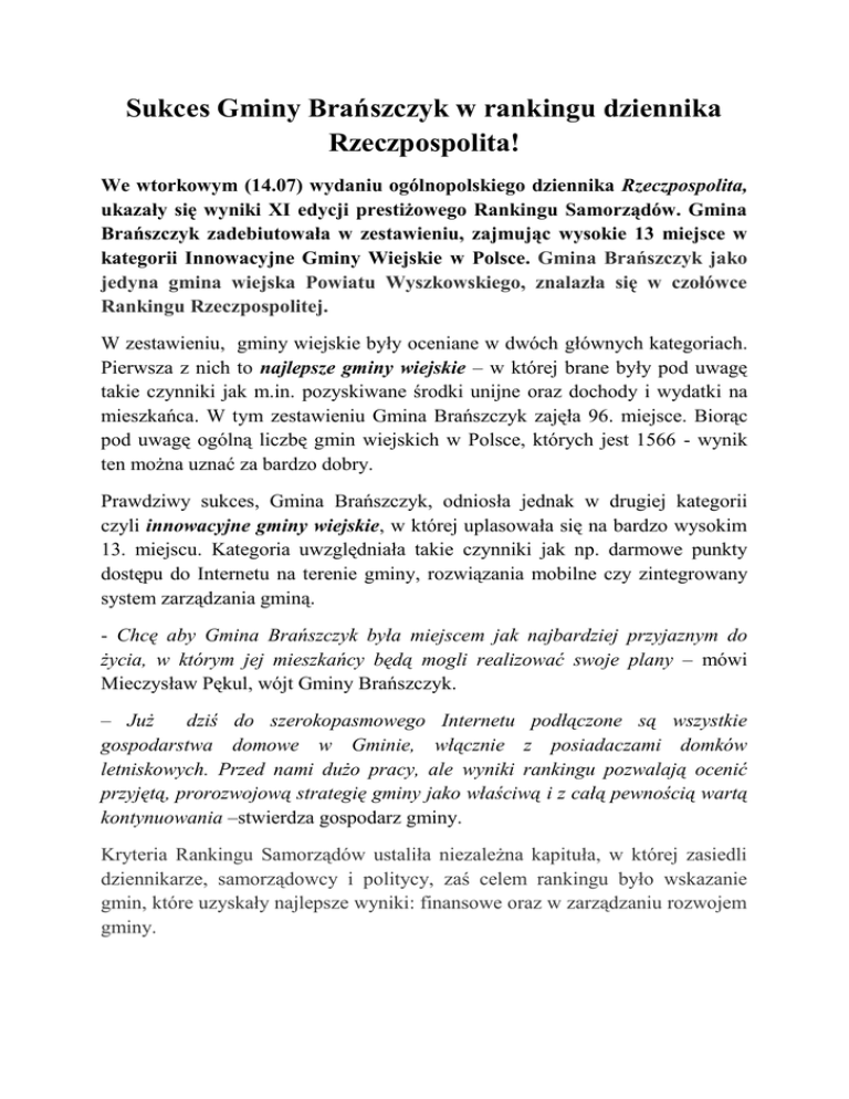 Sukces Gminy Brańszczyk w rankingu dziennika Rzeczpospolita! We wtorkowym (14.07) wydaniu ogólnopolskiego dziennika Rzeczpospolita, ukazały się wyniki XI edycji prestiżowego Rankingu Samorządów. Gmina Brańszczyk zadebiutowała w zestawieniu, zajmując wysokie 13 miejsce w kategorii Innowacyjne Gminy Wiejskie w Polsce. Gmina Brańszczyk jako jedyna gmina wiejska Powiatu Wyszkowskiego, znalazła się w czołówce Rankingu Rzeczpospolitej. W zestawieniu, gminy wiejskie były oceniane w dwóch głównych kategoriach. Pierwsza z nich to najlepsze gminy wiejskie – w której brane były pod uwagę takie czynniki jak m.in. pozyskiwane środki unijne oraz dochody i wydatki na mieszkańca. W tym zestawieniu Gmina Brańszczyk zajęła 96. miejsce. Biorąc pod uwagę ogólną liczbę gmin wiejskich w Polsce, których jest 1566 - wynik ten można uznać za bardzo dobry. Prawdziwy sukces, Gmina Brańszczyk, odniosła jednak w drugiej kategorii czyli innowacyjne gminy wiejskie, w której uplasowała się na bardzo wysokim 13. miejscu. Kategoria uwzględniała takie czynniki jak np. darmowe punkty dostępu do Internetu na terenie gminy, rozwiązania mobilne czy zintegrowany system zarządzania gminą. - Chcę aby Gmina Brańszczyk była miejscem jak najbardziej przyjaznym do życia, w którym jej mieszkańcy będą mogli realizować swoje plany – mówi Mieczysław Pękul, wójt Gminy Brańszczyk. – Już dziś do szerokopasmowego Internetu podłączone są wszystkie gospodarstwa domowe w Gminie, włącznie z posiadaczami domków letniskowych. Przed nami dużo pracy, ale wyniki rankingu pozwalają ocenić przyjętą, prorozwojową strategię gminy jako właściwą i z całą pewnością wartą kontynuowania –stwierdza gospodarz gminy. Kryteria Rankingu Samorządów ustaliła niezależna kapituła, w której zasiedli dziennikarze, samorządowcy i politycy, zaś celem rankingu było wskazanie gmin, które uzyskały najlepsze wyniki: finansowe oraz w zarządzaniu rozwojem gminy.