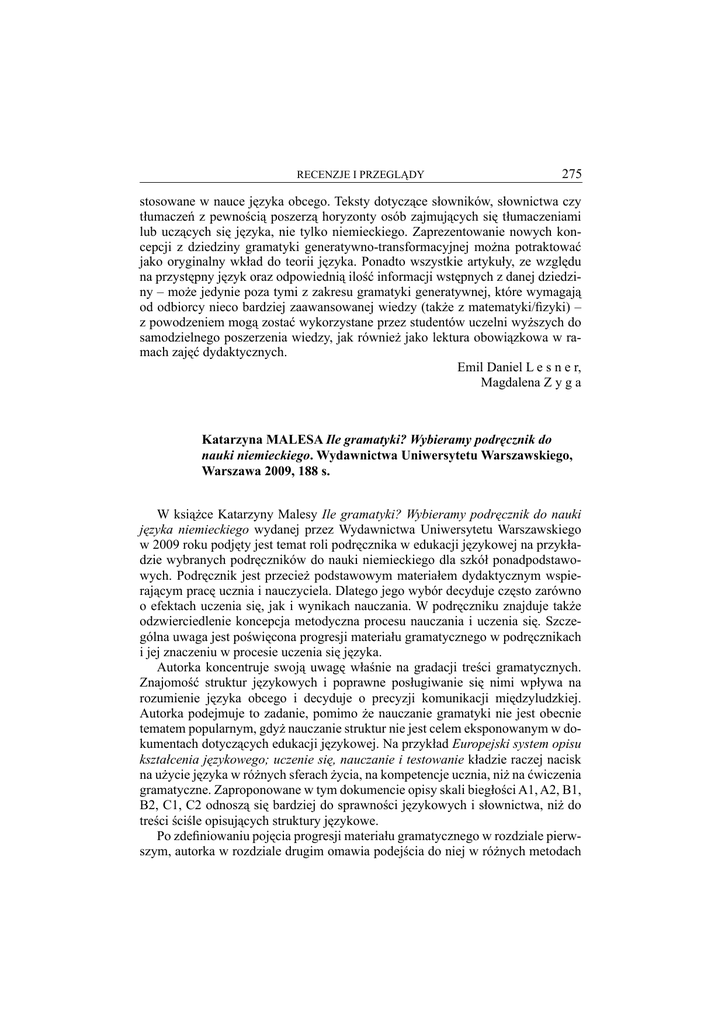 RECENZJE I PRZEGLĄDY 275 stosowane w nauce języka obcego. Teksty dotyczące słowników, słownictwa czy tłumaczeń z pewnością poszerzą horyzonty osób zajmujących się tłumaczeniami lub uczących się języka, nie tylko niemieckiego. Zaprezentowanie nowych koncepcji z dziedziny gramatyki generatywno-transformacyjnej można potraktować jako oryginalny wkład do teorii języka. Ponadto wszystkie artykuły, ze względu na przystępny język oraz odpowiednią ilość informacji wstępnych z danej dziedziny – może jedynie poza tymi z zakresu gramatyki generatywnej, które wymagają od odbiorcy nieco bardziej zaawansowanej wiedzy (także z matematyki/fizyki) – z powodzeniem mogą zostać wykorzystane przez studentów uczelni wyższych do samodzielnego poszerzenia wiedzy, jak również jako lektura obowiązkowa w ramach zajęć dydaktycznych. Emil Daniel L e s n e r, Magdalena Z y g a Katarzyna MALESA Ile gramatyki? Wybieramy podręcznik do nauki niemieckiego. Wydawnictwa Uniwersytetu Warszawskiego, Warszawa 2009, 188 s. W książce Katarzyny Malesy Ile gramatyki? Wybieramy podręcznik do nauki języka niemieckiego wydanej przez Wydawnictwa Uniwersytetu Warszawskiego w 2009 roku podjęty jest temat roli podręcznika w edukacji językowej na przykładzie wybranych podręczników do nauki niemieckiego dla szkół ponadpodstawowych. Podręcznik jest przecież podstawowym materiałem dydaktycznym wspierającym pracę ucznia i nauczyciela. Dlatego jego wybór decyduje często zarówno o efektach uczenia się, jak i wynikach nauczania. W podręczniku znajduje także odzwierciedlenie koncepcja metodyczna procesu nauczania i uczenia się. Szczególna uwaga jest poświęcona progresji materiału gramatycznego w podręcznikach i jej znaczeniu w procesie uczenia się języka. Autorka koncentruje swoją uwagę właśnie na gradacji treści gramatycznych. Znajomość struktur językowych i poprawne posługiwanie się nimi wpływa na rozumienie języka obcego i decyduje o precyzji komunikacji międzyludzkiej. Autorka podejmuje to zadanie, pomimo że nauczanie gramatyki nie jest obecnie tematem popularnym, gdyż nauczanie struktur nie jest celem eksponowanym w dokumentach dotyczących edukacji językowej. Na przykład Europejski system opisu kształcenia językowego; uczenie się, nauczanie i testowanie kładzie raczej nacisk na użycie języka w różnych sferach życia, na kompetencje ucznia, niż na ćwiczenia gramatyczne. Zaproponowane w tym dokumencie opisy skali biegłości A1, A2, B1, B2, C1, C2 odnoszą się bardziej do sprawności językowych i słownictwa, niż do treści ściśle opisujących struktury językowe. Po zdefiniowaniu pojęcia progresji materiału gramatycznego w rozdziale pierwszym, autorka w rozdziale drugim omawia podejścia do niej w różnych metodach 276 RECENZJE I PRZEGLĄDY nauczania języka obcego. Wiele uwagi poświęca strategiom nauczania i uczenia się języków i roli gramatyki oraz podręcznika w „strategicznym” indywidualnym podejściu do uczenia się języka obcego, które wpływa na samodzielność ucznia, czyli jego autonomię. Autorka szczegółowo opisuje trzyetapowe badanie edukacyjnego znaczenia materiału gramatycznego zawartego w podręczniku. Pozwala jej to przedstawić postęp w procesie wprowadzania coraz bardziej zaawansowanych treści gramatycznych, stopień sterowania, czyli obszar dowolności pozostawiony uczniowi w wykonywaniu ćwiczeń gramatycznych, a także opinie uczniów o podręcznikach i zawartym w nich materiale gramatycznym. W części pierwszej badań autorka formułuje kryteria pomiaru progresji w podręcznikach do nauki języka niemieckiego na poziomie początkującym. Buduje je w oparciu o struktury rządzące użyciem trzech podstawowych części mowy, czyli rzeczownikiem, czasownikiem i przymiotnikiem, precyzyjnie określając elementy każdej kategorii występujące w języku niemieckim. Znajomość reguł stosowania powyższych części mowy stanowi podstawę rozwijania sprawności językowych uczniów na tym etapie edukacji. Następnie autorka dokonuje wnikliwego pomiaru progresji w trzech wybranych podręcznikach do nauki języka niemieckiego: Themen neu, Delfin i Sowieso. Dalej, w rozdziale ósmym, w części drugiej badań, autorka analizuje stopień sterowania ćwiczeń gramatycznych. Ćwiczenia o największym stopniu sterowania, np. uzupełnianie luk, udzielanie odpowiedzi prawda/fałsz mają na celu automatyzację procesu przyswajania struktur. Nie wymagają od uczniów dużej twórczości językowej. Natomiast ćwiczenia o najmniejszym stopniu sterowania zawierają wprawdzie wskazówki dotyczące ich wykonania, ale pozwalają uczniowi na samodzielność w używaniu struktur języka. Są to na przykład ćwiczenia polegające na opisaniu obrazka, tłumaczeniu zdań z języka obcego lub na język obcy. Szczegółowe przedstawienie listy rodzajów ćwiczeń według stopnia sterowania pozwala autorce zbadać metody stosowane do utrwalania materiału językowego w wybranych podręcznikach. Trzecia część badań dotyczy opinii uczniów o opisywanych podręcznikach. Gimnazjaliści i licealiści z dwóch szkół warszawskich odpowiadali na pytania dotyczące swojej motywacji do nauki języka niemieckiego, strategii stosowanych w uczeniu się gramatyki oraz poziomu autonomii, tj. planowania wypowiedzi, monitorowania błędów, samooceny. Mieli także wyrazić opinię o podręczniku, określić jego wady i zalety oraz użyteczność. Oceniali także sposób prezentowania, wyjaśniania i ćwiczenia gramatyki w tych podręcznikach. Zastosowanie triangulacji w spojrzeniu na materiał gramatyczny zawarty w podręczniku pogłębia wiedzę o znaczeniu form prezentacji gramatyki i ćwiczeń wspomagających trudny proces przyswajania języka na początkowym etapie jego nauki oraz recepcji tych form przez ucznia. Omawiana książka stanowi cenną pozycję wydawniczą przydatną przede wszystkim nauczycielom języka niemieckieg
