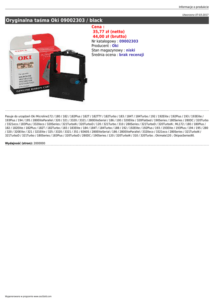 Informacje o produkcie Utworzono 07-03-2017 Oryginalna taśma Oki 09002303 / black Cena : 35,77 zł (netto) 44,00 zł (brutto) Nr katalogowy : 09002303 Producent : Oki Stan magazynowy : niski Średnia ocena : brak recenzji Pasuje do urządzeń Oki Microline172 / 180 / 182 / 182Plus / 182T / 182TTY / 182Turbo / 183 / 184T / 184Turbo / 192 / 192Elite / 192Plus / 193 / 193Elite / 193Plus / 194 / 195 / 280EliteParallel / 320 / 321 / 3320 / 3321 / 280EliteSerial / 186 / 100 / 320Elite / 320Flatbed / 190Series / 180Series / 280DC / 320Turbo / 3321eco / 183Plus / 3320eco / 320Series / 321TurboN / 320TurboD / 120 / 321Turbo / 310 / 280Series / 321TurboD / 320TurboN ; ML172 / 180 / 180Plus / 182 / 182Elite / 182Plus / 182T / 182Turbo / 183 / 183Elite / 184 / 184T / 184Turbo / 188 / 192 / 192Elite / 192Plus / 193 / 193Elite / 193Plus / 194 / 195 / 280 / 320 / 320Elite / 321 / 321Elite / 325 / 3320 / 3321 / 351 / 8360S / 280EliteSerial / 186 / 280EliteParallel / 3320eco / 3321eco / 280Series / 321TurboN / 321TurboD / 321Turbo / 180Series / 183Plus / 320TurboD / 280DC / 190Series / 120 / 320TurboN / 310 / 320Turbo ; Okimate120 ; OkiposSeries90. Wydajność (stron): 2000000 Wygenerowano w programie www.oscGold.com