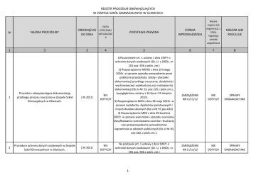REJESTR PROCEDUR OBOWIĄZUJĄCYCH W ZESPOLE SZKÓŁ GIMNAZJALNYCH W GLIWICACH PODSTAWA PRAWNA FORMA WPROWADZENIA Nazwa organu lub organizacji, z którą regulacją została uzgodniona 5 6 7 8 ZARZĄDZENIE NR 4 /11/12 NIE DOTYCZY SPRAWY ORGANIZACYJNE ZARZĄDZENIE NR 5 /11/12 NIE DOTYCZY SPRAWY ORGANIZACYJNE DATA Lp NAZWA PROCEDURY OBOWIĄZUJE OSTATNIEJ AKTUALIZAC OD DNIA JI 1 2 3 1 Procedura zabezpieczająca dokumentację przebiegu procesu nauczania w Zespole Szkół Gimnazjalnych w Gliwicach. 2 IX 2011r 2 Procedura ochrony danych osobowych w Zespole Szkół Gimnazjalnych w Gliwicach. 2 IX 2011r 4 1)Na postawie art. 1 ustawy z dnia 1997r o ochronie danych osobowych (Dz. U. z 2002r, nr 101 poz. 926 z późn. zm.) 2) Rozporządzenie MENiS z dnia 19 lutego 2002r. w sprawie sposobu prowadzenia przez publiczne przedszkola, szkoły i placówki dokumentacji przebiegu nauczania, działalności wychowawczej i opiekuńczej oraz rodzajów tej dokumentacji (Dz.U.Nr 23, poz.225 z późn.zm.), (uwzględniono zmiany z 16 lipca i 24 sierpnia NIE 2010r. DOTYCZY 3) Rozporządzenie MEN z dnia 28 maja 2010r. w sprawie świadectw, dyplomów państwowych i innych druków szkolnych (Dz.U.Nr 97,poz.624) 4) Rozporządzenie MEN z dnia 30 kwietnia 2007r. w sprawie warunków i sposobu oceniania, klasyfikowania i promowania uczniów i słuchaczy oraz przeprowadzania sprawdzianów i egzaminów w szkołach publicznych (Dz.U.Nr 83, poz.562, z późn.zm.). NIE DOTYCZY Na postawie art. 1 ustawy z dnia 1997r o ochronie danych osobowych (Dz. U. z 2002r, nr 101 poz. 926 z późn. zm.) 1 OBSZAR JAKI REGULUJE REJESTR PROCEDUR OBOWIĄZUJĄCYCH W ZESPOLE SZKÓŁ GIMNAZJALNYCH W GLIWICACH 3 Procedura udzielania i organizowania pomocy psychologicznopedagogicznej w Zespole Szkół Gimnazjalnych. 4 Procedura korzystania z szatni szkolnej. Wprowadzenia regulaminu obowiązującego w szatni szkolnej. 5 Procedura informowania szkoły przez ucznia/opiekuna o wyborze języka obcego na egzaminie gimnazjalnym. Zarządzenie związane z nową formą egzaminu gimnazjalnego – dotyczy składania przez uczniów i słuchaczy ZSG w Gliwicach deklaracji wyboru języka obcego na odpowiednim poziomie 7IX 2011r 1) Rozporządzenie Ministra Edukacji narodowej z dnia 17 listopada 2010 r. w sprawie zasad udzielania i organizacji pomocy psychologicznopedagogicznej w publicznych przedszkolach, szkołach i placówkach. 2) Rozporządzenie Ministra Edukacji narodowej z dnia 17 listopada 2010 r. w sprawie warunków organizowania kształcenia, wychowania, i opieki dla dzieci i młodzieży niepełnosprawnych oraz NIE niedostosowanych społecznie w przedszkolach, DOTYCZY szkołach i oddziałach ogólnodostępnych lub integracyjnych. 3) Rozporządzenie Ministra Edukacji narodowej z dnia 17listopada 2010 r. Zmieniające rozporządzenie w sprawie warunków i sposobu oceniania, klasyfikowania i promowania uczniów i słuchaczy oraz przeprowadzenia sprawdzianów i egzaminów w szkołach publicznych. Rozporządzenie Ministra Edukacji Narodowej z dnia 31 grudnia 2002 r. w sprawie bezpieczeństwa i higieny w publicznych i niepublicznych szkołach i placówkach (Dz. U. z dnia 22 stycznia 2003 r.), Statut Szkoły 7IX 2011r NIE DOTYCZY 7IX 2011r §42 ust.2e, § 38 ust. 6 Rozporządzenia Ministra Edukacji narodowej z dnia 30 kwietnia 2007r w sprawie warunków i sposobu oceniania, NIE klasyfikowania i promowania uczniów i słuchaczy DOTYCZY oraz przeprowadzania sprawdzianów i egzaminów w szkołach publicznych (Dz. U. nr 83, poz. 2 ZARZĄDZENIE NR 17 /11/12 NIE DOTYCZY SPRAWY ORGANIZACYJNE ZARZĄDZENIE NR 113 /11/12 NIE DOTYCZY SPRAWY ORGANIZACYJNE, DZIAŁALNOŚĆ STATUTOWA ZARZĄDZENIE NR 114 /11/12 NIE DOTYCZY SPRAWY ORGANIZACYJNE REJESTR PROCEDUR OBOWIĄZUJĄCYCH W ZESPOLE SZKÓŁ GIMNAZJALNYCH W GLIWICACH 6 Procedura postępowania w przypadku bezpośredniego i pośredniego zagrożenia życia i zdrowia uczniów, słuchaczy oraz pracowników w Zespole Szkół Gimnazjalnych w Gliwicach. 20 IX 2011r NIE DOTYCZY 1) Na podstawie art. 207¹ §1 punkt 3 i §2 oraz art. 209¹ § 1 punkt 2 Kodeksu Pracy 2) Ustawa o Systemie Oświaty z dnia 7 września 1991r. ( z późniejszymi zmianami ), 3) Statut ZARZĄDZENIE NR 118 /11/12 NIE DOTYCZY SPRAWY ORGANIZACYJNE 7 Procedury związane z kontrolą zarządczą. 28 IX 2011r NIE DOTYCZY Na podstawie art. 69 ust. 1 pkt 3) ustawy z dnia 27 sierpnia 2009 roku o finansach publicznych (Dz.U. Nr 157, poz. 1240 wraz z późn. zm.), ZARZĄDZENIE NR 186 /11/12 NIE DOTYCZY 8 Procedury obowiązujące przy przegladaniu monitoringu. Wyznaczenia osób uprawnionych do przeglądania i obsługi zapisów monitoringu szkoły. SPRAWY ORGANIZACYJNE, FINANSE I RACHUNKOWOŚĆ, PRAWO PRACY, DZIAŁALNOŚĆ STATUTOWA 29 IX 2011r NIE DOTYCZY Na postawie art. 1 ustawy z dnia 1997r o ochronie danych osobowych (Dz. U. z 2002r, nr 101 poz. 926 z późn. zm.) ZARZĄDZENIE NR 187 /11/12 NIE DOTYCZY SPRAWY ORGANIZACYJNE ZARZĄDZENIE NR 188 /11/12 NIE DOTYCZY FINANSE I RACHUNKOWOŚĆ ZARZĄDZENIE NR 189 /11/12 NIE DOTYCZY SPRAWY ORGANIZACYJNE 9 10 Procedur dotyczących: kontroli finansowej, dysponowania środkami pieniężnymi i udzielania zaliczek w Zespole Szkół Gimnazjalnych w Gliwicach. Procedura dokumentowania wypadków uczniów na terenie szkoły. W sprawie ustalenia okoliczności i przyczyn wypadków uczniów oraz sposobu ich dokumentowania. 1 X 2011r 10 X 2011r Ustawa o Finansach Publicznych DZ.U. z dnia 24.09.2009r NR 157, poz. 1240 wprowadzone zostają w ZSG w Gliwicach procedury NIE zapewniające kontrole pod względem legalności, DOTYCZY celowości i gospodarności. NIE DOTYCZY Rozporządzenie Ministra Edukacji Narodowej i Sportu z dnia 31 grudnia 20012r w sprawie bezpieczeństwa i higieny w publicznych i niepublicznych szkołach i placówkach (Dz.U. z 2003r Nr 6 poz. 69 – z późniejszymi zmianami) 3 REJESTR PROCEDUR OBOWIĄZUJĄCYCH W ZESPOLE SZKÓŁ GIMNAZJALNYCH W GLIWICACH Procedura dotycząca parkowania samochodów na terenie szkoły. W sprawie dróg 