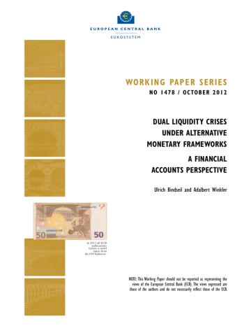 WORKING PAPER SERIES NO 1478 / OCTOBER 2012 DUAL LIQUIDITY CRISES UNDER ALTERNATIVE MONETARY FRAMEWORKS A FINANCIAL ACCOUNTS PERSPECTIVE Ulrich Bindseil and Adalbert Winkler ,Q DOO (&% SXEOLFDWLRQV IHDWXUH D PRWLI WDNHQ IURP WKH » EDQNQRWH NOTE: This Working Paper should not be reported as representing the views of the European Central Bank (ECB). The views expressed are those of the authors and do not necessarily reflect those of the ECB. Acknowledgements We wish to thank Ursula Bachmann, Marco Corsi, Juliusz Jablecki, Francesco Papadia, Aurel Schubert, Flemming Würtz, the participants to the 2012 annual meeting of the Ausschuss für Geldtheorie and Geldpolitik of the Verein für Socialpolitik on 16 March 2012, and an anonymous referee for useful comments. Ulrich Bindseil at European Central Bank, Kaiserstrasse 29, D-60311 Frankfurt am Main, Germany; e-mail: [email protected] Adalbert Winkler at Frankfurt School of Finance & Management, Sonnemannstr. 9-11, 60314 Frankfurt am Main, Germany; e-mail: [email protected] © European Central Bank, 2012 Address Kaiserstrasse 29, 60311 Frankfurt am Main, Germany Postal address Postfach 16 03 19, 60066 Frankfurt am Main, Germany Telephone +49 69 1344 0 Internet http://www.ecb.europa.eu Fax +49 69 1344 6000 All rights reserved. ISSN 1725-2806 (online) Any reproduction, publication and reprint in the form of a different publication, whether printed or produced electronically, in whole or in part, is permitted only with the explicit written authorisation of the ECB or the authors. This paper can be downloaded without charge from http://www.ecb.europa.eu or from the Social Science Research Network electronic library at http://ssrn.com/abstract_id=2150253. Information on all of the papers published in the ECB Working Paper Series can be found on the ECB’s website, http://www.ecb.europa.eu/pub/scientific/wps/date/html/index.en.html 1 Abstract This paper contributes to the literature on liquidity crises and central banks acting as lenders of last resort by capturing the mechanics of dual liquidity crises, i.e. funding crises which encompass both the private and the public sector, within a closed system of financial accounts. We analyze how the elasticity of liquidity provision by a central bank depends on the international monetary regime in which the relevant country operates and on specific central bank policies like collateral policies, monetary financing prohibitions and quantitative borrowing limits imposed on banks. Thus, it provides a firm basis for a comparative analysis of the ability of central banks to absorb shocks. Our main results are as follows: (1) A central bank that operates under a paper standard with a flexible exchange rate and without a monetary financing prohibition and other limits of borrowings placed on the banking sector is most flexible in containing a dual liquidity crisis. (2) Within any international monetary system characterized by some sort of a fixed exchange rate, including the gold standard, the availability of inter-central bank credit determines the elasticity of a crisis country’s central bank in providing liquidity to banks and financial markets. (3) A central bank of a euro area type monetary union has a similar capacity in managing dual liquidity crises as a country central bank operating under a paper standard with a flexible exchange rate as long as the integrity of the monetary union is beyond any doubt. JEL classification: E50, E58 Key words: liquidity crisis, bank run, sovereign debt crisis, central bank co-operation, gold standard 2 Non-technical summary Dual liquidity crises, i.e. funding crises which encompass both the private and the public sector of a country, have particularly devastating consequences for the real economy in the country concerned., Hence, it is of utmost importance to understand how dual liquidity crises unfold and how policies can manage those crises successfully. To this end, we capture the mechanics of dual liquidity crises within a closed system of financial accounts involving households/investors, corporates and government, banks and the central bank. Within this rigorous framework of analysis we are able to track how initial liquidity shocks feed through the financial system. Thus, our approach maps the financial flows the narrative literature on the unfolding and containment of liquidity crises loosely refers to in a systematic manner. Moreover, we can clearly identify the system’s constraints to absorb those shocks before they translate into forced deleveraging and asset fire sales. Based on this, we are able to categorize different cases of financial crises depending on the initial liquidity shock and on the institutional framework, including the international monetary regime, the country facing a dual liquidity crisis operates in. History provides ample illustration that the regular occurrence of liquidity crises is an inherent feature of modern market economies. Accordingly, we link our analytical framework to concrete crisis cases thereby testing its relevance in assessing policy options and constraints. The cases we refer to are the US subprime and Lehman collapse crisis of 2007/2008, the German banking and currency crisis in 1931 and the crisis in the euro area that started in 2010. They reflect that liquidity crises – although always showing the same crises dynamics – have occurred under a variety of institutional settings. Thus, we distinguish between central banks that issue money (i) under the paper standard and with a flexible exchange rate, (ii) with a fixed exchange rate (a) to gold, (b) to another country’s currency and (c) in the framework of a currency union. Our discussion of fixed exchange rate systems focus on asymmetric crisis cases, i.e. we distinguish between member countries within the system that face a dual liquidity crisis (“financially distressed countries”) and other member countries who are perceived as “safe haven countries”.