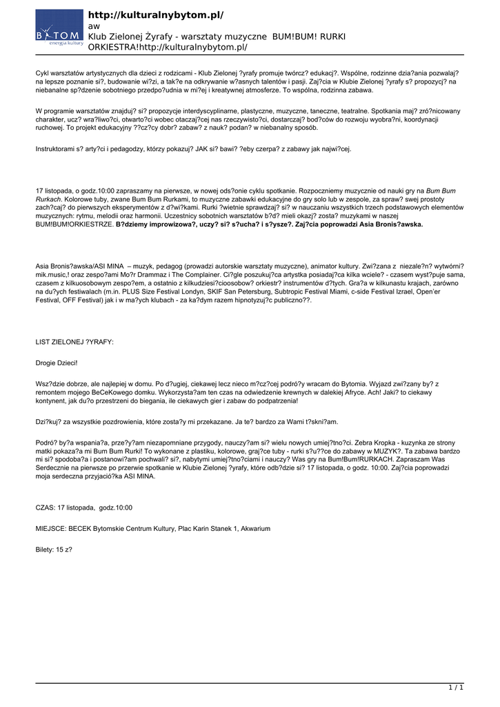http://kulturalnybytom.pl/ aw Klub Zielonej Żyrafy - warsztaty muzyczne BUM!BUM! RURKI ORKIESTRA!http://kulturalnybytom.pl/ Cykl warsztatów artystycznych dla dzieci z rodzicami - Klub Zielonej ?yrafy promuje twórcz? edukacj?. Wspólne, rodzinne dzia?ania pozwalaj? na lepsze poznanie si?, budowanie wi?zi, a tak?e na odkrywanie w?asnych talentów i pasji. Zaj?cia w Klubie Zielonej ?yrafy s? propozycj? na niebanalne sp?dzenie sobotniego przedpo?udnia w mi?ej i kreatywnej atmosferze. To wspólna, rodzinna zabawa. W programie warsztatów znajduj? si? propozycje interdyscyplinarne, plastyczne, muzyczne, taneczne, teatralne. Spotkania maj? zró?nicowany charakter, ucz? wra?liwo?ci, otwarto?ci wobec otaczaj?cej nas rzeczywisto?ci, dostarczaj? bod?ców do rozwoju wyobra?ni, koordynacji ruchowej. To projekt edukacyjny ??cz?cy dobr? zabaw? z nauk? podan? w niebanalny sposób. Instruktorami s? arty?ci i pedagodzy, którzy pokazuj? JAK si? bawi? ?eby czerpa? z zabawy jak najwi?cej. 17 listopada, o godz.10:00 zapraszamy na pierwsze, w nowej ods?onie cyklu spotkanie. Rozpoczniemy muzycznie od nauki gry na Bum Bum Rurkach. Kolorowe tuby, zwane Bum Bum Rurkami, to muzyczne zabawki edukacyjne do gry solo lub w zespole, za spraw? swej prostoty zach?caj? do pierwszych eksperymentów z d?wi?kami. Rurki ?wietnie sprawdzaj? si? w nauczaniu wszystkich trzech podstawowych elementów muzycznych: rytmu, melodii oraz harmonii. Uczestnicy sobotnich warsztatów b?d? mieli okazj? zosta? muzykami w naszej BUM!BUM!ORKIESTRZE. B?dziemy improwizowa?, uczy? si? s?ucha? i s?ysze?. Zaj?cia poprowadzi Asia Bronis?awska. Asia Bronis?awska/ASI MINA – muzyk, pedagog (prowadzi autorskie warsztaty muzyczne), animator kultury. Zwi?zana z niezale?n? wytwórni? mik.music,! oraz zespo?ami Mo?r Drammaz i The Complainer. Ci?gle poszukuj?ca artystka posiadaj?ca kilka wciele? - czasem wyst?puje sama, czasem z kilkuosobowym zespo?em, a ostatnio z kilkudziesi?cioosobow? orkiestr? instrumentów d?tych. Gra?a w kilkunastu krajach, zarówno na du?ych festiwalach (m.in. PLUS Size Festival Londyn, SKIF San Petersburg, Subtropic Festival Miami, c-side Festival Izrael, Open’er Festival, OFF Festival) jak i w ma?ych klubach - za ka?dym razem hipnotyzuj?c publiczno??. LIST ZIELONEJ ?YRAFY: Drogie Dzieci! Wsz?dzie dobrze, ale najlepiej w domu. Po d?ugiej, ciekawej lecz nieco m?cz?cej podró?y wracam do Bytomia. Wyjazd zwi?zany by? z remontem mojego BeCeKowego domku. Wykorzysta?am ten czas na odwiedzenie krewnych w dalekiej Afryce. Ach! Jaki? to ciekawy kontynent, jak du?o przestrzeni do biegania, ile ciekawych gier i zabaw do podpatrzenia! Dzi?kuj? za wszystkie pozdrowienia, które zosta?y mi przekazane. Ja te? bardzo za Wami t?skni?am. Podró? by?a wspania?a, prze?y?am niezapomniane przygody, nauczy?am si? wielu nowych umiej?tno?ci. Zebra Kropka - kuzynka ze strony matki pokaza?a mi Bum Bum Rurki! To wykonane z plastiku, kolorowe, graj?ce tuby - rurki s?u??ce do zabawy w MUZYK?. Ta zabawa bardzo mi si? spodoba?a i postanowi?am pochwali? si?, nabytymi umiej?tno?ciami i nauczy? Was gry na Bum!Bum!RURKACH. Zapraszam Was Serdecznie na pierwsze po przerwie spotkanie w Klubie Zielonej ?yrafy, które odb?dzie si? 17 listopada, o godz. 10:00. Zaj?cia poprowadzi moja serdeczna przyjació?ka ASI MINA. CZAS: 17 listopada, godz.10:00 MIEJSCE: BECEK Bytomskie Centrum Kultury, Plac Karin Stanek 1, Akwarium Bilety: 15 z? 1/1 Powered by TCPDF (www.tcpdf.org)