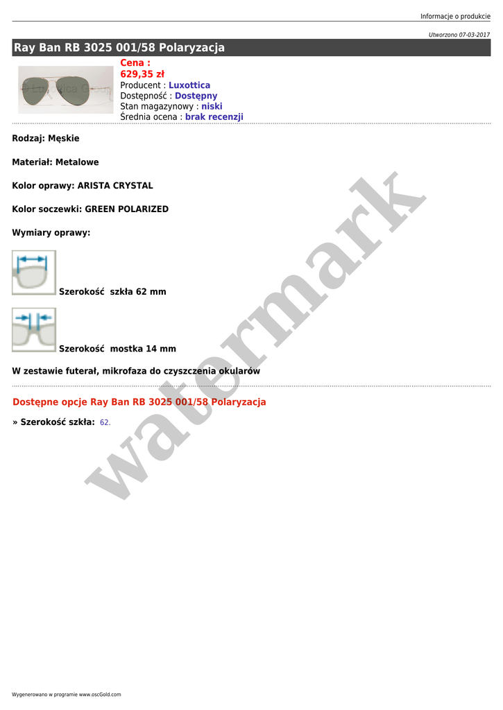 Informacje o produkcie Utworzono 07-03-2017 Ray Ban RB 3025 001/58 Polaryzacja Cena : 629,35 zł Producent : Luxottica Dostępność : Dostępny Stan magazynowy : niski Średnia ocena : brak recenzji Rodzaj: Męskie Materiał: Metalowe er m ar k Kolor oprawy: ARISTA CRYSTAL Kolor soczewki: GREEN POLARIZED Wymiary oprawy: Szerokość szkła 62 mm Szerokość mostka 14 mm W zestawie futerał, mikrofaza do czyszczenia okularów at Dostępne opcje Ray Ban RB 3025 001/58 Polaryzacja w » Szerokość szkła: 62. Wygenerowano w programie www.oscGold.com