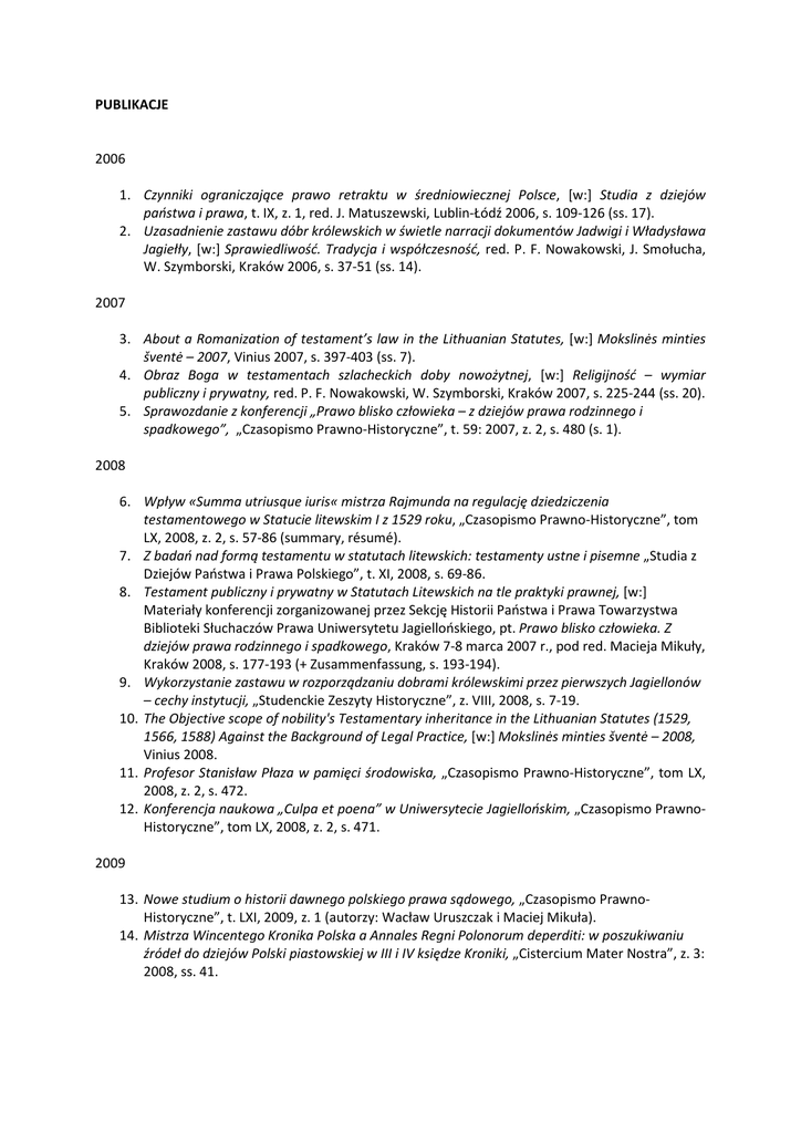 PUBLIKACJE 2006 1. Czynniki ograniczające prawo retraktu w średniowiecznej Polsce, [w:] Studia z dziejów państwa i prawa, t. IX, z. 1, red. J. Matuszewski, Lublin-Łódź 2006, s. 109-126 (ss. 17). 2. Uzasadnienie zastawu dóbr królewskich w świetle narracji dokumentów Jadwigi i Władysława Jagiełły, [w:] Sprawiedliwość. Tradycja i współczesność, red. P. F. Nowakowski, J. Smołucha, W. Szymborski, Kraków 2006, s. 37-51 (ss. 14). 2007 3. About a Romanization of testament’s law in the Lithuanian Statutes, [w:] Mokslinės minties šventė – 2007, Vinius 2007, s. 397-403 (ss. 7). 4. Obraz Boga w testamentach szlacheckich doby nowożytnej, [w:] Religijność – wymiar publiczny i prywatny, red. P. F. Nowakowski, W. Szymborski, Kraków 2007, s. 225-244 (ss. 20). 5. Sprawozdanie z konferencji „Prawo blisko człowieka – z dziejów prawa rodzinnego i spadkowego”, „Czasopismo Prawno-Historyczne”, t. 59: 2007, z. 2, s. 480 (s. 1). 2008 6. Wpływ «Summa utriusque iuris« mistrza Rajmunda na regulację dziedziczenia testamentowego w Statucie litewskim I z 1529 roku, „Czasopismo Prawno-Historyczne”, tom LX, 2008, z. 2, s. 57-86 (summary, résumé). 7. Z badań nad formą testamentu w statutach litewskich: testamenty ustne i pisemne „Studia z Dziejów Państwa i Prawa Polskiego”, t. XI, 2008, s. 69-86. 8. Testament publiczny i prywatny w Statutach Litewskich na tle praktyki prawnej, [w:] Materiały konferencji zorganizowanej przez Sekcję Historii Państwa i Prawa Towarzystwa Biblioteki Słuchaczów Prawa Uniwersytetu Jagiellońskiego, pt. Prawo blisko człowieka. Z dziejów prawa rodzinnego i spadkowego, Kraków 7-8 marca 2007 r., pod red. Macieja Mikuły, Kraków 2008, s. 177-193 (+ Zusammenfassung, s. 193-194). 9. Wykorzystanie zastawu w rozporządzaniu dobrami królewskimi przez pierwszych Jagiellonów – cechy instytucji, „Studenckie Zeszyty Historyczne”, z. VIII, 2008, s. 7-19. 10. The Objective scope of nobility's Testamentary inheritance in the Lithuanian Statutes (1529, 1566, 1588) Against the Background of Legal Practice, [w:] Mokslinės minties šventė – 2008, Vinius 2008. 11. Profesor Stanisław Płaza w pamięci środowiska, „Czasopismo Prawno-Historyczne”, tom LX, 2008, z. 2, s. 472. 12. Konferencja naukowa „Culpa et poena” w Uniwersytecie Jagiellońskim, „Czasopismo PrawnoHistoryczne”, tom LX, 2008, z. 2, s. 471. 2009 13. Nowe studium o historii dawnego polskiego prawa sądowego, „Czasopismo PrawnoHistoryczne”, t. LXI, 2009, z. 1 (autorzy: Wacław Uruszczak i Maciej Mikuła). 14. Mistrza Wincentego Kronika Polska a Annales Regni Polonorum deperditi: w poszukiwaniu źródeł do dziejów Polski piastowskiej w III i IV księdze Kroniki, „Cistercium Mater Nostra”, z. 3: 2008, ss. 41. REDAKCJE Prawo blisko człowieka. Z dziejów prawa rodzinnego i spadkowego, pod red. Macieja Mikuły, Kraków 2008 (ss. 206).
