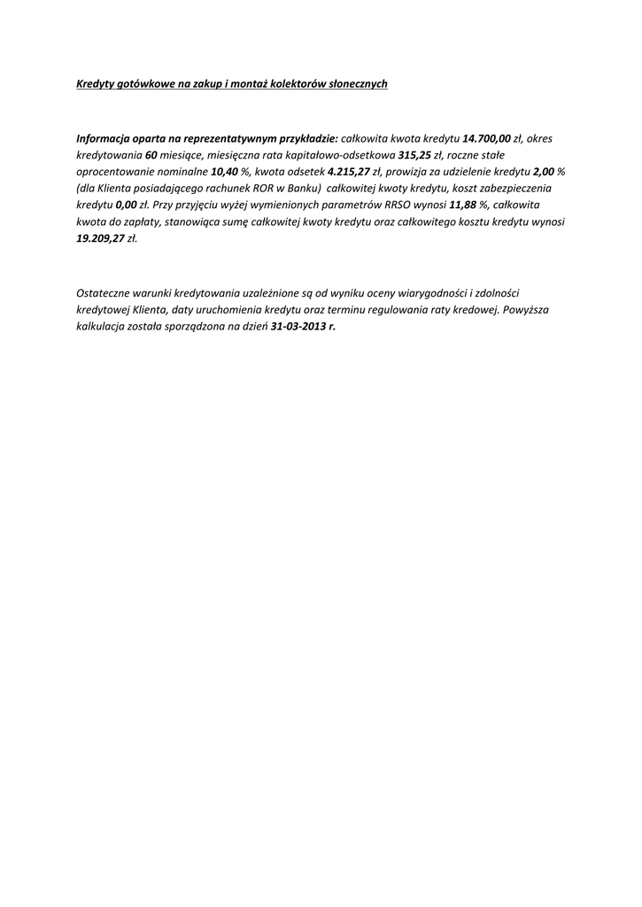 Kredyty gotówkowe na zakup i montaż kolektorów słonecznych Informacja oparta na reprezentatywnym przykładzie: całkowita kwota kredytu 14.700,00 zł, okres kredytowania 60 miesiące, miesięczna rata kapitałowo-odsetkowa 315,25 zł, roczne stałe oprocentowanie nominalne 10,40 %, kwota odsetek 4.215,27 zł, prowizja za udzielenie kredytu 2,00 % (dla Klienta posiadającego rachunek ROR w Banku) całkowitej kwoty kredytu, koszt zabezpieczenia kredytu 0,00 zł. Przy przyjęciu wyżej wymienionych parametrów RRSO wynosi 11,88 %, całkowita kwota do zapłaty, stanowiąca sumę całkowitej kwoty kredytu oraz całkowitego kosztu kredytu wynosi 19.209,27 zł. Ostateczne warunki kredytowania uzależnione są od wyniku oceny wiarygodności i zdolności kredytowej Klienta, daty uruchomienia kredytu oraz terminu regulowania raty kredowej. Powyższa kalkulacja została sporządzona na dzieo 31-03-2013 r.
