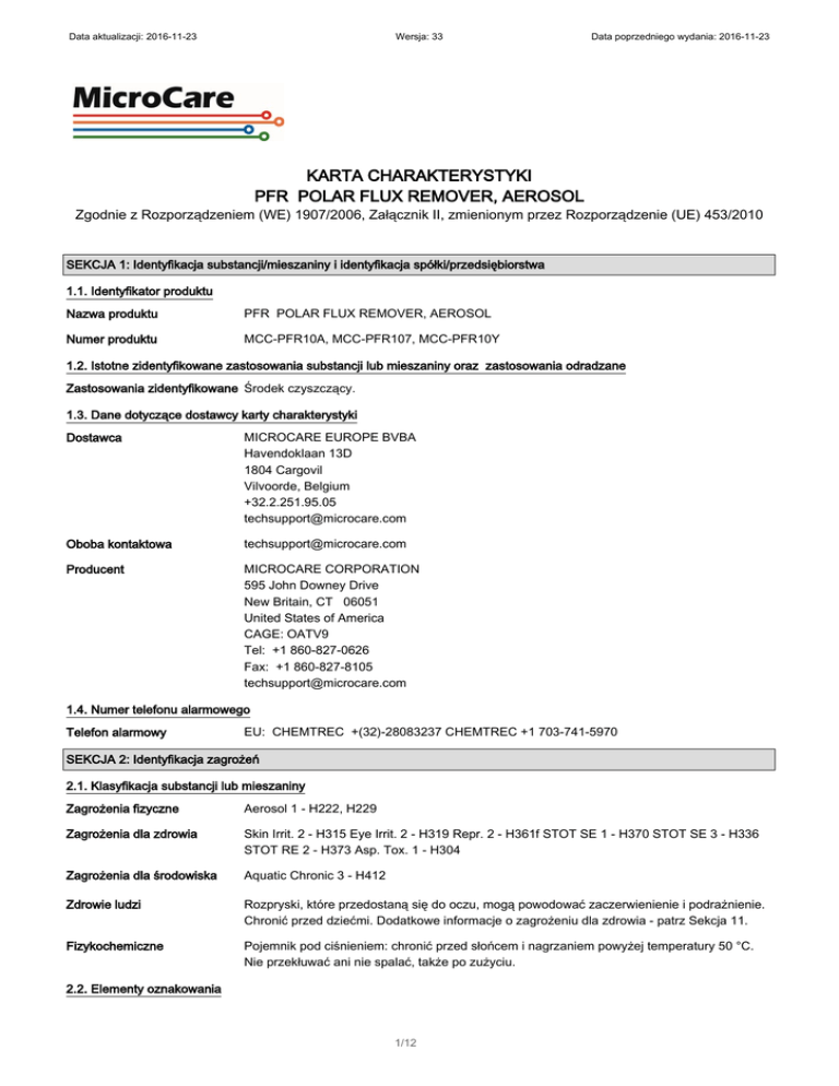 Data aktualizacji: 2016-11-23 Wersja: 33 Data poprzedniego wydania: 2016-11-23 KARTA CHARAKTERYSTYKI PFR POLAR FLUX REMOVER, AEROSOL Zgodnie z Rozporządzeniem (WE) 1907/2006, Załącznik II, zmienionym przez Rozporządzenie (UE) 453/2010 SEKCJA 1: Identyfikacja substancji/mieszaniny i identyfikacja spółki/przedsiębiorstwa 1.1. Identyfikator produktu Nazwa produktu PFR POLAR FLUX REMOVER, AEROSOL Numer produktu MCC-PFR10A, MCC-PFR107, MCC-PFR10Y 1.2. Istotne zidentyfikowane zastosowania substancji lub mieszaniny oraz zastosowania odradzane Zastosowania zidentyfikowane Środek czyszczący. 1.3. Dane dotyczące dostawcy karty charakterystyki Dostawca MICROCARE EUROPE BVBA Havendoklaan 13D 1804 Cargovil Vilvoorde, Belgium +32.2.251.95.05 [email protected] Oboba kontaktowa [email protected] Producent MICROCARE CORPORATION 595 John Downey Drive New Britain, CT 06051 United States of America CAGE: OATV9 Tel: +1 860-827-0626 Fax: +1 860-827-8105 [email protected] 1.4. Numer telefonu alarmowego Telefon alarmowy EU: CHEMTREC +(32)-28083237 CHEMTREC +1 703-741-5970 SEKCJA 2: Identyfikacja zagrożeń 2.1. Klasyfikacja substancji lub mieszaniny Zagrożenia fizyczne Aerosol 1 - H222, H229 Zagrożenia dla zdrowia Skin Irrit. 2 - H315 Eye Irrit. 2 - H319 Repr. 2 - H361f STOT SE 1 - H370 STOT SE 3 - H336 STOT RE 2 - H373 Asp. Tox. 1 - H304 Zagrożenia dla środowiska Aquatic Chronic 3 - H412 Zdrowie ludzi Rozpryski, które przedostaną się do oczu, mogą powodować zaczerwienienie i podrażnienie. Chronić przed dziećmi. Dodatkowe informacje o zagrożeniu dla zdrowia - patrz Sekcja 11. Fizykochemiczne Pojemnik pod ciśnieniem: chronić przed słońcem i nagrzaniem powyżej temperatury 50 °C. Nie przekłuwać ani nie spalać, także po zużyciu. 2.2. Elementy oznakowania 1/12 Data aktualizacji: 2016-11-23 Wersja: 33 Data poprzedniego wydania: 2016-11-23 PFR POLAR FLUX REMOVER, AEROSOL Piktogram Hasło ostrzegawcze Niebezpieczeństwo Zwroty wskazujące rodzaj zagrożenia H222 Skrajnie łatwopalny aerozol. H229 Pojemnik pod ciśnieniem: Ogrzanie grozi wybuchem. H315 Działa drażniąco na skórę. H319 Działa drażniąco na oczy. H336 Może wywoływać uczucie senności lub zawroty głowy. H361f Podejrzewa się, że działa szkodliwie na płodność. H370 Powoduje uszkodzenie narządów . H373 Może powodować uszkodzenie narządów poprzez długotrwałe lub narażenie powtarzane. H412 Działa szkodliwie na organizmy wodne, powodując długotrwałe skutki. Zwroty wskazujące środki ostrożności P210 Przechowywać z dala od źródeł ciepła, gorących powierzchni, źródeł iskrzenia, otwartego ognia i innych źródeł zapłonu. Nie palić. P251 Nie przekłuwać ani nie spalać, nawet po zużyciu. P261 Unikać wdychania par/ rozpylonej cieczy. P305+P351+P338 W PRZYPADKU DOSTANIA SIĘ DO OCZU: Ostrożnie płukać wodą przez kilka minut. Wyjąć soczewki kontaktowe, jeżeli są i można je łatwo usunąć. Nadal płukać. P314 W przypadku złego samopoczucia zasięgnąć porady/ zgłosić się pod opiekę lekarza. P410+P412 Chronić przed światłem słonecznym. Nie wystawiać na działanie temperatury przekraczającej 50 °C/122°F Informacje uzupełniające na etykiecie. RCH001a Tylko do użytku w instalacjach przemysłowych. EUH210 Karta charakterystyki dostępna na żądanie. Zawiera ACETON, HEKSAN (IZOMER O PROSTYM ŁAŃCUCHU WĘGLOWYM TZW. N-HEKSAN) 2/12 Data aktualizacji: 2016-11-23 Wersja: 33 Data poprzedniego wydania: 2016-11-23 PFR POLAR FLUX REMOVER, AEROSOL Dodatkowe zwroty określające P201 Przed użyciem zapoznać się ze specjalnymi środkami ostrożności. środki ostrożności P202 Nie używać przed zapoznaniem się i zrozumieniem wszystkich środków bezpieczeństwa. P211 Nie rozpylać nad otwartym ogniem lub innym źródłem zapłonu. P260 Nie wdychać par/ rozpylonej cieczy. P264 Dokładnie umyć zanieczyszczoną skórę po użyciu. P271 Stosować wyłącznie na zewnątrz lub w dobrze wentylowanym pomieszczeniu. P273 Unikać uwolnienia do środowiska. P280 Stosować rękawice ochronne/ odzież ochronną/ ochronę oczu/ ochronę twarzy. P302+P352 W PRZYPADKU KONTAKTU ZE SKÓRĄ: Umyć dużą ilością wody. P304+P340 W PRZYPADKU DOSTANIA SIĘ DO DRÓG ODDECHOWYCH: wyprowadzić lub wynieść poszkodowanego na świeże powietrze i zapewnić mu warunki do swobodnego oddychania. P308+P313 W przypadku narażenia lub styczności: Skontaktować się z OŚRODKIEM ZATRUĆ/ lekarzem. P312 W przypadku złego samopoczucia skontaktować się z OŚRODKIEM ZATRUĆ/ lekarzem. P321 Zastosować określone leczenie (patrz zalecenia medyczne na etykiecie). P332+P313 W przypadku wystąpienia podrażnienia skóry: Zasięgnąć porady/ zgłosić się pod opiekę lekarza. P337+P313 W przypadku utrzymywania się działania drażniącego na oczy: Zasięgnąć porady/ zgłosić się pod opiekę lekarza. P362+P364 Zanieczyszczoną odzież zdjąć i wyprać przed ponownym użyciem. P403+P233 Przechowywać w dobrze wentylowanym miejscu. Przechowywać pojemnik szczelnie zamknięty. P405 Przechowywać pod zamknięciem. P501 Zawartość/ pojemnik usuwać zgodnie z krajowymi przepisami. 2.3. Inne zagrożenia Produkt nie zawiera żadnych substancji sklasyfikowanych jako PBT lub vPvB. SEKCJA 3: Skład/informacja o składnikach 3.2. Mieszaniny ACETON Numer CAS: 67-64-1 30-60% Numer WE: 200-662-2 Klasyfikacja Flam. Liq. 2 - H225 Eye Irrit. 2 - H319 STOT SE 3 - H336 TRANS-1,3,3,3-TETRAFLUOROPROP-1-ENE Numer CAS: 29118-24-9 10-30% Numer WE: 471-480-0 Klasyfikacja Press. Gas, Liquefied - H280 3/12 Data aktualizacji: 2016-11-23 Wersja: 33 Data poprzedniego wydania: 2016-11-23 PFR POLAR FLUX REMOVER, AEROSOL HEKSAN (IZOMER O PROSTYM ŁAŃCUCHU WĘGLOWYM TZW. N-HEKSAN) Numer CAS: 110-54-3 10-30% Numer WE: 203-777-6 Klasyfikacja Flam. Liq. 2 - H225 Skin Irrit. 2 - H315 Repr. 2 - H361f STOT SE 3 - H336 STOT RE 2 - H373 Asp. Tox. 1 - H304 Aquatic Chronic 2 - H411 METANOL <1% Numer CAS: 67-56-1 Numer WE: 200-659-6 Klasyfikac