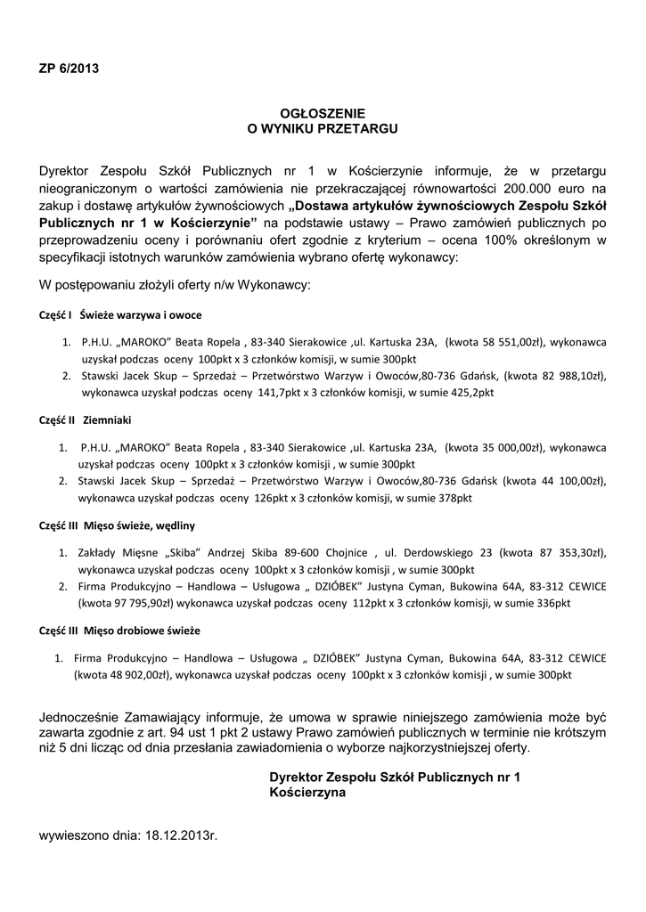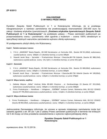 ZP 6/2013 OGŁOSZENIE O WYNIKU PRZETARGU Dyrektor Zespołu Szkół Publicznych nr 1 w Kościerzynie informuje, że w przetargu nieograniczonym o wartości zamówienia nie przekraczającej równowartości 200.000 euro na zakup i dostawę artykułów żywnościowych „Dostawa artykułów żywnościowych Zespołu Szkół Publicznych nr 1 w Kościerzynie” na podstawie ustawy – Prawo zamówień publicznych po przeprowadzeniu oceny i porównaniu ofert zgodnie z kryterium – ocena 100% określonym w specyfikacji istotnych warunków zamówienia wybrano ofertę wykonawcy: W postępowaniu złożyli oferty n/w Wykonawcy: Część I Świeże warzywa i owoce 1. P.H.U. „MAROKO” Beata Ropela , 83-340 Sierakowice ,ul. Kartuska 23A, (kwota 58 551,00zł), wykonawca uzyskał podczas oceny 100pkt x 3 członków komisji, w sumie 300pkt 2. Stawski Jacek Skup – Sprzedaż – Przetwórstwo Warzyw i Owoców,80-736 Gdańsk, (kwota 82 988,10zł), wykonawca uzyskał podczas oceny 141,7pkt x 3 członków komisji, w sumie 425,2pkt Część II Ziemniaki 1. P.H.U. „MAROKO” Beata Ropela , 83-340 Sierakowice ,ul. Kartuska 23A, (kwota 35 000,00zł), wykonawca uzyskał podczas oceny 100pkt x 3 członków komisji , w sumie 300pkt 2. Stawski Jacek Skup – Sprzedaż – Przetwórstwo Warzyw i Owoców,80-736 Gdańsk (kwota 44 100,00zł), wykonawca uzyskał podczas oceny 126pkt x 3 członków komisji, w sumie 378pkt Część III Mięso świeże, wędliny 1. Zakłady Mięsne „Skiba” Andrzej Skiba 89-600 Chojnice , ul. Derdowskiego 23 (kwota 87 353,30zł), wykonawca uzyskał podczas oceny 100pkt x 3 członków komisji , w sumie 300pkt 2. Firma Produkcyjno – Handlowa – Usługowa „ DZIÓBEK” Justyna Cyman, Bukowina 64A, 83-312 CEWICE (kwota 97 795,90zł) wykonawca uzyskał podczas oceny 112pkt x 3 członków komisji, w sumie 336pkt Część III Mięso drobiowe świeże 1. Firma Produkcyjno – Handlowa – Usługowa „ DZIÓBEK” Justyna Cyman, Bukowina 64A, 83-312 CEWICE (kwota 48 902,00zł), wykonawca uzyskał podczas oceny 100pkt x 3 członków komisji , w sumie 300pkt Jednocześnie Zamawiający informuje, że umowa w sprawie niniejszego zamówienia może być zawarta zgodnie z art. 94 ust 1 pkt 2 ustawy Prawo zamówień publicznych w terminie nie krótszym niż 5 dni licząc od dnia przesłania zawiadomienia o wyborze najkorzystniejszej oferty. Dyrektor Zespołu Szkół Publicznych nr 1 Kościerzyna wywieszono dnia: 18.12.2013r.