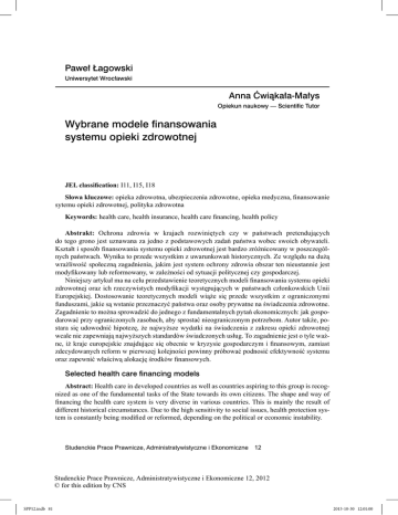Paweł Łagowski Uniwersytet Wrocławski Anna Ćwiąkała-Małys Opiekun naukowy — Scientific Tutor Wybrane modele finansowania systemu opieki zdrowotnej JEL classification: I11, I15, I18 Słowa kluczowe: opieka zdrowotna, ubezpieczenia zdrowotne, opieka medyczna, finansowanie sytemu opieki zdrowotnej, polityka zdrowotna Keywords: health care, health insurance, health care financing, health policy Abstrakt: Ochrona zdrowia w krajach rozwiniętych czy w państwach pretendujących do tego grono jest uznawana za jedno z podstawowych zadań państwa wobec swoich obywateli. Kształt i sposób finansowania systemu opieki zdrowotnej jest bardzo zróżnicowany w poszczególnych państwach. Wynika to przede wszystkim z uwarunkowań historycznych. Ze względu na dużą wrażliwość społeczną zagadnienia, jakim jest system ochrony zdrowia obszar ten nieustannie jest modyfikowany lub reformowany, w zależności od sytuacji politycznej czy gospodarczej. Niniejszy artykuł ma na celu przedstawienie teoretycznych modeli finansowania systemu opieki zdrowotnej oraz ich rzeczywistych modyfikacji występujących w państwach członkowskich Unii Europejskiej. Dostosowanie teoretycznych modeli wiąże się przede wszystkim z ograniczonymi funduszami, jakie są wstanie przeznaczyć państwa oraz osoby prywatne na świadczenia zdrowotne. Zagadnienie to można sprowadzić do jednego z fundamentalnych pytań ekonomicznych: jak gospodarować przy ograniczonych zasobach, aby sprostać nieograniczonym potrzebom. Autor także, postara się udowodnić hipotezę, że najwyższe wydatki na świadczenia z zakresu opieki zdrowotnej wcale nie zapewniają najwyższych standardów świadczonych usług. To zagadnienie jest o tyle ważne, iż kraje europejskie znajdujące się obecnie w kryzysie gospodarczym i finansowym, zamiast zdecydowanych reform w pierwszej kolejności powinny próbować podnosić efektywność systemu oraz zapewnić właściwą alokację środków finansowych. Selected health care financing models Abstract: Health care in developed countries as well as countries aspiring to this group is recognized as one of the fundamental tasks of the State towards its own citizens. The shape and way of financing the health care system is very diverse in various countries. This is mainly the result of different historical circumstances. Due to the high sensitivity to social issues, health protection system is constantly being modified or reformed, depending on the political or economic instability. Studenckie Prace Prawnicze, Administratywistyczne i Ekonomiczne 12 Studenckie Prace Prawnicze, Administratywistyczne i Ekonomiczne 12, 2012 © for this edition by CNS SPP12.indb 81 2013-10-30 12:01:00 82 | PAWEŁ ŁAGOWSKI This article aims to present the theoretical models of financing health care system and their actual modifications found in the Member States of the European Union. The adaptation of theoretical models is associated mainly with limited funds, which Member States and individuals are able to spend on health benefits. This issue can be boiled down to one of the fundamental economic questions: How do you manage with limited resources available to satisfy unlimited needs. The author will also try to prove the hypothesis that maximum expenditures on the provision of health care do not provide the highest standards of service. This issue is so important that the European countries, currently in the economic and financial crisis, should above all try to raise the efficiency of the system and ensure appropriate allocation of financial resources, rather than try implementing drastic reforms. Wstęp Ochrona zdrowia w krajach rozwiniętych czy w państwach pretendujących do tego grona jest uznawana za jedno z podstawowych zadań państwa wobec swoich obywateli. Kształt i sposób finansowania systemu opieki zdrowotnej jest bardzo zróżnicowany w poszczególnych państwach. Wynika to przede wszystkim z uwarunkowań historycznych1. Ze względu na dużą wrażliwość społeczną zagadnienia, jakim jest system ochrony zdrowia, obszar ten nieustannie jest modyfikowany lub reformowany w zależności od sytuacji politycznej czy gospodarczej. Niniejszy artykuł ma na celu przedstawienie teoretycznych modeli finansowania systemu opieki zdrowotnej oraz ich rzeczywistych modyfikacji występujących w państwach członkowskich Unii Europejskiej. Dostosowanie teoretycznych modeli wiąże się przede wszystkim z ograniczonymi funduszami, jakie są w stanie przeznaczyć państwa oraz osoby prywatne na świadczenia zdrowotne. Zagadnienie to można sprowadzić d o j ed n eg o z fu n d am en t al n y ch pytań e konomicz nych: ja k gosp o d aro wać p rzy o g ran i czo n y ch zas obach, a by sprostać nieogranic zo n y m p o t rzeb o m. Autor także postara się udowodnić hipotezę, że najwyższe wydatki na świadczenia z zakresu opieki zdrowotnej wcale nie zapewniają najwyższych standardów świadczonych usług. To zagadnienie jest bardzo ważne, gdyż kraje europejskie przeżywające obecnie kryzys gospodarczy i finansowy, zamiast zdecydowanych reform, w pierwszej kolejności powinny próbować podnosić efektywność systemu oraz właściwą alokację środków finansowych. Teoretyczne modele finansowania opieki zdrowotnej Literatura przedmiotu definiuje cztery teoretyczne modele finansowania opieki zdrowotnej2. Są one jedynie wzorcem, które opisują specyfikę działania systemu idealnego. Jednakże rzeczywistość polega często na wybiórczym stosowaniu rozwiązań z różnych modeli i implementowaniu ich do określonej sytuacji 1 2 J. Suchecka, Ekonomia zdrowia i opieki zdrowotnej, Warszawa 2010, s. 45. Ibidem, s. 46. Studenckie Prace Prawnicze, Administratywistyczne i Ekonomiczne 12, 2012 © for this edition by CNS SPP12.indb 82 2013-10-30 12:01:00 WYBRANE MODELE FINANSOWANIA SYSTEMU OPIEKI ZDROWOTNEJ | 83 konkretnego państwa. Mamy do czynienia wtedy z modelami hybrydowymi, które trudno zakwalifikować i porów