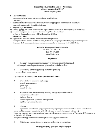 Prezentacje Kulturalne Dzieci i Młodzieży „Sarzyńska Jesień 2016” (konkurs poetycki) 1. Cele konkursu: upowszechnianie kultury żywego słowa wśród dzieci i młodzieży rozbudzanie zainteresowań literaturą wykraczającą poza kanon lektur szkolnych promocja twórczości dzieci i młodzieży 2. Organizacja konkursu: a) szkoły typują po trzech uczestników wyłonionych w drodze wewnętrznych eliminacji b) konkurs odbędzie się w sali widowiskowej Ośrodka Kultury w Nowej Sarzynie w dniu 18 Października 2016 r. od godziny 11.00 c) wypełnioną czytelnie kartę uczestnika należy przesłać do organizatora, pocztą elektroniczną, listownie (decyduje data stempla pocztowego) lub doręczyć do biura organizatora w nieprzekraczalnym terminie do 14.10.2016r. Ośrodek Kultury w Nowej Sarzynie tel./fax 017 24 11 507 lub 692476204 [email protected] Regulamin 1. Konkurs zostanie przeprowadzony w następujących kategoriach wiekowych: szkoła podstawowa, gimnazjum, szkoła średnia 2. Uczestnicy prezentują teksty literatury polskiej poetyckie i satyryczne. Łączny czas prezentacji nie może przekroczyć 6 min. 3. Uczestników konkursu zgłaszają: szkoły podstawowe gimnazja szkoły średnie 4. Jury konkursu dokona oceny według następujących kryteriów: interpretacja utworów kultura słowa dobór repertuaru (wartość artystyczna) ogólny wyraz artystyczny 5. Nagrody: zgodnie z protokołem jury, organizator przyznaje uczestnikom konkursu ufundowane przez siebie nagrody za zajęcie I, II, III miejsca w każdej kategorii wiekowej. Nagrody zostaną wręczone podczas koncertu finałowego tegorocznych Prezentacji Kulturanych w dniu 21.10. 2016r. o czym zostaną poinformowane instytucje delegujące laureatów. 6. Ostateczna interpretacja regulaminu należy do organizatora. Nie przyjmujemy zgłoszeń telefonicznych.