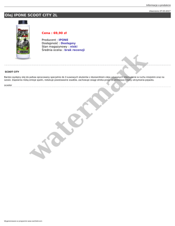 Informacje o produkcie Utworzono 07-03-2017 Olej IPONE SCOOT CITY 2L Cena : 69,90 zł er m ar k Producent : IPONE Dostępność : Dostępny Stan magazynowy : niski Średnia ocena : brak recenzji SCOOT CITY Bardzo wydajny olej do paliwa opracowany specjalnie do 2-suwowych skuterów z dozownikiem oleju używanych intensywnie w ruchu miejskim oraz na szosie. Zapewnia niską emisje spalin, redukuje powstawanie osadów, zachowuje osiągi silnika przez co zmniejsza koszty utrzymania pojazdu. w at scooter Wygenerowano w programie www.oscGold.com