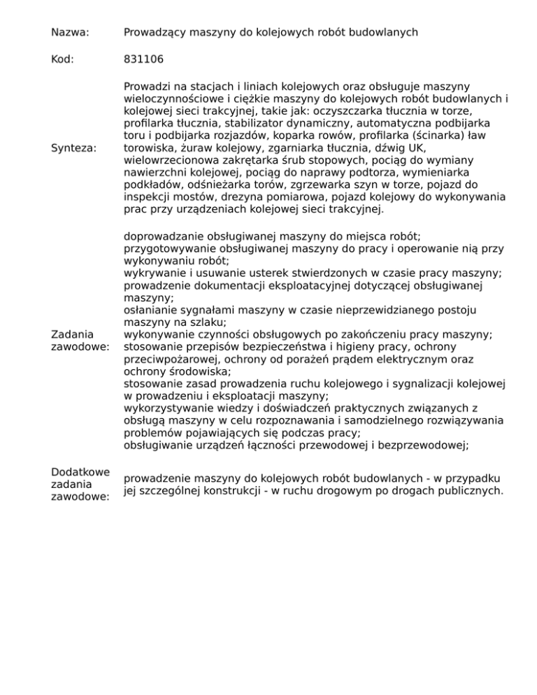 Nazwa: Prowadzący maszyny do kolejowych robót budowlanych Kod: 831106 Synteza: Prowadzi na stacjach i liniach kolejowych oraz obsługuje maszyny wieloczynnościowe i ciężkie maszyny do kolejowych robót budowlanych i kolejowej sieci trakcyjnej, takie jak: oczyszczarka tłucznia w torze, profilarka tłucznia, stabilizator dynamiczny, automatyczna podbijarka toru i podbijarka rozjazdów, koparka rowów, profilarka (ścinarka) ław torowiska, żuraw kolejowy, zgarniarka tłucznia, dźwig UK, wielowrzecionowa zakrętarka śrub stopowych, pociąg do wymiany nawierzchni kolejowej, pociąg do naprawy podtorza, wymieniarka podkładów, odśnieżarka torów, zgrzewarka szyn w torze, pojazd do inspekcji mostów, drezyna pomiarowa, pojazd kolejowy do wykonywania prac przy urządzeniach kolejowej sieci trakcyjnej. Zadania zawodowe: doprowadzanie obsługiwanej maszyny do miejsca robót; przygotowywanie obsługiwanej maszyny do pracy i operowanie nią przy wykonywaniu robót; wykrywanie i usuwanie usterek stwierdzonych w czasie pracy maszyny; prowadzenie dokumentacji eksploatacyjnej dotyczącej obsługiwanej maszyny; osłanianie sygnałami maszyny w czasie nieprzewidzianego postoju maszyny na szlaku; wykonywanie czynności obsługowych po zakończeniu pracy maszyny; stosowanie przepisów bezpieczeństwa i higieny pracy, ochrony przeciwpożarowej, ochrony od porażeń prądem elektrycznym oraz ochrony środowiska; stosowanie zasad prowadzenia ruchu kolejowego i sygnalizacji kolejowej w prowadzeniu i eksploatacji maszyny; wykorzystywanie wiedzy i doświadczeń praktycznych związanych z obsługą maszyny w celu rozpoznawania i samodzielnego rozwiązywania problemów pojawiających się podczas pracy; obsługiwanie urządzeń łączności przewodowej i bezprzewodowej; Dodatkowe zadania zawodowe: prowadzenie maszyny do kolejowych robót budowlanych - w przypadku jej szczególnej konstrukcji - w ruchu drogowym po drogach publicznych.