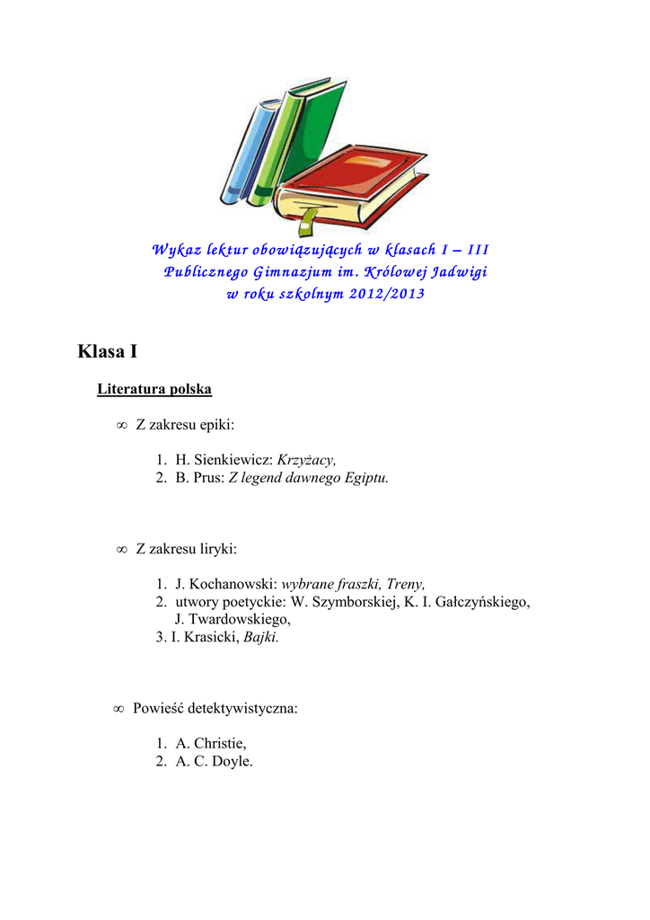 W ykaz lektur obow iązuj i zujących zuj cych w klasach I – III Publicznego G im nazjum im . K rólow ej Jadw igi w roku r oku szkolnym 2012/2013 Klasa I Literatura polska • Z zakresu epiki: 1. H. Sienkiewicz: Krzyżacy, 2. B. Prus: Z legend dawnego Egiptu. • Z zakresu liryki: 1. J. Kochanowski: wybrane fraszki, Treny, 2. utwory poetyckie: W. Szymborskiej, K. I. Gałczyńskiego, J. Twardowskiego, 3. I. Krasicki, Bajki. • Powieść detektywistyczna: 1. A. Christie, 2. A. C. Doyle. Literatura obca • Z zakresu epiki: 1. 2. 3. 4. Pieśń o Rolandzie (fragm.), Homer: Iliada (fragm.), Biblia (fragm.), Mitologia. • Z zakresu dramatu: 1. W. Szekspir: Romeo i Julia, 2. Molier: Skąpiec, Świętoszek. Klasa II Literatura polska • Z zakresu epiki: 1. 2. 3. 4. B. Prus: Kamizelka, M. Musierowicz, I. Jurgielewiczowa, A. Saint – Exupery: Mały Książę. • Z zakresu liryki: 1. utwory poetyckie: K. Wierzyńskiego, J. Twardowskiego, Cz. Miłosza, 2. A. Mickiewicz: Ballady i romanse. • Z zakresu dramatu: 1. J. Słowacki: Balladyna (fragm.), 2. A. Mickiewicz: Dziady cz. II, 3. A. Fredro: Zemsta. Literatura obca • Z zakresu epiki: 1. A. Czechow: Śmierć urzędnika, 2. Biblia (fragm.). Klasa III Literatura polska • Z zakresu epiki: 1. A. Kamiński: Kamienie na szaniec, 2. M. Białoszewski: Pamiętnik z powstania warszawskiego (fragm.). • Z zakresu liryki: 1. utwory poetyckie: W. Szymborskiej, K. I. Gałczyńskiego, J. Lechonia, K. Wierzyńskiego, J. Twardowskiego, Cz. Miłosza, T. Różewicza, M. Pawlikowskiej – Jasnorzewskiej, K. K. Baczyńskiego. Literatura obca • Z zakresu epiki: 1. Biblia (fragm.), 2. E. Hemingway: Stary człowiek przy moście.