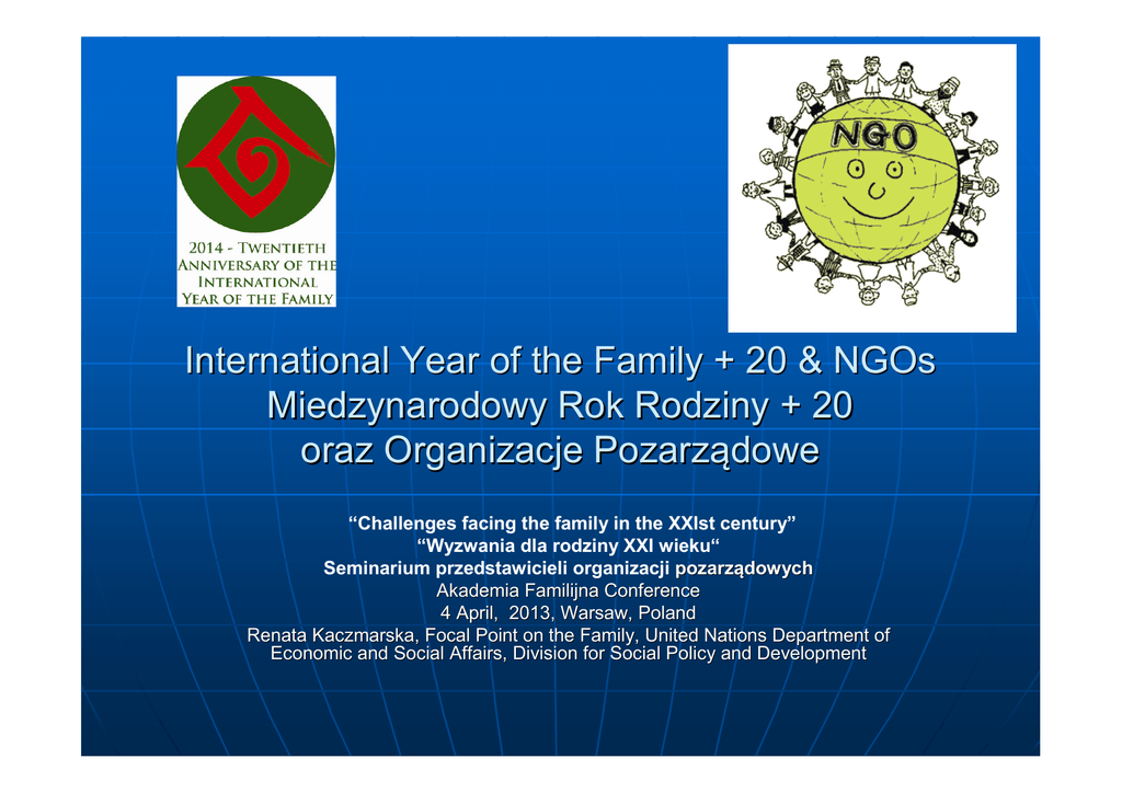International Year of the Family + 20 & NGOs Miedzynarodowy Rok Rodziny + 20 oraz Organizacje Pozarządowe “Challenges facing the family in the XXIst century” “Wyzwania dla rodziny XXI wieku“ Seminarium przedstawicieli organizacji pozarzą pozarządowych Akademia Familijna Conference 4 April, 2013, Warsaw, Poland Renata Kaczmarska, Focal Point on the Family, United Nations Department Department of Economic and Social Affairs, Division for Social Policy and Development Development International Year of the Family & its 20th anniversary logo Symbol Miedzynarodowego Roku Rodziny Guiding principles of family-oriented actions at the UN forum Główne zasady polityki prorodzinnej na forum ONZ The family is the basic unit of society and as such should be strengthened. It is entitled to receive comprehensive protection and support. Rodzina jest podstawową jednostką społeczną i jako taka zasługuje na wsparcie. Family has supporting, educating and nurturing roles & contributes to social integration and social cohesion. Family-oriented policies should support these functions rather than aiming to replace them. Rodzina pełni funkcje wspomagające, edukacyjne i opiekuńcze oraz przyczynia się do integracji społecznej. Polityka prorodzinna powinna wzmacniać te funkcje a nie je zastepować. Specific recommendations are contained in GA and CSOCD resolutions. Konkretne rekomendacje zawarte sa w rezolucjach Zgromadzenia Generalnego i Rady Ekonomiczno-Społecznej poprzez Komisje Rozwoju Społecznego. Actions to support family functions Dzialania wspomagajace funkcje rodziny Encouraging social & economic policies that are designed to meet the needs of families and their individual members, especially the most disadvantaged and vulnerable members, with particular attention to the care of children. Wdrażanie polityki ekonomicznej i społecznej przychylnej dla rodzin, szczególnie rodzin z osobami o specjalnej troski (np. osób niepełnosprawnych) oraz dzieci. Promoting mutual respect, tolerance and cooperation within the family and within society. Promowanie wzajemnego szacunku, tolerancji i kooperacji w rodzinie i w społeczeństwie. Promoting equal partnership between women and men in the family. Popieranie partnerstwa miedzy kobietami i meż me czyznami w wypełnianiu obowiazków rodzinnych/domowych. (Programme of Action of the WSSD, para. 81) Action-oriented strategy Strategia działania Twentieth anniversary is a chance to support specific efforts at national and local levels. All stakeholders are encouraged to engage in the preparatory process. Dwudziesta rocznica obchodów Roku Rodziny daje nam szanse, na połączenie wysiłkow światowych i regionalnych by wspierać działania na szczeblu krajowym i lokalnym. W tym celu agencje i instytucje systemu Narodów Zjednoczonych, komisje regionalne oraz centra badawcze i akademickie powinny zaangażować się w proces przygotowawczy. National and local programmes are supposed to support family functioning and strengthen it as an institution. Governments are encouraged to support the obesrvance of the twenteith anniversary through concrete family-oriented policies. Programy krajowe są wprowadzane, aby wspierać funkcjonowanie rodziny i wzmocnić jej siłę wewnętrzną. Rządy poszczególnych państw zachęcane są do przeprowadzenia obchodów dwudziestej rocznicy Międzynarodowego Roku Rodziny poprzez prowadzenie polityki prorodzinnej. Focal Point on the Family Program ds Rodziny To serve and assist Member States in the area of family and family policy, addressing family in an objective and culturally sensitive manner. Program ds Rodziny pomaga pań pa stwom członkowskich w dziedzinie polityki prorodzinnej. Family policy remains firmly the responsibility of national governments. Polityka prorodzinna pozostaje w gestii pań pa stw czł cz onkowskich ONZ. The three themes of the anniversary Trzy obszary tematyczne Confronting family poverty and social exclusion Walka z biedą w rodzinie oraz marginzalizacją społeczną Ensuring work-family balance Równowaga “praca-rodzina’ Advancing social integration & intergenerational solidarity within families and communities Wspieranie integracji społecznej i solidarności miedzypokoleniowej w rodzinach i społeczństwie Challenges Wyzwania In all three areas families face unprecedented challenges. Rodziny borykają borykaj się si z wyzwaniami w każ ka dej z tych dziedzin. We need better policies helping families face these challenges. Potrzebne sa lepsze rozwiazania by pomóc pom rodzinom w tych dziedzinach. Governments are not solely responsible for change, co-responsibility at local government, civil society, private sector and academic level is urgent. Rzą Rz dy nie sa jedynymi w sferze odpowiedzialnoś odpowiedzialno ci za dobrą dobr politykę polityk prorodzinną prorodzinn . Waż Wa na jest współ wsp praca na poziomie rzadó rzad w lokalnych, organizacji nierzą nierz dowych, sektora prywatnego jak i instutucji akademickich. Confronting family poverty & social exclusion Poverty eradication is a primary concern of the United Nations on its Millennium Development Goals Agenda. Walka z biedą pozostaje najważ najwa niejszym celem milenijnym. Poverty eradication should focus on families to succeed (we have examples of successful efforts of cash transfer programmes, child benefits, etc.) Walka z biedą ma wię wi ksze szanse powodzenia jeśli koncentruje się na rodzinach. Poverty & social exclusion Poverty and social exclusion are still prevalent. Walka z biedą jest priorytem dzialań ONZ. In OECD countries child poverty has not diminished despite numerous efforts and is on the rise in some countries. Nawet w krajach rozwinietych i szybko rozwijajacych się si mamy problem biedy a mimo wielu wysilkow bieda wsró wsr d dzieci nie maleje. Despite positive legislation, social exclusion of groups & individuals continues (persons with disabilities, older persons). Marginalizacja społ spo e