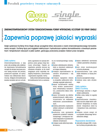 Artykuł sponsorowany Poradnik przetwórcy tworzyw sztucznych Zmiennotemperaturowy system termostatowania formy wtryskowej EcoTemp od firmy Single Zapewnia poprawę jakości wypraski Dzięki systemowi EcoTemp firma Single oferuje szczególnie łatwe wkroczenie w świat zmiennotemperaturowego termostatowania narzędzi. EcoTemp łączy pod względem elektrycznym i hydraulicznym systemy termostatowania o dowolnych parametrach i temperaturach roboczych w jeden system, generujący przerywany przepływ medium przez narzędzie. Zalety systemu Zmiennotemperaturowe, a więc przez cały przebieg cyklu selektywnie stopniowane termostatowanie narzędzi do wtrysku tworzywa przynosi szereg korzyści dla procesu, powierzchni wyprasek, ich wytrzymałości oraz efektywności ekonomicznej. Wstępnie termostatowana ścianka narzędzia jest przy wtryski- 68 PlastNews 6’2012 waniu ogrzewana do wyższej temperatury przez gorącą masę tworzywa sztucznego. Dopiero po napełnieniu gniazda zaczyna się chłodzenie narzędzia, aż do chwili osiągnięcia przez wypraskę niezbędnej temperatury uformowania i wyjmowania wypraski z formy. Zalety zmiennotemperaturowego termostatowania formy w porówna- niu do konwencjonalnego rozwiązania: dłuższe oddziaływanie ciśnienia, także w obszarach oddalonych od miejsca dolewania, mniejsze zapotrzebowanie na ciśnienie wtryskiwania i siłę zamykania, mniejsze naprężenia własne w przypadku wytłaczania natryskowego wyprasek optycznych, lepsze kształtowanie według formy struktur powierzchniowych: mikrostruktury i nanostruktury, powierzchnie lakieru fortepianowego, lepsze formowanie się efektów powierzchniowych: efekty samooczyszczania lub nadawanie właściwości przeciwodblaskowych, bardziej jednorodne rozpływanie włókien szklanych w elementach technicznych, wydłużony czas zgrzewania powierzchni przednich materiału roztopionego i zmniejszone tworzenie niespawów na powierzchni odlewów wtryskowych, mniejsze ryzyko deformacji wskutek skurczu, lepsza dokładność wymiarowa i stałość parametrów wtryskiwania, brak zmian konstrukcyjnych w formie wtryskowej, zoptymalizowany czas cyklu dzięki chłodzeniu w niższej temperaturze, znaczna oszczędność energii, redukcja czasu cyklu wtryskowego. Zalety systemu SINGLE EcoTemp Technologia zaworów o długim okresie użytkowania, krótkie czasy reakcji na sygnały sterujące, zoptymalizowana charakterystyka rozruchu dzięki dwóm ustawieniom temperatury na każdy obwód: temperatura stand by i temperatura trybu automatycznego, mniejsze zużycie energii niż w przypadku klasycznego termostatowania stałego. Wyposażenie standardowe Jednostka sterująca SBC z modułem EcoTemp lub jednostka steru- Poradnik przetwórcy tworzyw sztucznych jąca SC z kolorowym wyświetlaczem, wysokiej jakości materiały, z którego wykonano pompę oraz wyposażenie hydrauliczne, automatyczne napełnianie i dopełnianie medium w układzie, szafka rozdzielcza o rodzaju ochrony IP54. Opcje Różne złącza – analogowe i cyfrowe, pneumatyczne zawory sterujące, rozdzielacz z układem pomiaru i monitorowania przepływów jednostkowych do zamontowania na wtryskarce lub płytach montażowych narzędzi. Sposób działania systemu EcoTemp System EcoTemp steruje momentem rozruchu i zatrzymania układu przepustowości chłodziwa za pomocą uzależnionych od cyklu sygnałów wtryskarki. W fazie wtryskiwania przez narzędzie nie jest tłoczone medium termostatujące. Ciepło pochodzące z wprowadzonego tworzywa sztucznego powoduje wzrost temperatury w gnieździe. W fazie chłodzenia medium tłoczone jest przez narzędzie. Istnieje możliwość regulacji (nastawiania) temperatury medium. Dzięki przepływowi przerywanemu system EcoTemp może nawet chłodzić przy użyciu niższej temperatury medium, niż konwencjonalne urządzenie przy pomocy temperatury stałej. Testy praktyczne wykazały, że system EcoTemp optymalizuje proces termostatowania wypraski skracając czas trwania cyklu o min. 10%, przy co najmniej takiej samej jakości wypraski. System EcoTemp pracuje w sposób powtarzalny i niezawodny, jest tez łatwy w obsłudze. Termostaty do stabilizacji temperatury formy z wyposażeniem w system EcoTemp Do zastosowania w systemie EcoTemp nadają się wszystkie termostaty firmy Single. W praktyce stosowane są najczęściej lekkie i kompaktowe systemy wodne dla temperatur do 90oC lub 150oC. System EcoTemp z wkładkami matrycowymi do chłodzenia konturowego Warunkiem wstępnym optymalnej efektywności i efektywności ekonomicznej systemu EcoTemp jest zastosowanie narzędzi o korzystnych właściwościach przewodzenia ciepła, dobrym wnikaniu ciepła w gnieździe, konturowych kana- System EcoTemp może odczuwalnie skrócić czas trwania cyklu wtryskowego wypraski Temperatura narzędzia Standard EcoTemp Temperatura wyjmowania wypraski z formy Brak przepływu Czas Przepływ Standardowy czas chłodzenia 5 Skrócenie czasu cyklu Czas chłodzenia w systemie EcoTemp przez system EcoTemp 4 3 2 6 1 1 Otwieranie narzędzia 5 Utrzymywanie ciśnienia 2 Wyjmowanie wypraski 6 Otwieranie narzędzia (EcoTemp) 3 Zamykanie narzędzia 7 Otwieranie narzędzia (konwencjonalnie) 4 Wtrysk 7 łach chłodzących oraz o niewielkiej masie do termostatowania. Aby masę tę ograniczyć często termostatowane są tylko małe wsady. Za pomocą produktywnych sposobów wytwarzania takich, jak lasercusing (laserowe pokrywanie warstwą dodatkową) z proszku stalowego mogą one być tak ułożone, że tworzą zwartą strukturę z zawartymi w nich kanałami chłodzącymi blisko konturu powierzchni i znajdują się bardzo blisko podlegającej chłodzeniu ścianki narzędzia. Firma MasterColors Sp. z o.o. dysponuje dwoma termoregulatorami wodnymi o mocy grzewczej 12 kW z zakresem temp. do 150°C. Firma proponuje wykonanie prób bezpośrednio na produkcji u osób zainteresowanych technologią EcoTemp. Single oferuje szeroką paletę wysokiej jakości systemów termostatowania z wodą