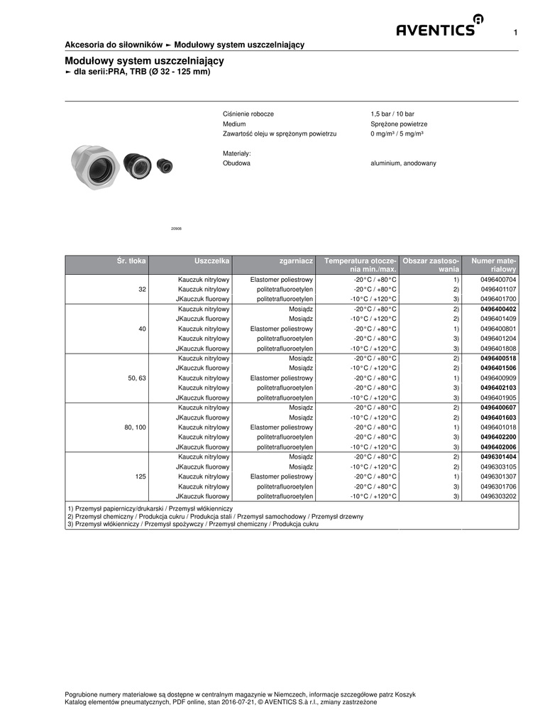 1 Akcesoria do siłowników ► Modułowy system uszczelniający Modułowy system uszczelniający ► dla serii:PRA, TRB (Ø 32 - 125 mm) Ciśnienie robocze 1,5 bar / 10 bar Medium Sprężone powietrze Zawartość oleju w sprężonym powietrzu 0 mg/m³ / 5 mg/m³ Materiały: Obudowa aluminium, anodowany 20908 Śr. tłoka 32 40 50, 63 80, 100 125 Uszczelka zgarniacz Temperatura otocze- Obszar zastosonia min./max. wania Numer materiałowy Kauczuk nitrylowy Elastomer poliestrowy -20°C / +80°C 1) Kauczuk nitrylowy politetrafluoroetylen -20°C / +80°C 2) 0496401107 JKauczuk fluorowy politetrafluoroetylen -10°C / +120°C 3) 0496401700 0496400704 Kauczuk nitrylowy Mosiądz -20°C / +80°C 2) 0496400402 JKauczuk fluorowy Mosiądz -10°C / +120°C 2) 0496401409 Kauczuk nitrylowy Elastomer poliestrowy -20°C / +80°C 1) 0496400801 Kauczuk nitrylowy politetrafluoroetylen -20°C / +80°C 3) 0496401204 JKauczuk fluorowy politetrafluoroetylen -10°C / +120°C 3) 0496401808 Kauczuk nitrylowy Mosiądz -20°C / +80°C 2) 0496400518 JKauczuk fluorowy Mosiądz -10°C / +120°C 2) 0496401506 Kauczuk nitrylowy Elastomer poliestrowy -20°C / +80°C 1) 0496400909 Kauczuk nitrylowy politetrafluoroetylen -20°C / +80°C 3) 0496402103 JKauczuk fluorowy politetrafluoroetylen -10°C / +120°C 3) 0496401905 Kauczuk nitrylowy Mosiądz -20°C / +80°C 2) 0496400607 JKauczuk fluorowy Mosiądz -10°C / +120°C 2) 0496401603 Kauczuk nitrylowy Elastomer poliestrowy -20°C / +80°C 1) 0496401018 Kauczuk nitrylowy politetrafluoroetylen -20°C / +80°C 3) 0496402200 JKauczuk fluorowy politetrafluoroetylen -10°C / +120°C 3) 0496402006 Kauczuk nitrylowy Mosiądz -20°C / +80°C 2) 0496301404 JKauczuk fluorowy Mosiądz -10°C / +120°C 2) 0496303105 Kauczuk nitrylowy Elastomer poliestrowy -20°C / +80°C 1) 0496301307 Kauczuk nitrylowy politetrafluoroetylen -20°C / +80°C 3) 0496301706 JKauczuk fluorowy politetrafluoroetylen -10°C / +120°C 3) 0496303202 1) Przemysł papierniczy/drukarski / Przemysł włókienniczy 2) Przemysł chemiczny / Produkcja cukru / Produkcja stali / Przemysł samochodowy / Przemysł drzewny 3) Przemysł włókienniczy / Przemysł spożywczy / Przemysł chemiczny / Produkcja cukru Pogrubione numery materiałowe są dostępne w centralnym magazynie w Niemczech, informacje szczegółowe patrz Koszyk Katalog elementów pneumatycznych, PDF online, stan 2016-07-21, © AVENTICS S.à r.l., zmiany zastrzeżone 2 Akcesoria do siłowników ► Modułowy system uszczelniający Modułowy system uszczelniający ► dla serii:PRA, TRB (Ø 32 - 125 mm) Dla średnicy cylindra 32 - 40 mm L SW D G B 00126410_e Dla średnicy cylindra 50 - 125 mm L SW 1) Ø D ØG B 00126410_c 1) Możliwość montażu za pomocą klucza hakowego zgodnie z DIN 1810 A Pogrubione numery materiałowe są dostępne w centralnym magazynie w Niemczech, informacje szczegółowe patrz Koszyk Katalog elementów pneumatycznych, PDF online, stan 2016-07-21, © AVENTICS S.à r.l., zmiany zastrzeżone 3 Akcesoria do siłowników ► Modułowy system uszczelniający Modułowy system uszczelniający ► dla serii:PRA, TRB (Ø 32 - 125 mm) L2 00126410_f Numer materiałowy Ø B ØD G L L2 SW 0496400704 32 6,7 24,5 M22x1 23 16,25 23 0496401107 32 6,7 24,5 M22x1 23 16,25 23 0496401700 32 6,7 24,5 M22x1 23 16,25 23 0496400402 40 9,2 34 M26x1,5 28,1 18,25 32 0496401409 40 9,2 34 M26x1,5 28,1 18,25 32 0496400801 40 9,2 34 M26x1,5 28,1 18,25 32 0496401204 40 9,2 34 M26x1,5 28,1 18,25 32 0496401808 40 9,2 34 M26x1,5 28,1 18,25 32 0496400518 50, 63 9 38,5 M33x2 33,5 25 40-42 0496401506 50, 63 9 38,5 M33x2 33,5 25 40-42 0496400909 50, 63 9 38,5 M33x2 33,5 25 40-42 0496402103 50, 63 9 38,5 M33x2 33,5 25 40-42 0496401905 50, 63 9 38,5 M33x2 33,5 25 40-42 0496400607 80, 100 10 44 M40x2 44 33 45-50 0496401603 80, 100 10 44 M40x2 44 33 45-50 0496401018 80, 100 10 44 M40x2 44 33 45-50 0496402200 80, 100 10 44 M40x2 44 33 45-50 0496402006 80, 100 10 44 M40x2 44 33 45-50 0496301404 125 12 57 M50x2 56 45 58-62 0496303105 125 12 57 M50x2 56 45 58-62 0496301307 125 12 57 M50x2 56 45 58-62 0496301706 125 12 57 M50x2 56 45 58-62 0496303202 125 12 57 M50x2 56 45 58-62 Pogrubione numery materiałowe są dostępne w centralnym magazynie w Niemczech, informacje szczegółowe patrz Koszyk Katalog elementów pneumatycznych, PDF online, stan 2016-07-21, © AVENTICS S.à r.l., zmiany zastrzeżone