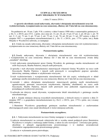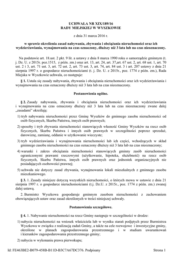 UCHWAŁA NR XIX/189/16 RADY MIEJSKIEJ W WYSZKOWIE z dnia 31 marca 2016 r. w sprawie określenia zasad nabywania, zbywania i obciążania nieruchomości oraz ich wydzierżawiania, wynajmowania na czas oznaczony, dłuższy niż 3 lata lub na czas nieoznaczony. Na podstawie art. 18.ust. 2 pkt. 9 lit. a ustawy z dnia 8 marca 1990 roku o samorządzie gminnym (t. j. Dz. U. z 2015r. poz.1515, z późn. zm.) oraz art. 13, art. 24, art. 37,art. 67 ust. 2, art. 68 ust. 1, art. 70 ust. 2 i 3, art. 71 ust. 3, art. 72 ust. 2, art. 73 ust. 3, art. 74, art. 84 ust. 3 i art. 207 ustawy z dnia 21 sierpnia 1997 r. o gospodarce nieruchomościami (t. j. Dz. U. z 2015r., poz. 1774 z późn. zm.), Rada Miejska w Wyszkowie uchwala, co następuje: § 1. Ustala się zasady nabywania, zbywania i obciążania nieruchomości oraz ich wydzierżawiania i wynajmowania na czas oznaczony dłuższy niż 3 lata lub na czas nieoznaczony. Postanowienia ogólne. § 2. Zasady nabywania, zbywania i obciążania nieruchomości oraz ich wydzierżawiania i wynajmowania na czas oznaczony dłuższy niż 3 lata lub na czas nieoznaczony zwane dalej „zasadami” określają: 1) tryb nabywania nieruchomości przez Gminę Wyszków do gminnego zasobu nieruchomości od osób fizycznych, Skarbu Państwa, innych osób prawnych; 2) sposoby i tryb zbywania nieruchomości stanowiących własność Gminy Wyszków na rzecz osób fizycznych, Skarbu Państwa i innych osób prawnych w szczególności poprzez sprzedaż, darowiznę, zamianę, oddanie w użytkowanie wieczyste; 3) tryb wydzierżawiania i wynajmowania nieruchomości lub ich części, wchodzących w skład gminnego zasobu nieruchomości na czas oznaczony dłuższy niż 3 lata lub na czas nieoznaczony; 4) warunki i zakres obciążania nieruchomości stanowiących gminny zasób nieruchomości ograniczonymi prawami rzeczowymi (użytkowanie, hipoteka, służebność) na rzecz osób fizycznych, Skarbu Państwa, innych osób prawnych oraz jednostek organizacyjnych nie posiadających osobowości prawnej; 5) uchwała nie dotyczy zasad zbywania, wynajmowania lokali mieszkalnych z gminnego zasobu mieszkaniowego. § 3. 1. Zasady niniejsze dotyczą wszystkich nieruchomości, o których mowa w ustawie z dnia 21 sierpnia 1997 r. o gospodarce nieruchomościami (t.j. Dz.U. z 2015r., poz. 1774 z późn. zm.) zwanej dalej ustawą. 2. Burmistrz Wyszkowa gospodaruje gminnym zasobem nieruchomości z zachowaniem obowiązujących ustaw oraz zasad określonych w treści niniejszej uchwały. Postanowienia szczegółowe. § 4. 1. Nabywanie nieruchomości na rzecz Gminy następuje w szczególności w drodze: 1) nabycia nieruchomości na wniosek właściciela lub w wyniku starań podjętych przez Burmistrza Wyszkowa w związku z realizacją zadań Gminy, a także na cele rozwojowe i inwestycyjne gminy, określone w planach zagospodarowania przestrzennego i w studium uwarunkowań i kierunków zagospodarowania przestrzennego gminy; 2) nabycia w wykonaniu prawa pierwokupu; Id: FE463BE2-B079-458B-B11D-B3C7A67DC376. Podpisany Strona 1 3) nabycia jako darowizny, nieodpłatnego przekazania, spadku, zapisu; 4) nabycia w drodze zamiany; 5) oddania w użytkowanie wieczyste; 6) przejęcia nieruchomości za zobowiązania dłużników wobec Gminy; 7) innych czynności prawnych (np. w szczególności w wyniku orzeczenia Sądu lub w drodze decyzji administracyjnej). 2. O nabyciu nieruchomości na rzecz Gminy decyduje Burmistrz Wyszkowa w formie zarządzenia z zastrzeżeniem § 5 ust. 3. § 5. 1. Odpłatne nabycie nieruchomości następuje po cenach średnich stosowanych w obrocie gruntami w gminie, po przeprowadzeniu negocjacji. 2. Protokół uzgodnień zawierający cenę ustaloną zgodnie z § 5 ust. 1 stanowi podstawę do zawarcia umowy notarialnej. 3. Nabywanie nieruchomości, której ustalona w wyniku negocjacji cena przekracza 500 000,00 zł wymaga zgody Rady Miejskiej w Wyszkowie. 4. Zgoda, o której mowa w ust. 3 nie jest wymagana jeżeli nabycie nieruchomości następuje w wykonaniu prawa pierwokupu lub darowizny. § 6. Burmistrz Wyszkowa przeznacza nieruchomości do zbycia w drodze zarządzenia, stosując tryb przetargowy z uwzględnieniem pierwszeństwa przysługującego z ustawy z zastrzeżeniem §10. § 7. W trybie bezprzetargowym nieruchomości mogą być zbywane w wypadkach określonych w ustawie i przepisach szczególnych. § 8. Przy sprzedaży nieruchomości w drodze przetargu stosuje się następujące zasady ustalania cen: 1) cenę wywoławczą w pierwszym przetargu ustala się w wysokości nie niższej niż wartość nieruchomości, określona przez rzeczoznawcę majątkowego; 2) do ceny ustalonej zgodnie z pkt.1 dolicza się koszty poniesione przez gminę na przygotowanie nieruchomości do zbycia; 3) cena wywoławcza w drugim przetargu może być obniżona do 50% ceny wywoławczej pierwszego przetargu; 4) nieruchomości nie zbyte w drugim przetargu mogą być zbyte w drodze rokowań za cenę ustaloną w tych rokowaniach, nie niższą jednak niż 40 % wartości nieruchomości lub mogą być przeznaczane do kolejnych przetargów. § 9. W trybie bezprzetargowym nieruchomości zbywa się za cenę ustaloną w wyniku negocjacji, jednakże nie niższą od ich wartości ustalonej przez rzeczoznawcę majątkowego, chyba że zastosowano bonifikatę przewidzianą przepisami prawa. § 10. 1. Sprzedaż lub oddanie w użytkowanie wieczyste nieruchomości, której wartość rynkowa oszacowana przez rzeczoznawcę majątkowego przekracza kwotę 150 000,00 zł wymaga zgody Rady Miejskiej w Wyszkowie. 2. Zbycie w trybie zamiany nieruchomości gminnej lub przyznanie nieruchomości zamiennej, której wartość przekracza kwotę 200 000,00 zł wymaga zgody Rady Miejskiej w Wyszkowie. 3. Nie stosuje się ust.1 przy przekazywaniu na własność lub w użytkowanie wieczyste nieruchomości osobom prawnym lub fizycznym, którym przysługuje roszczenie o ustanowienie prawa własności lub prawa użytkowania wieczystego wynikające z od