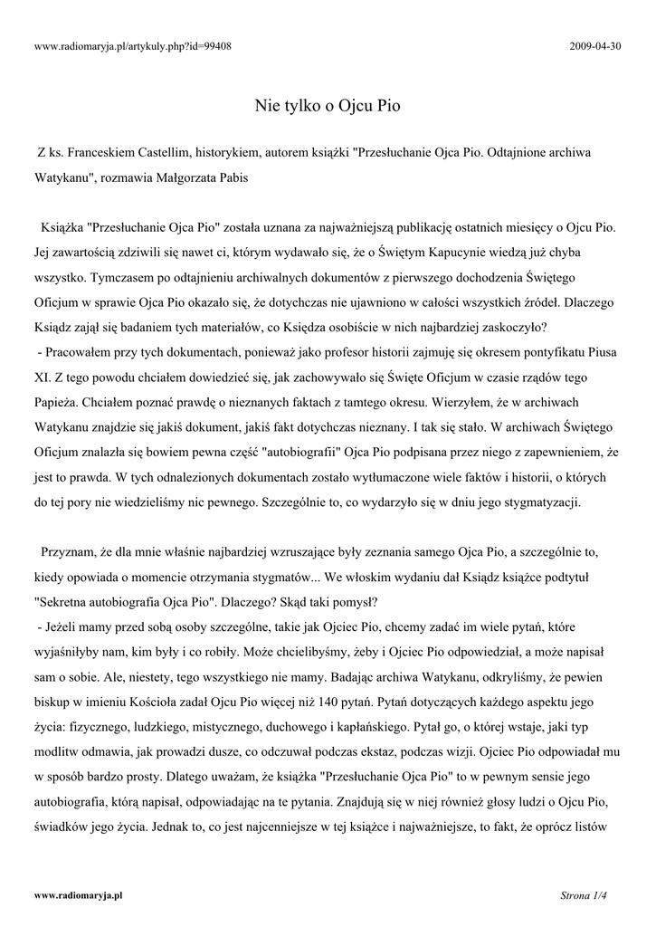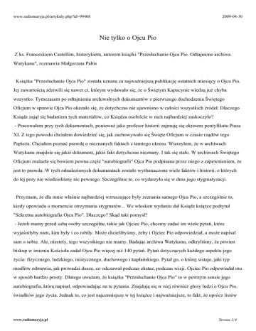www.radiomaryja.pl/artykuly.php?id=99408 2009-04-30 Nie tylko o Ojcu Pio Z ks. Franceskiem Castellim, historykiem, autorem książki "Przesłuchanie Ojca Pio. Odtajnione archiwa Watykanu", rozmawia Małgorzata Pabis Książka "Przesłuchanie Ojca Pio" została uznana za najważniejszą publikację ostatnich miesięcy o Ojcu Pio. Jej zawartością zdziwili się nawet ci, którym wydawało się, że o Świętym Kapucynie wiedzą już chyba wszystko. Tymczasem po odtajnieniu archiwalnych dokumentów z pierwszego dochodzenia Świętego Oficjum w sprawie Ojca Pio okazało się, że dotychczas nie ujawniono w całości wszystkich źródeł. Dlaczego Ksiądz zajął się badaniem tych materiałów, co Księdza osobiście w nich najbardziej zaskoczyło? - Pracowałem przy tych dokumentach, ponieważ jako profesor historii zajmuję się okresem pontyfikatu Piusa XI. Z tego powodu chciałem dowiedzieć się, jak zachowywało się Święte Oficjum w czasie rządów tego Papieża. Chciałem poznać prawdę o nieznanych faktach z tamtego okresu. Wierzyłem, że w archiwach Watykanu znajdzie się jakiś dokument, jakiś fakt dotychczas nieznany. I tak się stało. W archiwach Świętego Oficjum znalazła się bowiem pewna część "autobiografii" Ojca Pio podpisana przez niego z zapewnieniem, że jest to prawda. W tych odnalezionych dokumentach zostało wytłumaczone wiele faktów i historii, o których do tej pory nie wiedzieliśmy nic pewnego. Szczególnie to, co wydarzyło się w dniu jego stygmatyzacji. Przyznam, że dla mnie właśnie najbardziej wzruszające były zeznania samego Ojca Pio, a szczególnie to, kiedy opowiada o momencie otrzymania stygmatów... We włoskim wydaniu dał Ksiądz książce podtytuł "Sekretna autobiografia Ojca Pio". Dlaczego? Skąd taki pomysł? - Jeżeli mamy przed sobą osoby szczególne, takie jak Ojciec Pio, chcemy zadać im wiele pytań, które wyjaśniłyby nam, kim były i co robiły. Może chcielibyśmy, żeby i Ojciec Pio odpowiedział, a może napisał sam o sobie. Ale, niestety, tego wszystkiego nie mamy. Badając archiwa Watykanu, odkryliśmy, że pewien biskup w imieniu Kościoła zadał Ojcu Pio więcej niż 140 pytań. Pytań dotyczących każdego aspektu jego życia: fizycznego, ludzkiego, mistycznego, duchowego i kapłańskiego. Pytał go, o której wstaje, jaki typ modlitw odmawia, jak prowadzi dusze, co odczuwał podczas ekstaz, podczas wizji. Ojciec Pio odpowiadał mu w sposób bardzo prosty. Dlatego uważam, że książka "Przesłuchanie Ojca Pio" to w pewnym sensie jego autobiografia, którą napisał, odpowiadając na te pytania. Znajdują się w niej również głosy ludzi o Ojcu Pio, świadków jego życia. Jednak to, co jest najcenniejsze w tej książce i najważniejsze, to fakt, że oprócz listów www.radiomaryja.pl Strona 1/4 Ojca Pio mamy przed sobą pewne źródło o Stygmatyku z Gargano pisane przez niego samego. Tłumacz polskiego wydania książki Edward Augustyn powiedział, że książka "Przesłuchanie Ojca Pio" to czysty kryształ, wolny od jakiejkolwiek naleciałości, nieskażony żadnymi kłótniami, dyskusjami, polemikami, że jest to dokument najbardziej obiektywny i wiarygodny. Jak Ksiądz odniesie się do tego poglądu? - Dla mnie bardzo ważne jest to, że biskup Raffaello Carlo Rossi dokonywał owego przesłuchania bardzo wiarygodnie. Mówił sam o sobie, że przyjechał do San Giovanni Rotondo z pewnymi uprzedzeniami. Taka wypowiedź czyni go wiarygodnym, pokazuje, że jego nastawienie względem Stygmatyka nie było entuzjastyczne. Z tego powodu pytania, które zadawał, były dość skrupulatne i szczegółowe. Wydaje mi się więc, że jego przesłuchanie jest miarodajne i wiarygodne. Biskup chciał sam dotrzeć do prawdy. Na koniec zobaczył, że oskarżenia, które wysuwano wobec Ojca Pio, były bezpodstawne. Zrozumiał to nie tylko na podstawie odpowiedzi Ojca Pio, ale zrobił weryfikację, można powiedzieć "skrzyżowaną", biorąc pod uwagę zeznania Ojca Pio, jego braci i obserwując sam całą historię i rzeczywistość. Pytał innych, obserwował rzeczywistość, środowisko, studiował drobne detale, żeby zrozumieć, czy to, co Ojciec Pio zeznawał, było prawdą. Z tego powodu przesłuchanie jest bardzo pewne i przeprowadzone w sposób szczegółowy. Z dużą uwagą. Proszę zatem krótko powiedzieć naszym Czytelnikom, co każdy, kto weźmie tę publikację do ręki, znajdzie w niej, czego się nauczy? Czy bliższa stanie się nam postać Ojca Pio? - Wszyscy, którzy wezmą do ręki książkę o Ojcu Pio, nawet osoby, które już go znają, mogą znaleźć w niej całościową, kompletną i szczegółową wizję osoby Stygmatyka. Jednocześnie ta wizja jest bardzo syntetyczna, w skrócie można powiedzieć: w 140 odpowiedziach Ojciec Pio mówi o sobie samym. Znajdziemy w niej także pewne vademecum, czyli przewodnik o tym, kim był Ojciec Pio i jaka była jego misja, czyli to, czego możemy się nauczyć od niego samego. Osobiście mnie poruszyły odpowiedzi, w których Ojciec Pio mówił sam o sobie.Warto podkreślić, że Stygmatyk, odpowiadając na jedno z pytań, mówi, że chce zawsze być posłuszny Kościołowi, ponieważ przez Kościół mówi do niego sam Bóg. Wierzę, że z tego stwierdzenia możemy nauczyć się być uczniami Kościoła, także uczniami św. Ojca Pio. Nie tylko w sposób sentymentalny, uczuciowy, ale także ze szczerością i z wiernością naszego serca.I druga rzecz, która mnie dotknęła. Ojciec Pio przypomina nam, że w drodze, kiedy pielgrzymujemy w życiu, nie jesteśmy sami. Istnieje duża rodzina świętych, która nam towarzyszy, uprzedza nas, idzie przed nami w kierunku Pana Boga. W ostatnim czasie odkrył Ksiądz i opublikował opatrzony historycznym komentarzem list ks. bp. Karola Wojtyły do Ojca Pio z Pietrelciny. Na temat kontaktów tych dwóch świętych istniało wiele przypuszczeń, www.radiomaryja.pl Strona 2/4 domysłów. Czy może Ksiądz opowiedzieć n