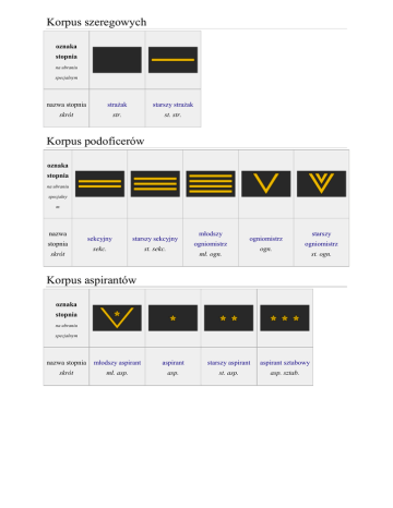 Korpus szeregowych oznaka stopnia na ubraniu specjalnym nazwa stopnia strażak starszy strażak skrót str. st. str. Korpus podoficerów oznaka stopnia na ubraniu specjalny m nazwa stopnia skrót sekcyjny starszy sekcyjny sekc. st. sekc. młodszy ogniomistrz ogniomistrz mł. ogn. ogn. starszy ogniomistrz Korpus aspirantów oznaka stopnia na ubraniu specjalnym nazwa stopnia młodszy aspirant aspirant starszy aspirant aspirant sztabowy skrót mł. asp. asp. st. asp. asp. sztab. st. ogn. Korpus oficerów oznaka stopnia na ubraniu specjalnym nazwa stopnia młodszy kapitan kapitan starszy kapitan skrót mł. kpt. kpt. st. kpt. brygadier starszy brygadier mł. bryg. bryg. st. bryg. nazwa stopnia nadbrygadier generał brygadier skrót nadbryg. gen. brygadier oznaka stopnia na ubraniu specjalnym nazwa stopnia młodszy brygadier skrót oznaka stopnia na ubraniu specjalnym Źródła Ustawa z dnia 24 sierpnia 1991 r. o Państwowej Straży Pożarnej, Dz. U. z 1991 r. Nr 88, poz. 400 Rozporządzenie Ministra Spraw Wewnętrznych i Administracji z dnia 30 listopada 2005 r. w sprawie umundurowania strażaków Państwowej Straży Pożarnej Dz. U. z 2006 r. Nr 4, poz. 25 Źródło: pl.wikipedia.org