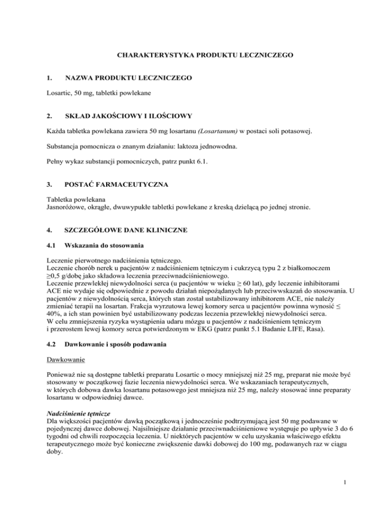 CHARAKTERYSTYKA PRODUKTU LECZNICZEGO 1. NAZWA PRODUKTU LECZNICZEGO Losartic, 50 mg, tabletki powlekane 2. SKŁAD JAKOŚCIOWY I ILOŚCIOWY Każda tabletka powlekana zawiera 50 mg losartanu (Losartanum) w postaci soli potasowej. Substancja pomocnicza o znanym działaniu: laktoza jednowodna. Pełny wykaz substancji pomocniczych, patrz punkt 6.1. 3. POSTAĆ FARMACEUTYCZNA Tabletka powlekana Jasnoróżowe, okrągłe, dwuwypukłe tabletki powlekane z kreską dzielącą po jednej stronie. 4. SZCZEGÓŁOWE DANE KLINICZNE 4.1 Wskazania do stosowania Leczenie pierwotnego nadciśnienia tętniczego. Leczenie chorób nerek u pacjentów z nadciśnieniem tętniczym i cukrzycą typu 2 z białkomoczem ≥0,5 g/dobę jako składowa leczenia przeciwnadciśnieniowego. Leczenie przewlekłej niewydolności serca (u pacjentów w wieku ≥ 60 lat), gdy leczenie inhibitorami ACE nie wydaje się odpowiednie z powodu działań niepożądanych lub przeciwwskazań do stosowania. U pacjentów z niewydolnością serca, których stan został ustabilizowany inhibitorem ACE, nie należy zmieniać terapii na losartan. Frakcja wyrzutowa lewej komory serca u pacjentów powinna wynosić ≤ 40%, a ich stan powinien być ustabilizowany podczas leczenia przewlekłej niewydolności serca. W celu zmniejszenia ryzyka wystąpienia udaru mózgu u pacjentów z nadciśnieniem tętniczym i przerostem lewej komory serca potwierdzonym w EKG (patrz punkt 5.1 Badanie LIFE, Rasa). 4.2 Dawkowanie i sposób podawania Dawkowanie Ponieważ nie są dostępne tabletki preparatu Losartic o mocy mniejszej niż 25 mg, preparat nie może być stosowany w początkowej fazie leczenia niewydolności serca. We wskazaniach terapeutycznych, w których dobowa dawka losartanu potasowego jest mniejsza niż 25 mg, należy stosować inne preparaty losartanu w odpowiedniej dawce. Nadciśnienie tętnicze Dla większości pacjentów dawką początkową i jednocześnie podtrzymującą jest 50 mg podawane w pojedynczej dawce dobowej. Najsilniejsze działanie przeciwnadciśnieniowe występuje po upływie 3 do 6 tygodni od chwili rozpoczęcia leczenia. U niektórych pacjentów w celu uzyskania właściwego efektu terapeutycznego może być konieczne zwiększenie dawki dobowej do 100 mg, podawanych raz w ciągu doby. 1 Losartan może być stosowany w skojarzeniu z innymi lekami przeciwnadciśnieniowymi, zwłaszcza z lekami moczopędnymi (np. hydrochlorotiazydem). Pacjenci z nadciśnieniem tętniczym i cukrzycą typu 2 z białkomoczem ≥ 0,5 g/dobę Zwykle stosowana dawka początkowa wynosi 50 mg raz na dobę. Dawkę tę można zwiększyć do 100 mg raz na dobę, w zależności od wartości ciśnienia tętniczego krwi, po pierwszym miesiącu od rozpoczęcia leczenia. Losartan można stosować jednocześnie z innymi lekami przeciwnadciśnieniowymi (np. lekami moczopędnymi, antagonistami wapnia, alfa lub beta-adrenolitykami oraz lekami działającymi ośrodkowo), a także z insuliną i innymi często stosowanymi lekami o działaniu hipoglikemizującym (np. pochodnymi sulfonylomocznika, glitazonami i inhibitorami glukozydazy). Niewydolność serca Zwykle dawka początkowa u pacjentów z niewydolnością serca wynosi 12,5 mg raz na dobę. Ponieważ nie są dostępne tabletki preparatu Losartic o takiej mocy, leczenie należy rozpoczynać stosując inny preparat. Dawkę tę należy zwiększać stopniowo, w odstępach tygodniowych (tj. 12,5 mg na dobę, 25 mg na dobę, 50 mg na dobę), aż do osiągnięcia skutecznej dawki podtrzymującej, wynoszącej zwykle 50 mg raz na dobę, jeśli jest ona dobrze tolerowana przez pacjenta. Zmniejszenie ryzyka wystąpienia udaru mózgu u pacjentów z nadciśnieniem tętniczym i przerostem lewej komory serca potwierdzonym w EKG Zwykle stosowana dawka początkowa produktu leczniczego Losartic wynosi 50 mg raz na dobę. W zależności od zmian ciśnienia tętniczego można dodać hydrochlorotiazyd w małej dawce i (lub) zwiększyć dawkę produktu leczniczego Losartic do 100 mg raz na dobę. Pacjenci w podeszłym wieku Chociaż u pacjentów w wieku powyżej 75 lat należy rozważyć rozpoczęcie leczenia od dawki 25 mg, dostosowanie dawkowania u osób w wieku podeszłym nie jest zazwyczaj konieczne. Dzieci Istnieją ograniczone dane dotyczące skuteczności i bezpieczeństwa stosowania losartanu w leczeniu nadciśnienia u dzieci i młodzieży w wieku od 6 do 16 lat (patrz punkt 5.1: Właściwości farmakodynamiczne). Dostępne są ograniczone dane farmakokinetyczne dotyczące dzieci z nadciśnieniem w wieku powyżej jednego miesiąca życia (patrz punkt 5.2: Właściwości farmakokinetyczne). Dla pacjentów o masie ciała > 20 kg do < 50 kg, którzy potrafią połykać tabletki, zalecana dawka wynosi 25 mg raz na dobę. W wyjątkowych przypadkach dawkę można zwiększyć maksymalnie do 50 mg raz na dobę. Dawkowanie należy dostosować zgodnie z reakcją dotyczącą zmiany ciśnienia tętniczego krwi. U pacjentów o masie ciała > 50 kg zwykle stosowana dawka wynosi 50 mg raz na dobę. W wyjątkowych przypadkach dawkę można zwiększyć maksymalnie do 100 mg raz na dobę. Nie przeprowadzono badań dotyczących stosowania u dzieci dawek powyżej 1,4 mg/kg mc. (lub ponad 100 mg) na dobę. Losartan nie jest zalecany do stosowania u dzieci w wieku poniżej 6 lat, ponieważ dostępne są ograniczone dane dotyczące stosowania w tych grupach pacjentów. Ze względu na brak danych, losartan nie jest zalecany do stosowania u dzieci, u których szybkość przesączania kłębkowego wynosi < 30 ml/min/1,73 m2 (patrz też punkt 4.4). Losartan nie jest również zalecany do stosowania u dzieci z zaburzeniami czynności wątroby (patrz też punkt 4.4). Pacjenci z zaburzeniami czynności nerek i pacjenci hemodializowani Nie ma konieczności zmiany dawkowania w przypadku pacjentów z niewydolnością nerek i pacjentów hemodializowanych. 2 Pacjenci ze zmniejszoną objętością krwi krążącej U pacjentów ze zmniejszoną objętością krwi krążące