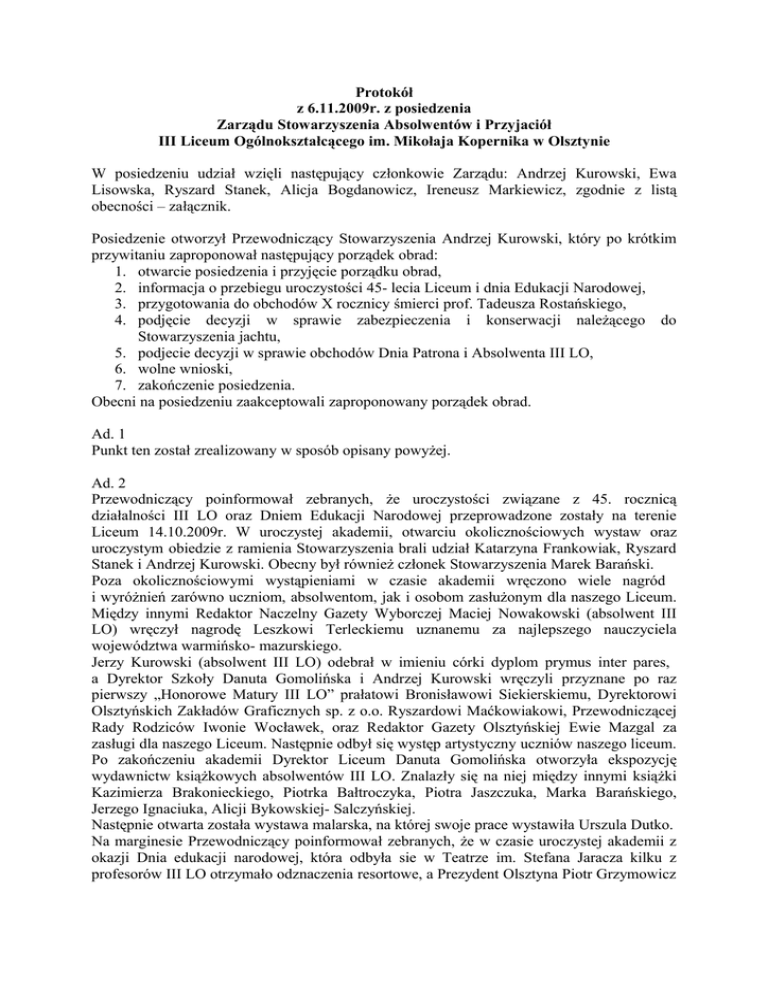 Protokół z 6.11.2009r. z posiedzenia Zarządu Stowarzyszenia Absolwentów i Przyjaciół III Liceum Ogólnokształcącego im. Mikołaja Kopernika w Olsztynie W posiedzeniu udział wzięli następujący członkowie Zarządu: Andrzej Kurowski, Ewa Lisowska, Ryszard Stanek, Alicja Bogdanowicz, Ireneusz Markiewicz, zgodnie z listą obecności – załącznik. Posiedzenie otworzył Przewodniczący Stowarzyszenia Andrzej Kurowski, który po krótkim przywitaniu zaproponował następujący porządek obrad: 1. otwarcie posiedzenia i przyjęcie porządku obrad, 2. informacja o przebiegu uroczystości 45- lecia Liceum i dnia Edukacji Narodowej, 3. przygotowania do obchodów X rocznicy śmierci prof. Tadeusza Rostańskiego, 4. podjęcie decyzji w sprawie zabezpieczenia i konserwacji należącego do Stowarzyszenia jachtu, 5. podjecie decyzji w sprawie obchodów Dnia Patrona i Absolwenta III LO, 6. wolne wnioski, 7. zakończenie posiedzenia. Obecni na posiedzeniu zaakceptowali zaproponowany porządek obrad. Ad. 1 Punkt ten został zrealizowany w sposób opisany powyżej. Ad. 2 Przewodniczący poinformował zebranych, że uroczystości związane z 45. rocznicą działalności III LO oraz Dniem Edukacji Narodowej przeprowadzone zostały na terenie Liceum 14.10.2009r. W uroczystej akademii, otwarciu okolicznościowych wystaw oraz uroczystym obiedzie z ramienia Stowarzyszenia brali udział Katarzyna Frankowiak, Ryszard Stanek i Andrzej Kurowski. Obecny był również członek Stowarzyszenia Marek Barański. Poza okolicznościowymi wystąpieniami w czasie akademii wręczono wiele nagród i wyróżnień zarówno uczniom, absolwentom, jak i osobom zasłużonym dla naszego Liceum. Między innymi Redaktor Naczelny Gazety Wyborczej Maciej Nowakowski (absolwent III LO) wręczył nagrodę Leszkowi Terleckiemu uznanemu za najlepszego nauczyciela województwa warmińsko- mazurskiego. Jerzy Kurowski (absolwent III LO) odebrał w imieniu córki dyplom prymus inter pares, a Dyrektor Szkoły Danuta Gomolińska i Andrzej Kurowski wręczyli przyznane po raz pierwszy „Honorowe Matury III LO” prałatowi Bronisławowi Siekierskiemu, Dyrektorowi Olsztyńskich Zakładów Graficznych sp. z o.o. Ryszardowi Maćkowiakowi, Przewodniczącej Rady Rodziców Iwonie Wocławek, oraz Redaktor Gazety Olsztyńskiej Ewie Mazgal za zasługi dla naszego Liceum. Następnie odbył się występ artystyczny uczniów naszego liceum. Po zakończeniu akademii Dyrektor Liceum Danuta Gomolińska otworzyła ekspozycję wydawnictw książkowych absolwentów III LO. Znalazły się na niej między innymi książki Kazimierza Brakonieckiego, Piotrka Bałtroczyka, Piotra Jaszczuka, Marka Barańskiego, Jerzego Ignaciuka, Alicji Bykowskiej- Salczyńskiej. Następnie otwarta została wystawa malarska, na której swoje prace wystawiła Urszula Dutko. Na marginesie Przewodniczący poinformował zebranych, że w czasie uroczystej akademii z okazji Dnia edukacji narodowej, która odbyła sie w Teatrze im. Stefana Jaracza kilku z profesorów III LO otrzymało odznaczenia resortowe, a Prezydent Olsztyna Piotr Grzymowicz w swoim wystąpieniu z nazwy wymienił wyłącznie III LO wychwalając program artystyczny, jaki zaprezentowano w przeddzień święta w Ratuszu. Ad.3 W związku z X rocznicą śmierci Prof. Tadeusza Rostańskiego Zarząd postanowił, że w bieżącym roku złożenie hołdu zmarłym profesorom III LO będzie miało wyjątkowo uroczysty charakter. Postanowiono zakupić okolicznościowa wiązankę, która zostanie złożona na grobie Profesora 11.11.2009r. o 14,30. Zarząd zaprasza wszystkich zainteresowanych do udziału w uroczystości. Ad. 4 Zarząd postanowił, że Ryszard Stanek, Katarzyna Frankowiak i Andrzej Kurowski złożą wizytę na Przystani „Bryza”, gdzie zakotwiczony jest jacht „Trójka” należący do Stowarzyszenia. Należy przeprowadzić prace konserwatorskie oraz zabezpieczyć jacht przed zimą. Wydelegowane osoby powinny uregulować należność za opiekę nad jachtem oraz dołożyć starań, aby został on w sposób należyty przygotowany do „zimowania”. Ad. 5 Zarząd postanowił, że podobnie, jak w latach poprzednich wraz z Dyrekcją Liceum, przeprowadzi dzień Patrona w czasie, którego absolwenci reprezentujący różne profesje spotkają się z uczniami zainteresowanymi wyborem przyszłego zawodu. Stowarzyszenie rozważy możliwość przekazania szkole kolejnego daru zgodnego z potrzebami dydaktycznymi Liceum. Zorganizowany zostanie również Bal Absolwenta. Najprawdopodobniej odbędzie się on w jednym z lokali na terenie Kortowa w dniu 20.02.2010r. Informacja o warunkach uczestnictwa opublikowana zostanie w kolejnym protokole z posiedzenia Zarządu. Ad. 6-7 W wolnych wnioskach zaproponowano, aby kolejne zebranie odbyło się 11.12., a nie jak to wynika z przyjętego zwyczaju 04.12. Ustalono, że zebranie to (11.12.2009r.) zostanie zorganizowane w formie wigilii, a poczęstunek przygotowany zostanie przez wszystkich uczestników. Na tym posiedzenie zostało zakończone. Przewodniczący Andrzej Kurowski Wiceprzewodniczący Ewa Lisowska Skarbik Alicja Bogdanowicz Członkowie Ireneusz Markiewicz Załączniki: Lista obecności Ryszard Stanek