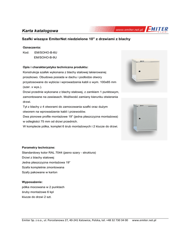Karta katalogowa Szafki wiszące EmiterNet niedzielone 10'' z drzwiami z blachy Oznaczenia: Kod: EM/SOHO-B-6U EM/SOHO-B-9U Opis i charakterystyka techniczna produktu: Konstrukcja szafek wykonana z blachy stalowej lakierowanej proszkowo. Obudowa posiada w dachu i podłodze otwory przystosowane do wybicia i wprowadzenia kabli o wym. 100x65 mm (szer. x wys.). Drzwi przednie wykonane z blachy stalowej, z zamkiem 1 punktowym, zamontowane na zawiasach. MoŜliwość zamiany kierunku otwierania drzwi. Tył z blachy z 4 otworami do zamocowania szafki oraz duŜym otworem na wprowadzenie kabli i przewodów. Dwa pionowe profile montaŜowe 19” (jedna płaszczyzna montaŜowa) w odległości 75 mm od drzwi przednich. W komplecie półka, komplet 6 śrub montaŜowych i 2 klucze do drzwi. Parametry techniczne: Standardowy kolor RAL 7044 (jasno szary - struktura) Drzwi z blachy stalowej Jedna płaszczyzna montaŜowa 19” Szafa kompletnie zmontowana Szafy pakowane w karton WyposaŜenie: półka mocowana w 2 punktach śruby montaŜowe 6 kpl klucze do drzwi 2 szt. Emiter Sp. z o.o., ul. Porcelanowa 27, 40-241 Katowice, Polska, tel. +48 32 730 34 00 www.emiter.net.pl Karta katalogowa WYMIARY KOD wysoko ść szerokość [mm] głębokość [mm] wysokość [mm] nośność [kg] masa [kg] EM/SOHO-B-6U 6U 325 300 310 20 7 EM/SOHO-B-9U 9U 325 330 445 20 10 KOD otwory montaŜowe otwory montaŜowe odstęp szerokość [mm] odstęp wysokość [mm] rozmiar otworu na tylnej ścianie szer. x wys. [mm] EM/SOHO-B-6U 220 195 185x270 EM/SOHO-B-9U 220 285 180x400 DołoŜyliśmy wszelkich starań, aby przedstawione informacje były rzetelne i kompletne. Jednak nie ponosimy odpowiedzialności za dokładność i kompletność danych oraz w szczególności nie moŜemy zagwarantować, Ŝe niniejsza specyfikacja nie zawiera błędów lub pomyłek. Informacje zawarte w niniejszej specyfikacji mogą zostać zmienione w kaŜdej chwili bez powiadomienia. Emiter Sp. z o.o., ul. Porcelanowa 27, 40-241 Katowice, Polska, tel. +48 32 730 34 00 www.emiter.net.pl