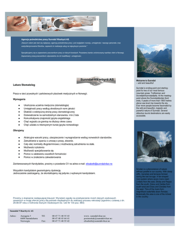 Agencja pośrednictwa pracy Sunndal Vikarbyrå AS. „Naszym celem jest stać się najlepszą agencją pośrednictwa pracy pod względem rozwoju, umiejętności naszego personelu oraz usatysfakcjonowanie Klientów, zapewnić im realizacje usług na najwyższym poziomie." Specjalizujemy się w zapewnieniu pracownikom pracy w różnych branżach. Posiadamy bardzo zróżnicowany wachlarz ofert w Norwegi. Zapewniamy pracę pracownikom odpowiednio do ich kwalifikacji i umiejętności. Welcome to Sunndal – wild and beautiful! Lekarz Stomatolog Praca w sieci prywatnych i państwowych placówek medycznych w Norwegii. Wymagania Ukończona uczelnia medyczna (stomatologia) Umiejętność pracy według określonych norm jakości Dbałość o estetyczną stronę pracy stomatologicznej Doświadczenie na samodzielnym stanowisku: min 2 lata Komunikatywna znajomość języka angielskiego Chęć wyjazdu za granicę na dłuższy okres czasu Chęć udziału w intensywnym kursie języka norweskiego Sunndal is ending-point and startingpoint for two of our most famous mountain areas: Trollheimen and Dovrefjell/Sunndalsfjella. At the meetingpoint where the Sunndalsfjorden fjord ends, 5 peaks of more than 1800 metres above sea level rise towards the sky. Ever more people become fascinated by the wild and beautiful, majestic and powerful nature of Sunndal. Several attractive tourist destinations are easily accessible. Oferujemy Atrakcyjne warunki pracy, ubezpieczenie i wynagrodzenie według norweskich standardów. Zatrudnienie w oparciu o umowę o pracę, zlecenie. Cały etat, kontrakty długoterminowe z możliwością zatrudnienia na stałe. Możliwości szkolenia Możliwość specjalizowania się Pomoc w załatwieniu wszelkich formalności Pomoc w znalezieniu zakwaterowania Zainteresowanych Kandydatów, prosimy o przesłanie CV na adres e-mail: [email protected] Wszystkim kandydatom gwarantujemy dyskrecję. Jednocześnie zastrzegamy, że skontaktujemy się jedynie z wybranymi kandydatami. Prosimy o dopisanie następującej klauzuli: Wyrażam zgodę na przetwarzanie moich danych osobowych zawartych w mojej ofercie pracy dla potrzeb niezbędnych do realizacji procesu rekrutacji (zgodnie z ustawą z dn. 29.08.97 roku o Ochronie Danych Osobowych Dz. Ust Nr 133 poz. 883) Sunndal Vikarbyrå AS Adres: Auragata 3 6600 Sunndalsøra Norwegia Tlf: Fax: 00 47 71 40 55 43 00 47 40 45 64 41 00 47 71 40 55 42 www. sunndalvikar.no [email protected] [email protected] Åmotan is a phenomenon of nature without parallel in our country. With steep cliffs, moraines and terraces formed during the last ice-age. A fan-shaped river-system where seven rivers meet: Lindøla from the east, Skiråa and Reppa from the south, Grøvu and Geitåa from south-west and Svøu and Grødøla from the west. Thre of the rivers form magnificent waterfalls down Åmotan. Botanically the area is one of the richest in the country.